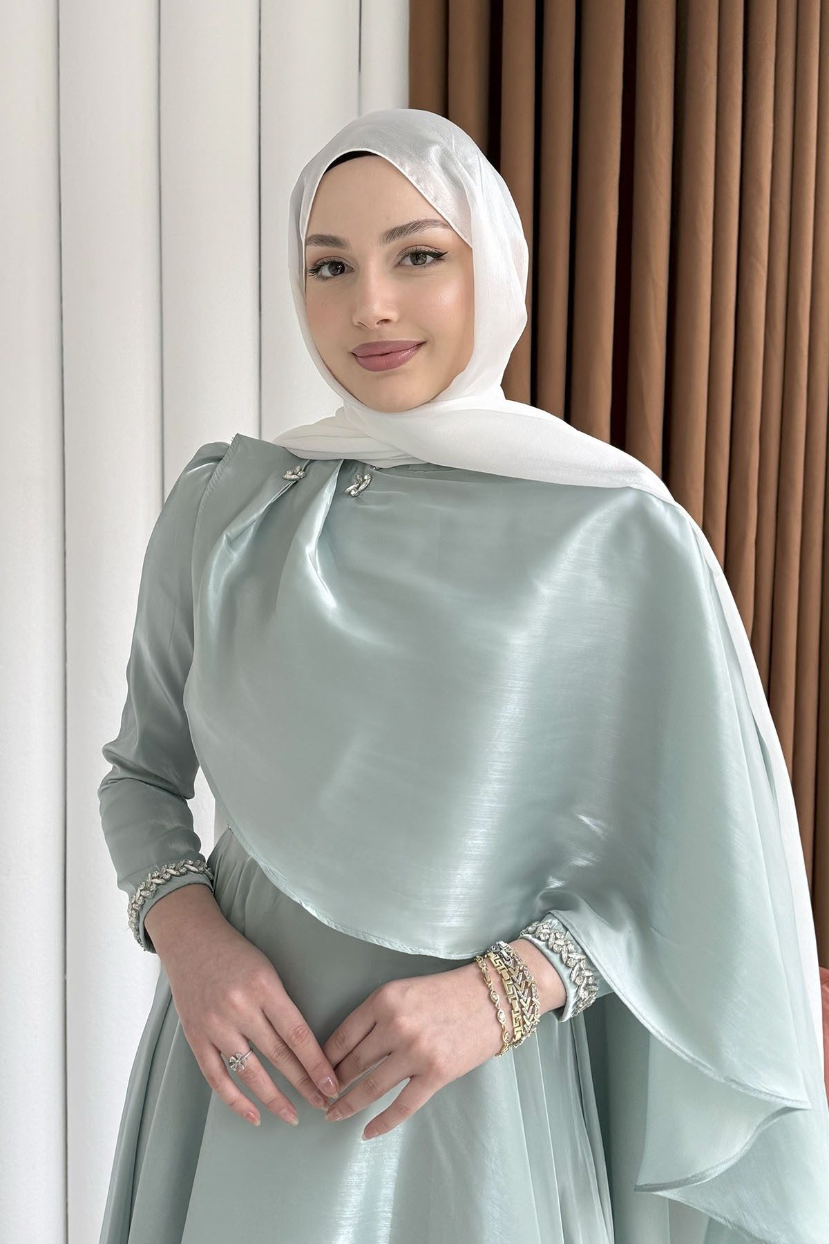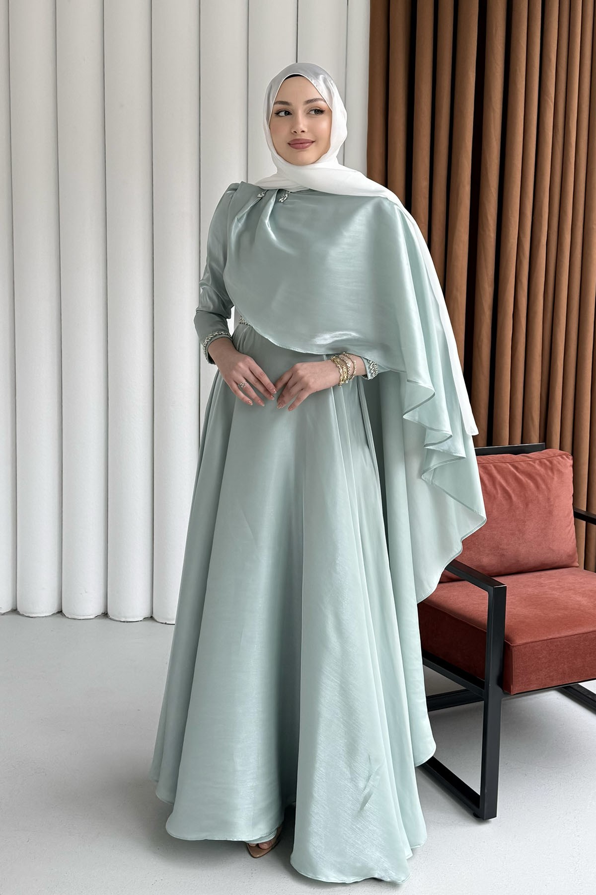 Aura Fular Detaylı & Taşlı Jan Jan Tesettür Abiye-MİNT YEŞİLİ (5238)