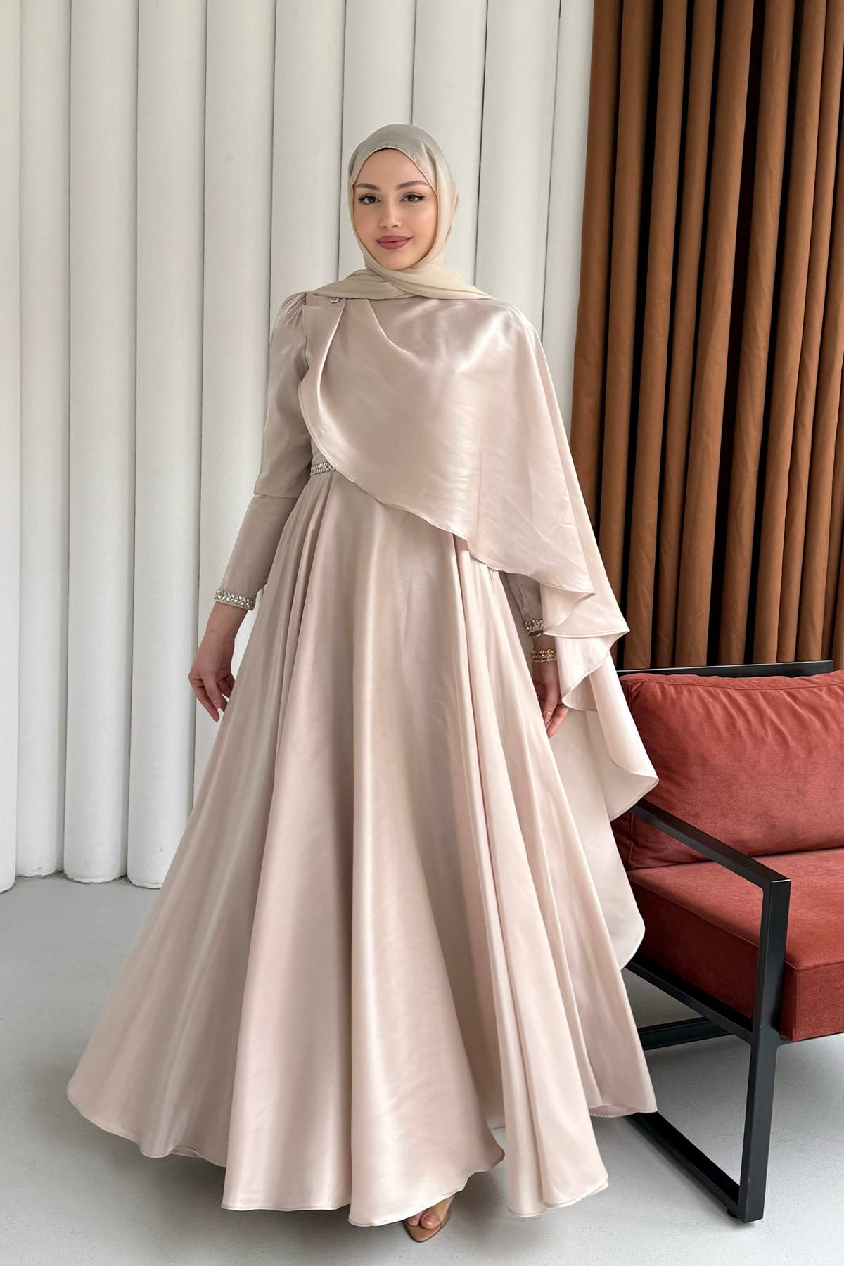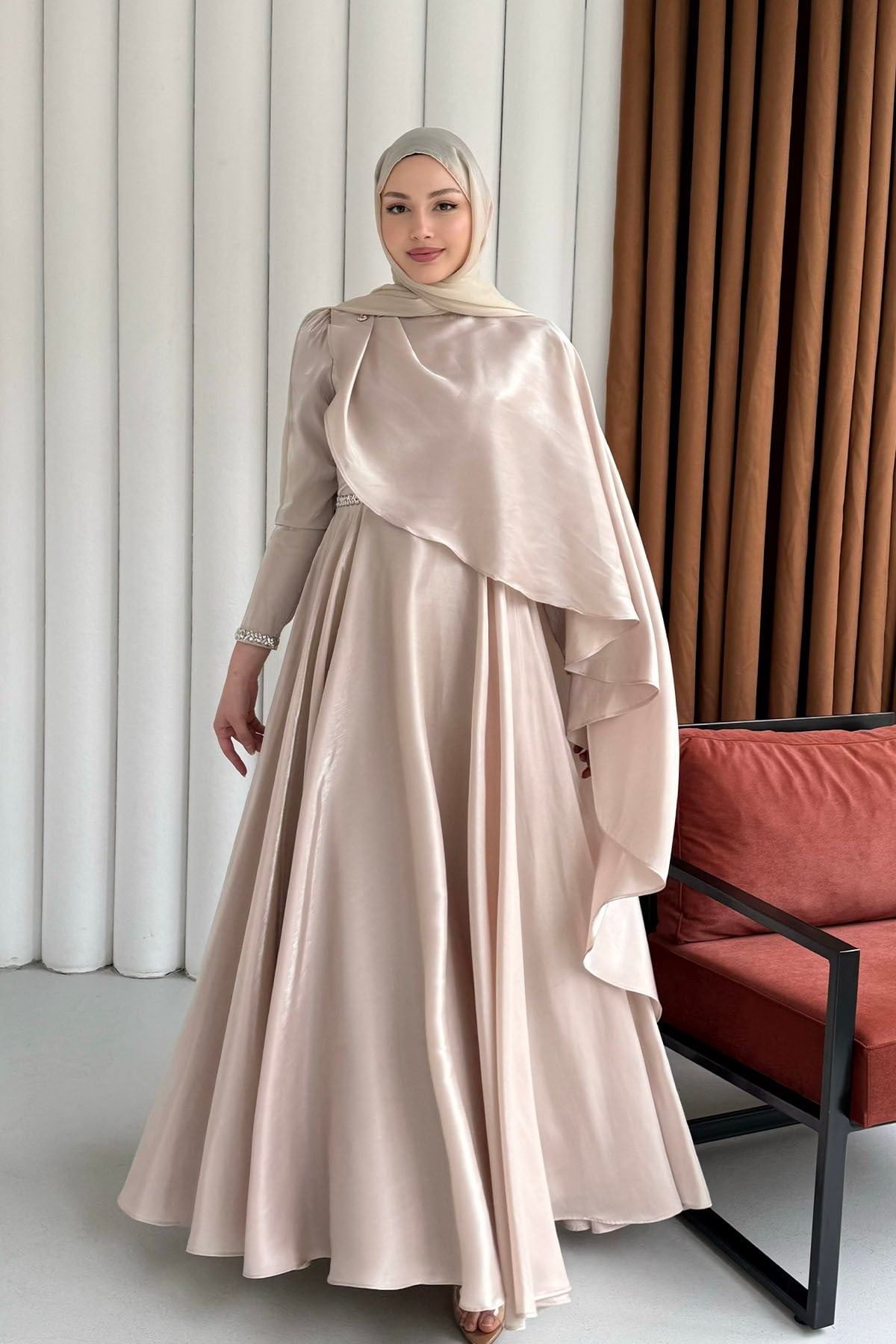 Aura Fular Detaylı & Taşlı Jan Jan Tesettür Abiye-TAŞ (5238)