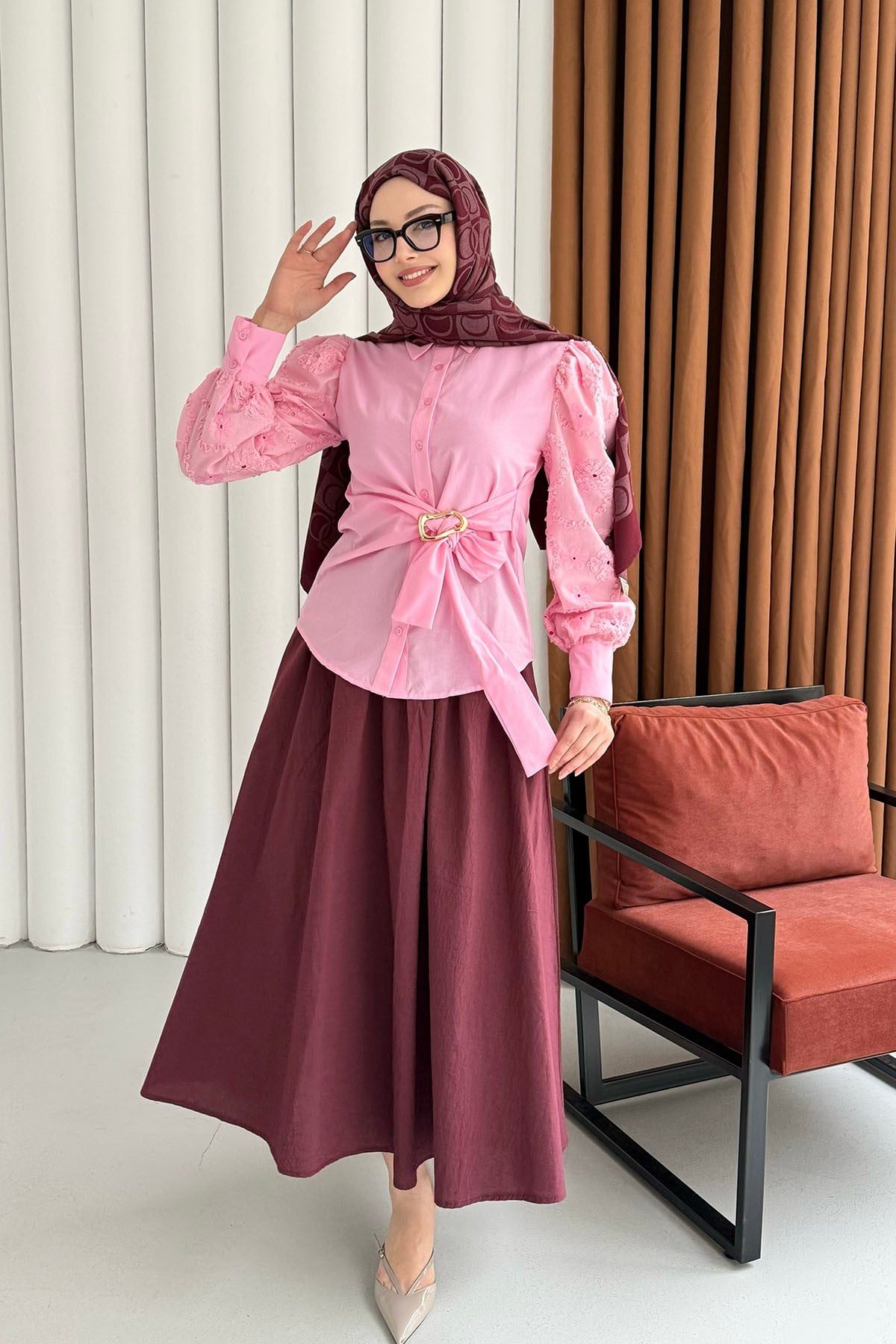 Balon Kol Nakış Detaylı Düğmeli Gömlek-PEMBE (035)
