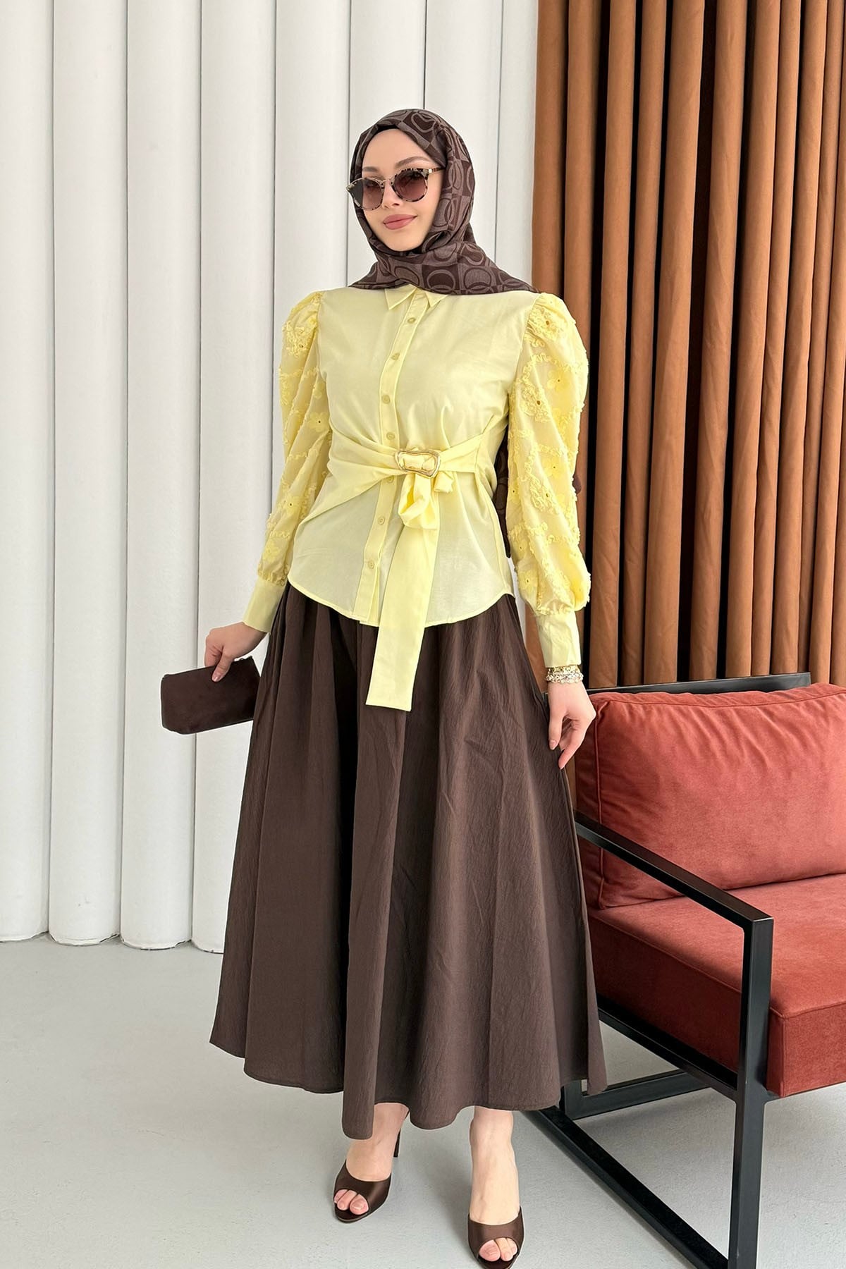 Balon Kol Nakış Detaylı Düğmeli Gömlek-SARI (035)