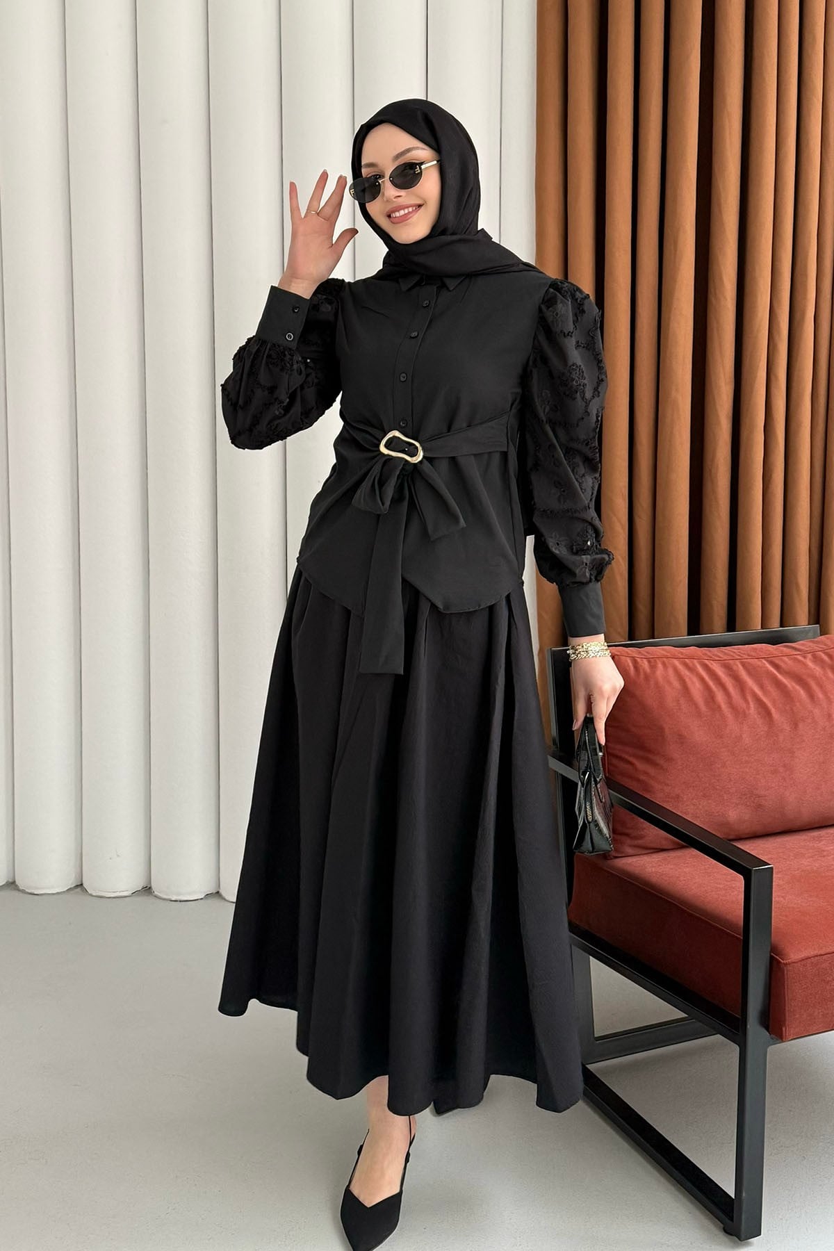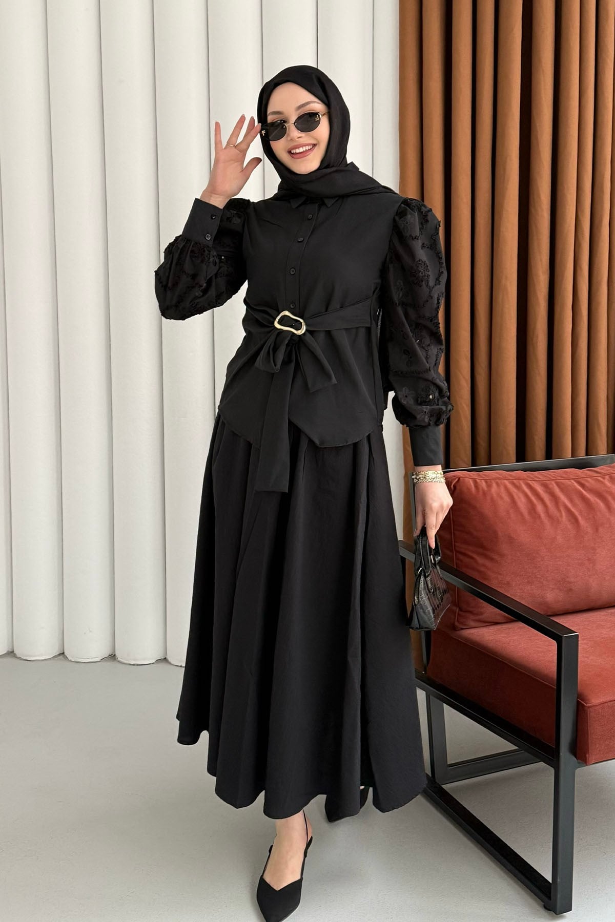 Balon Kol Nakış Detaylı Düğmeli Gömlek-SİYAH (035)