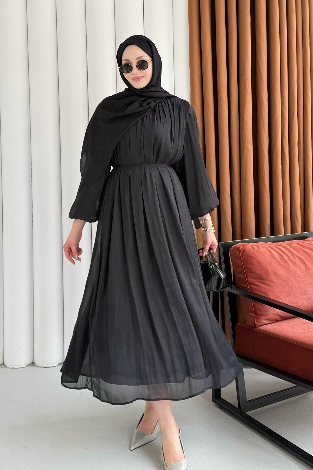 Balon Kol Pile Detay Organze Şifon Tesettür Elbise-SİYAH (5512)