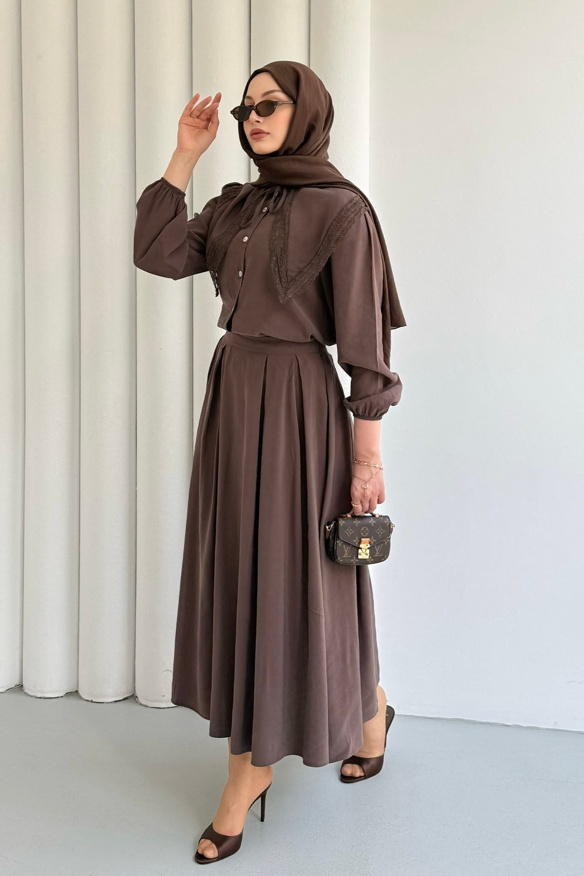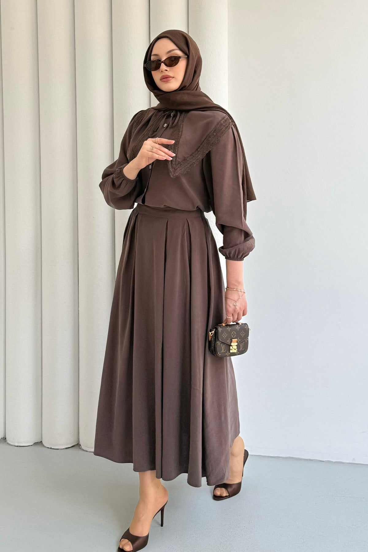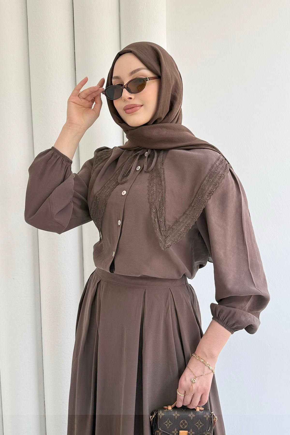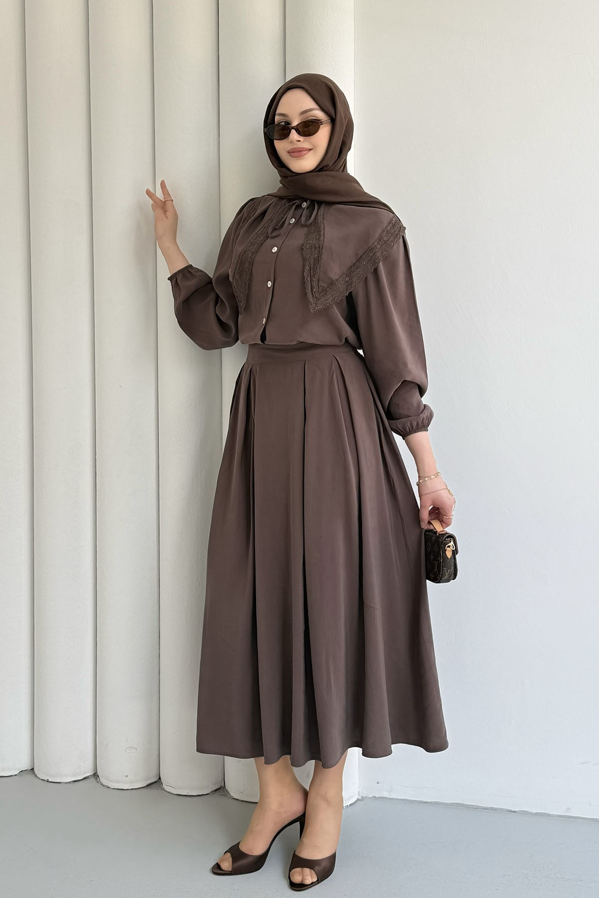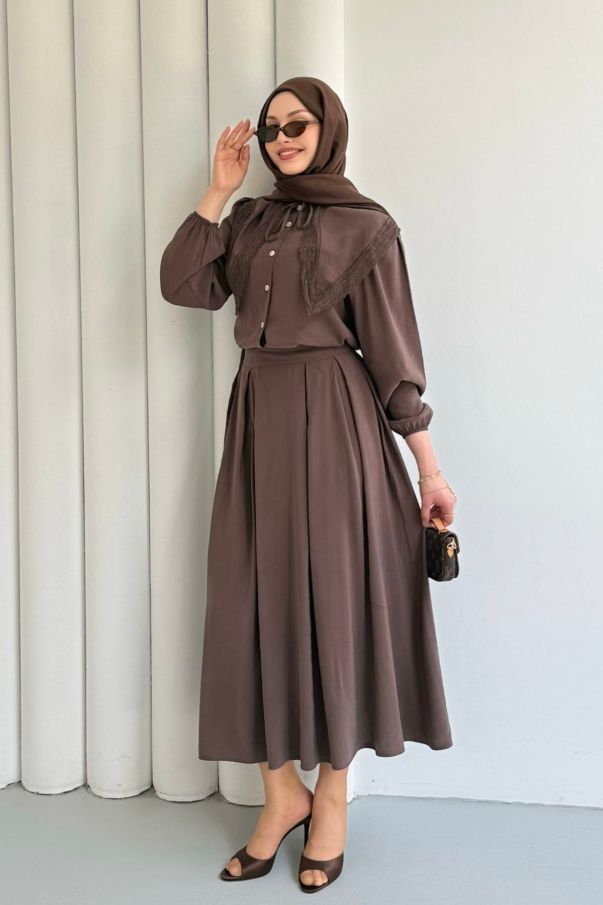 Bebe Yaka Dantel Detaylı Etekli Tesettür Takım-KAHVERENGİ (3147)