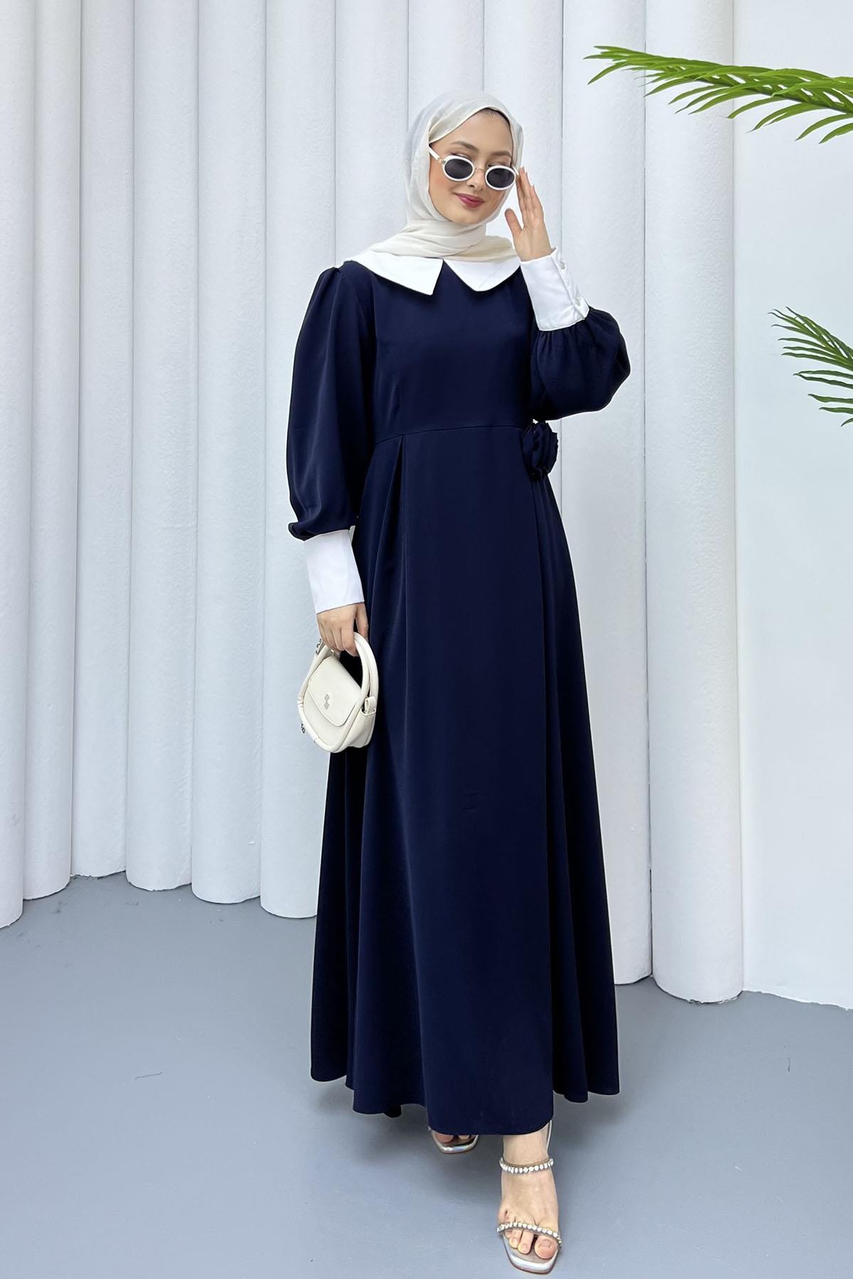 Bebe Yaka Kol Detaylı Tesettür Elbise-LACİVERT (1042)