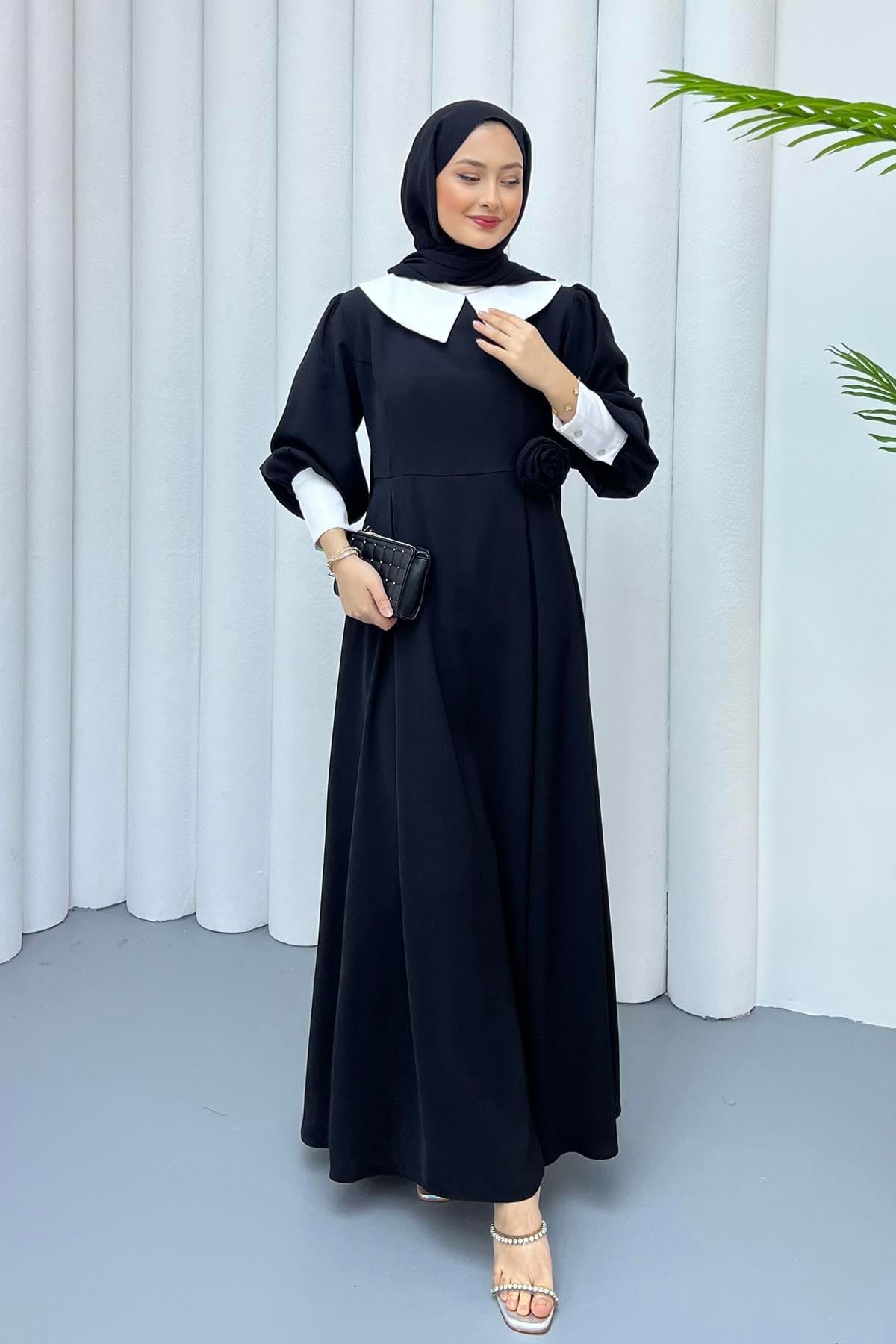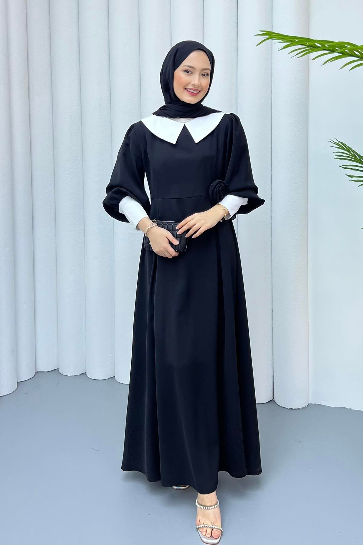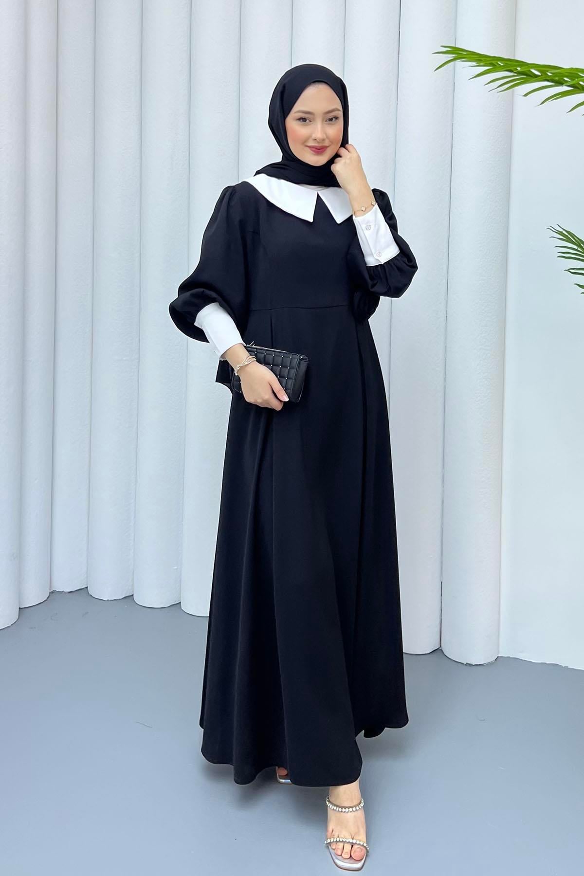Bebe Yaka Kol Detaylı Tesettür Elbise-SİYAH (1042)