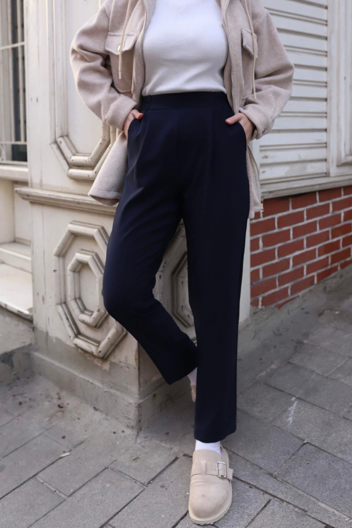 Bel Lastikli Ön Pile Detaylı Havuç Pantolon-LACİVERT (803)