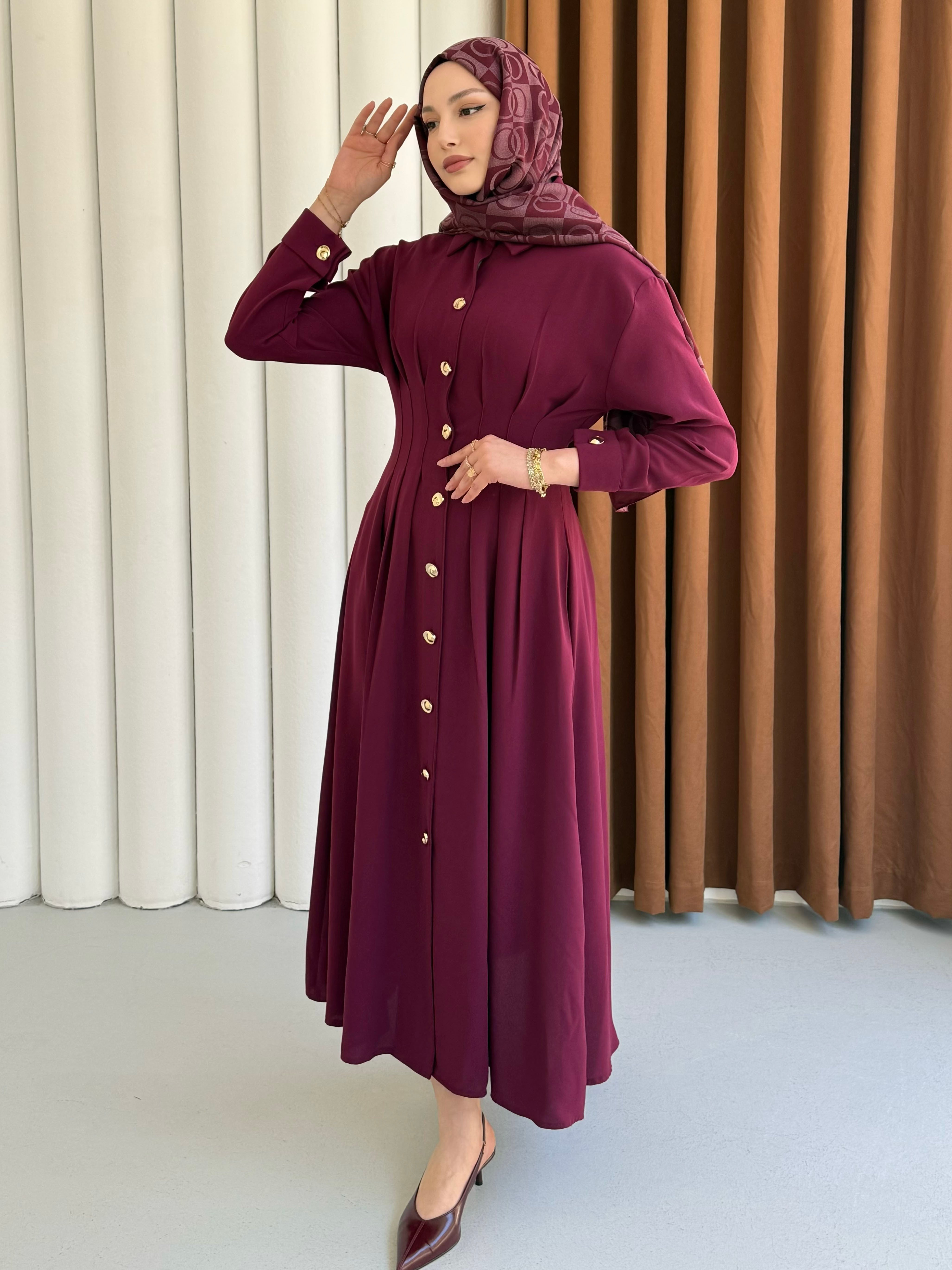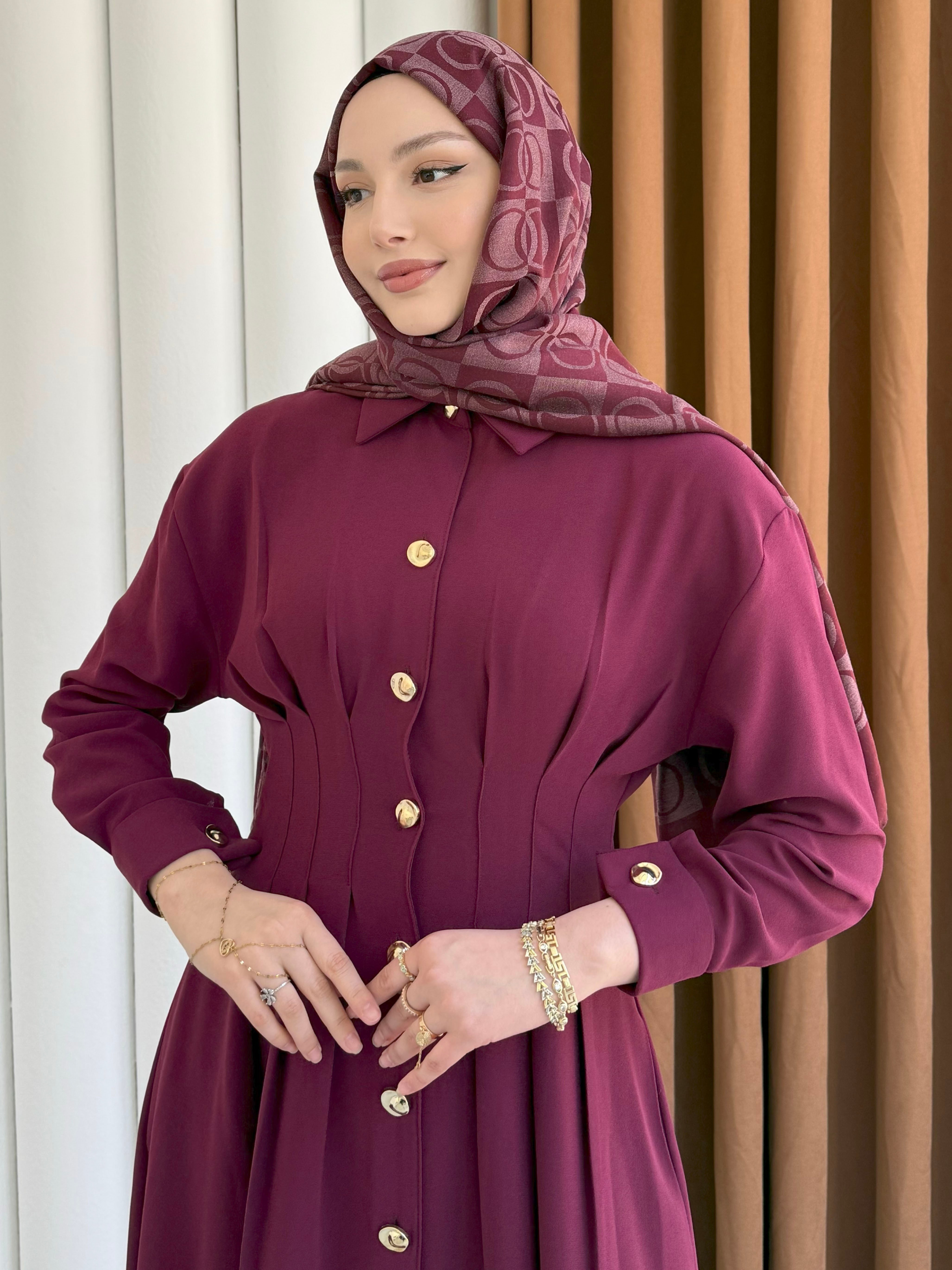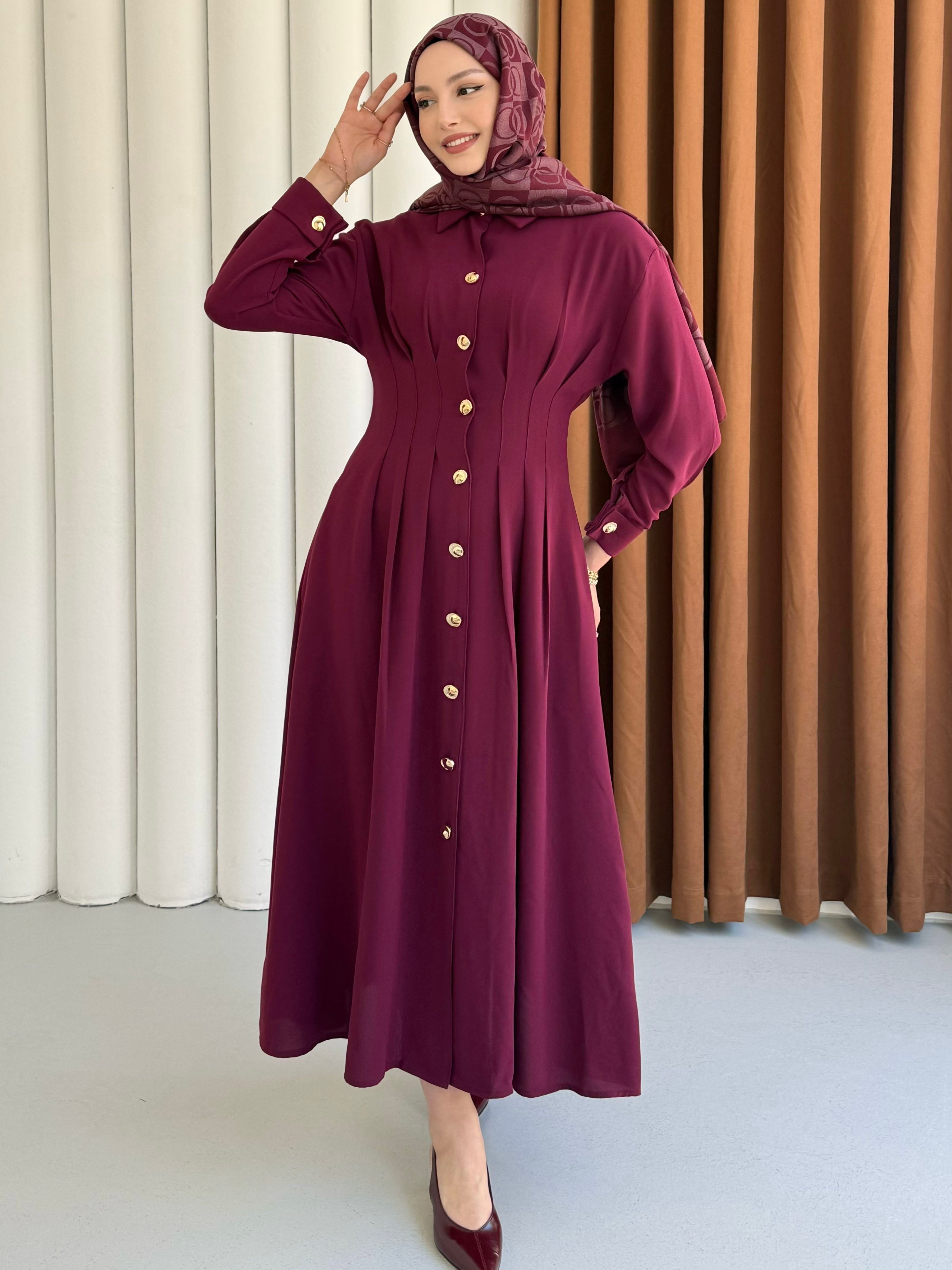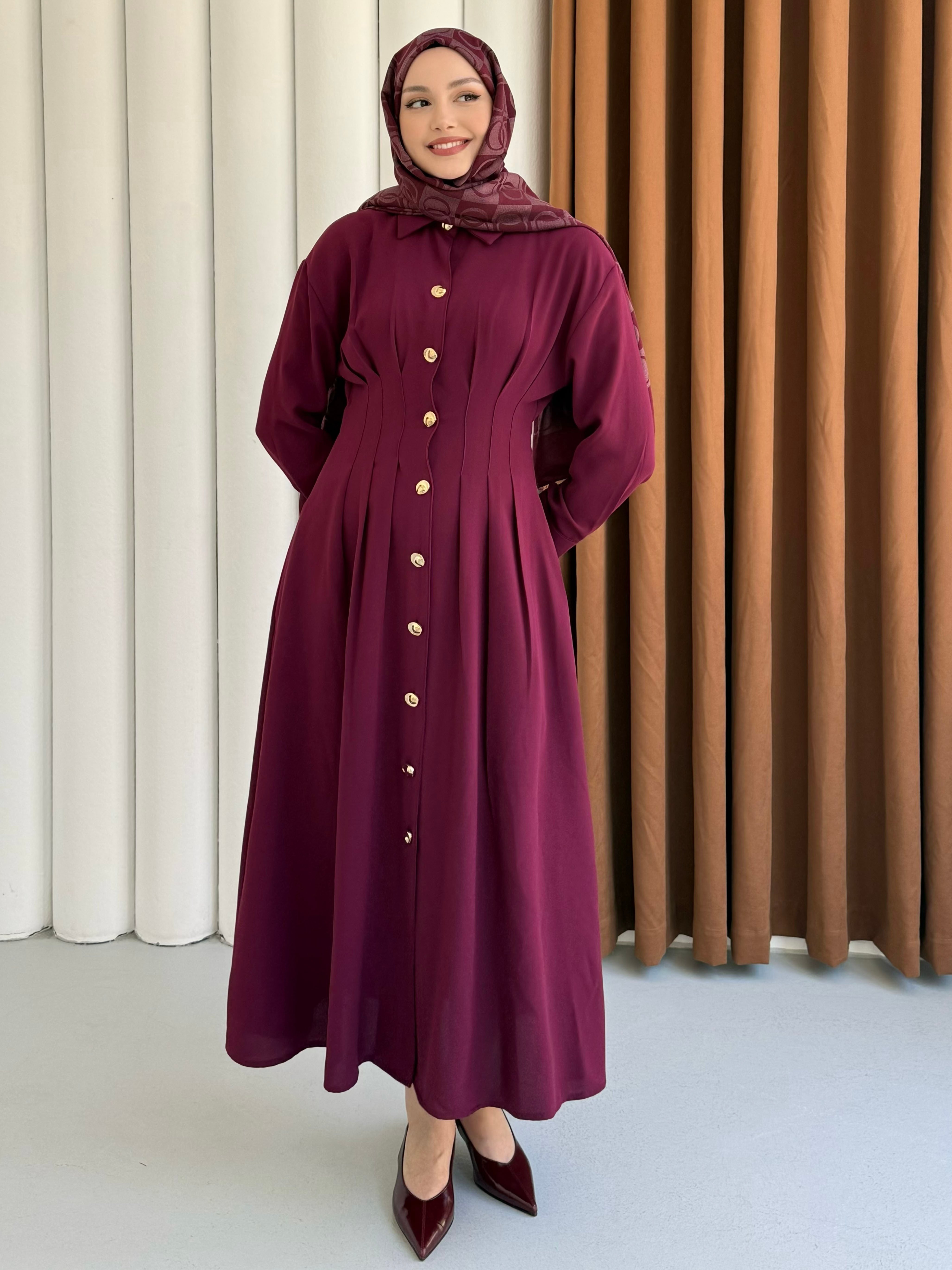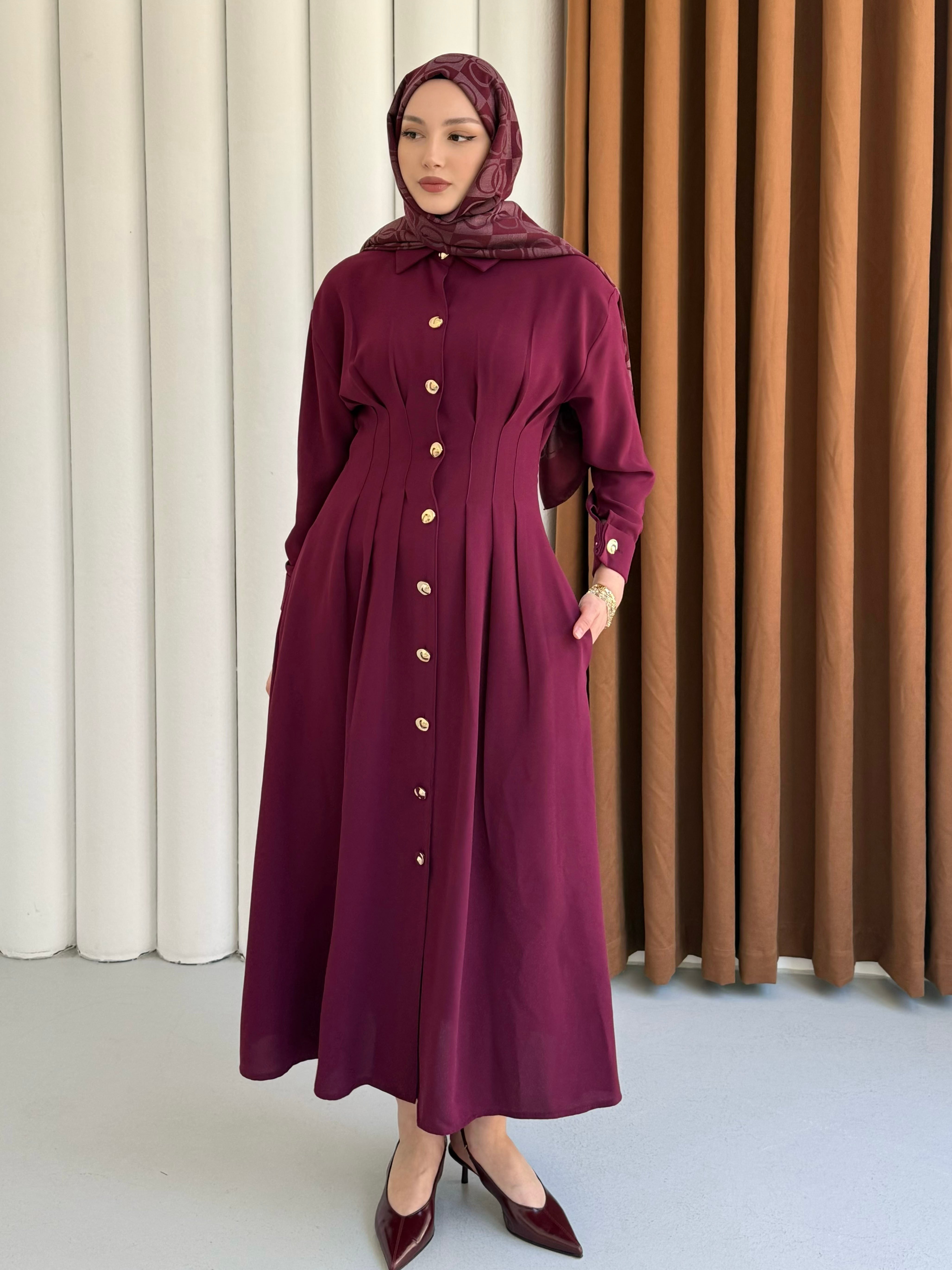 Bel Sason Detaylı Ön Düğmeli Tensel Tesettür Elbise-BORDO (5509)