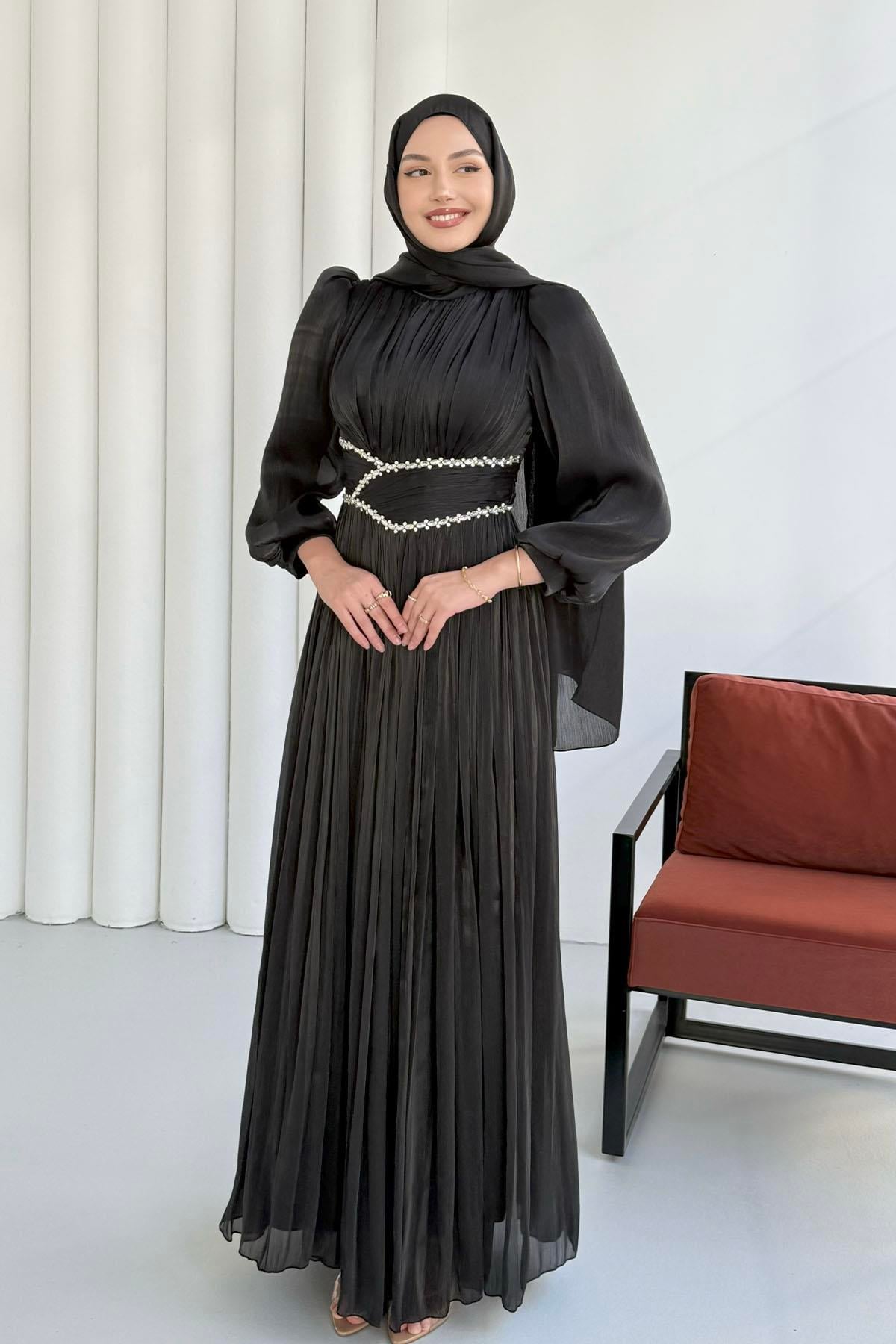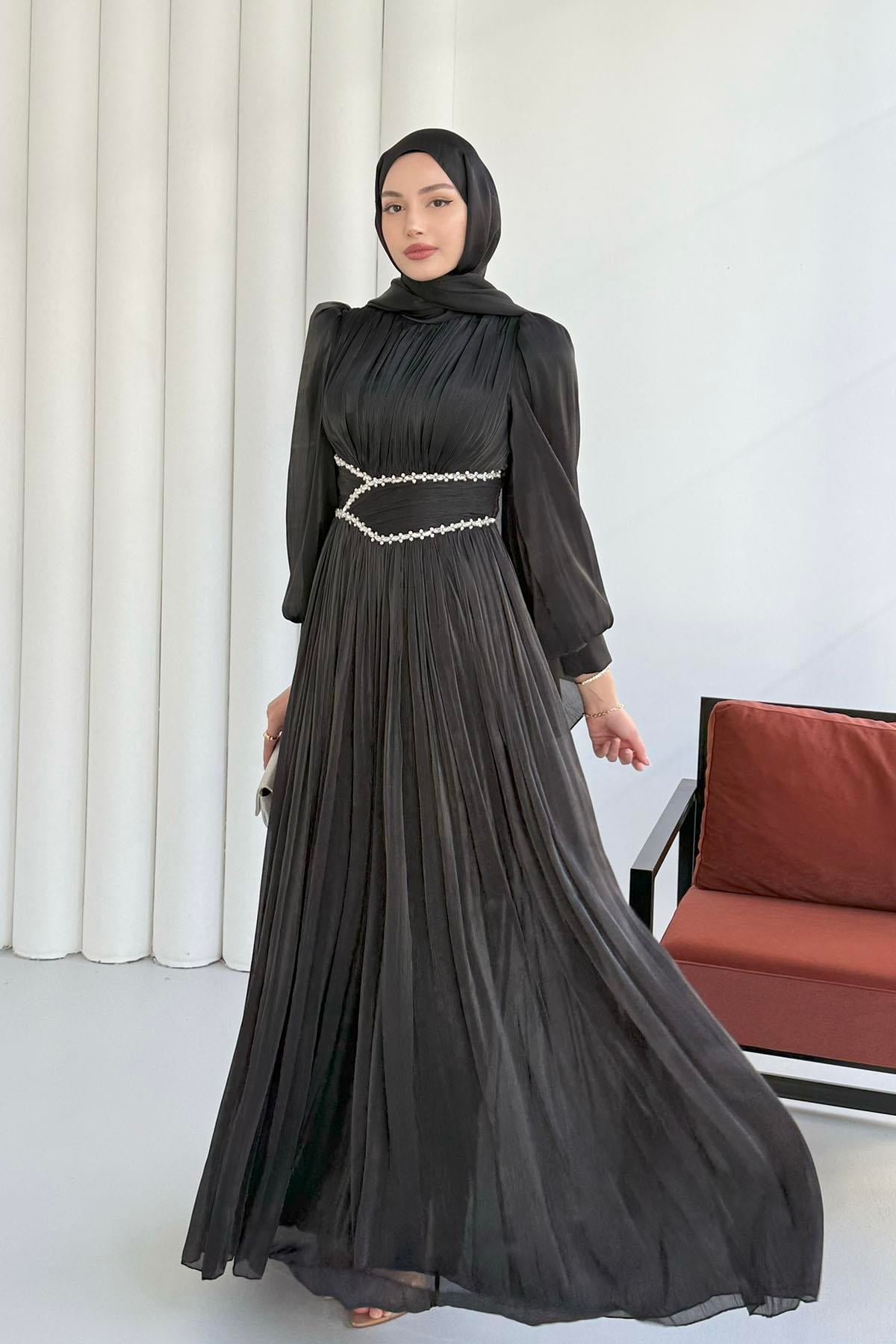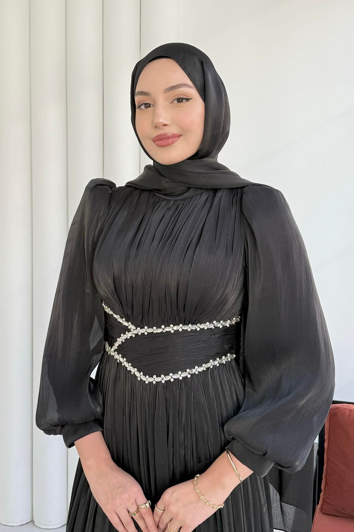 Belden Oturtmalı Taş İşlemeli Jan Jan Tesettür Abiye-SİYAH (5404)