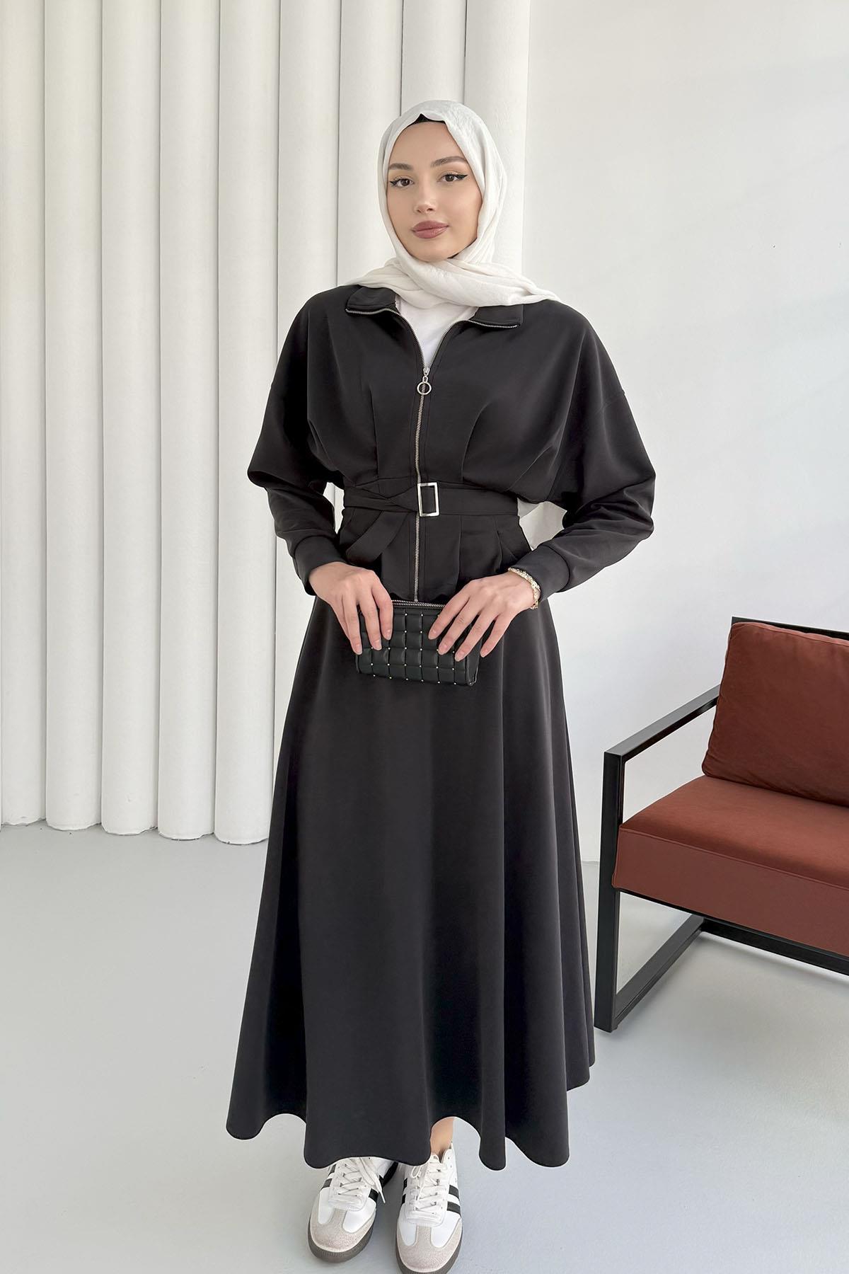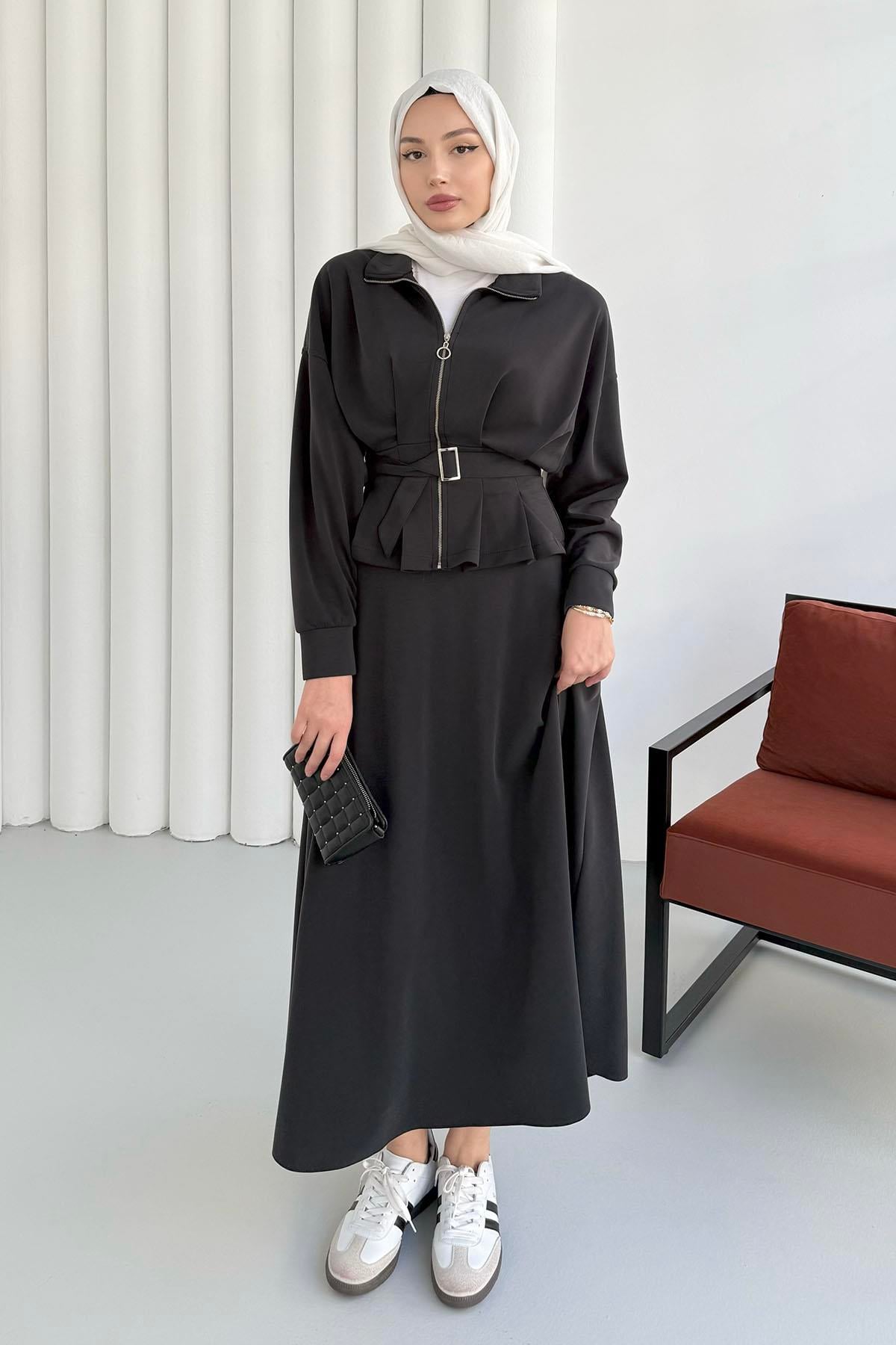 Beli Bağlamalı Fermuarlı Etekli Tesettür Takım-SİYAH (8408)