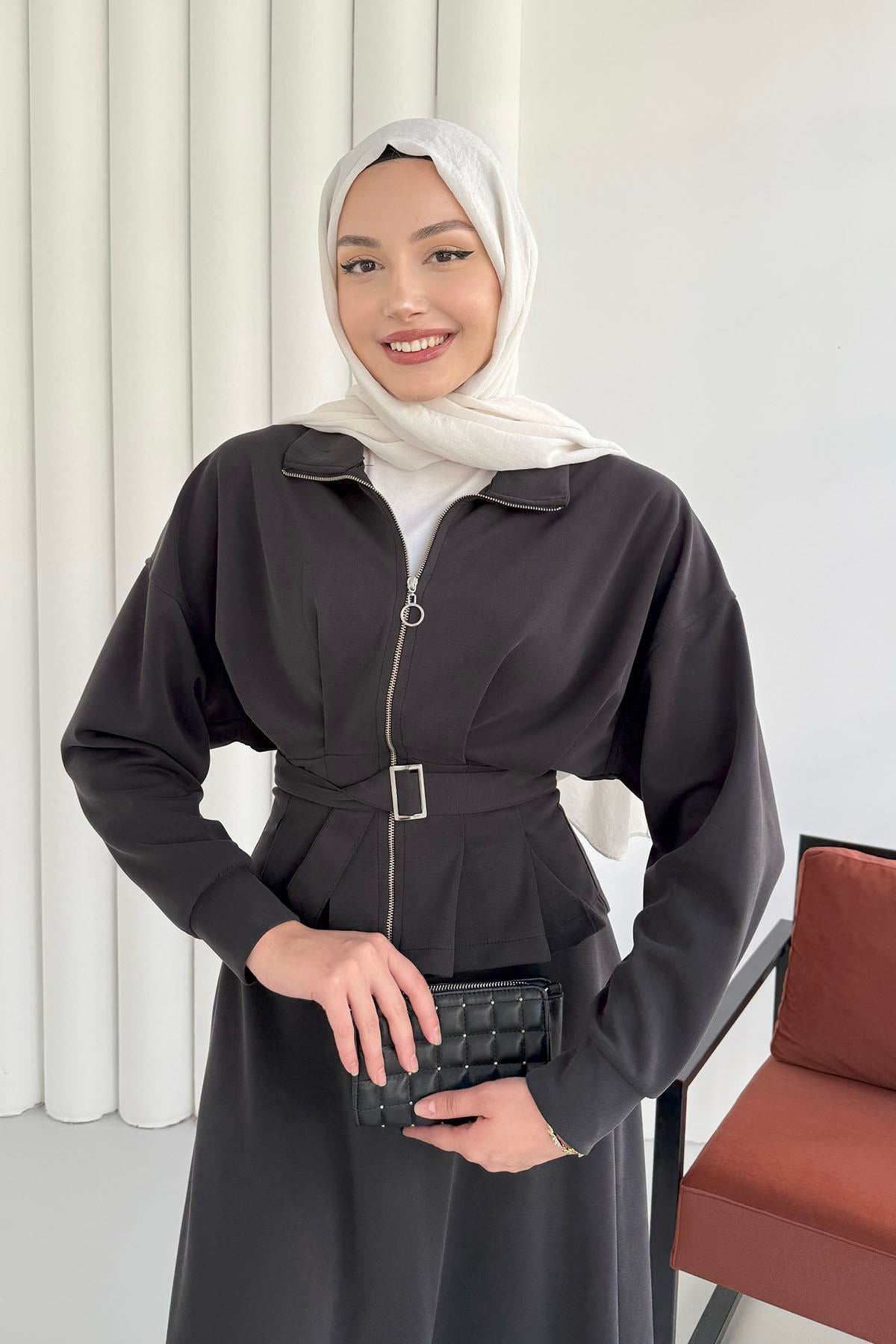 Beli Bağlamalı Fermuarlı Etekli Tesettür Takım-GRİ Beli Bağlamalı Fermuarlı Etekli Tesettür Takım-SİYAH