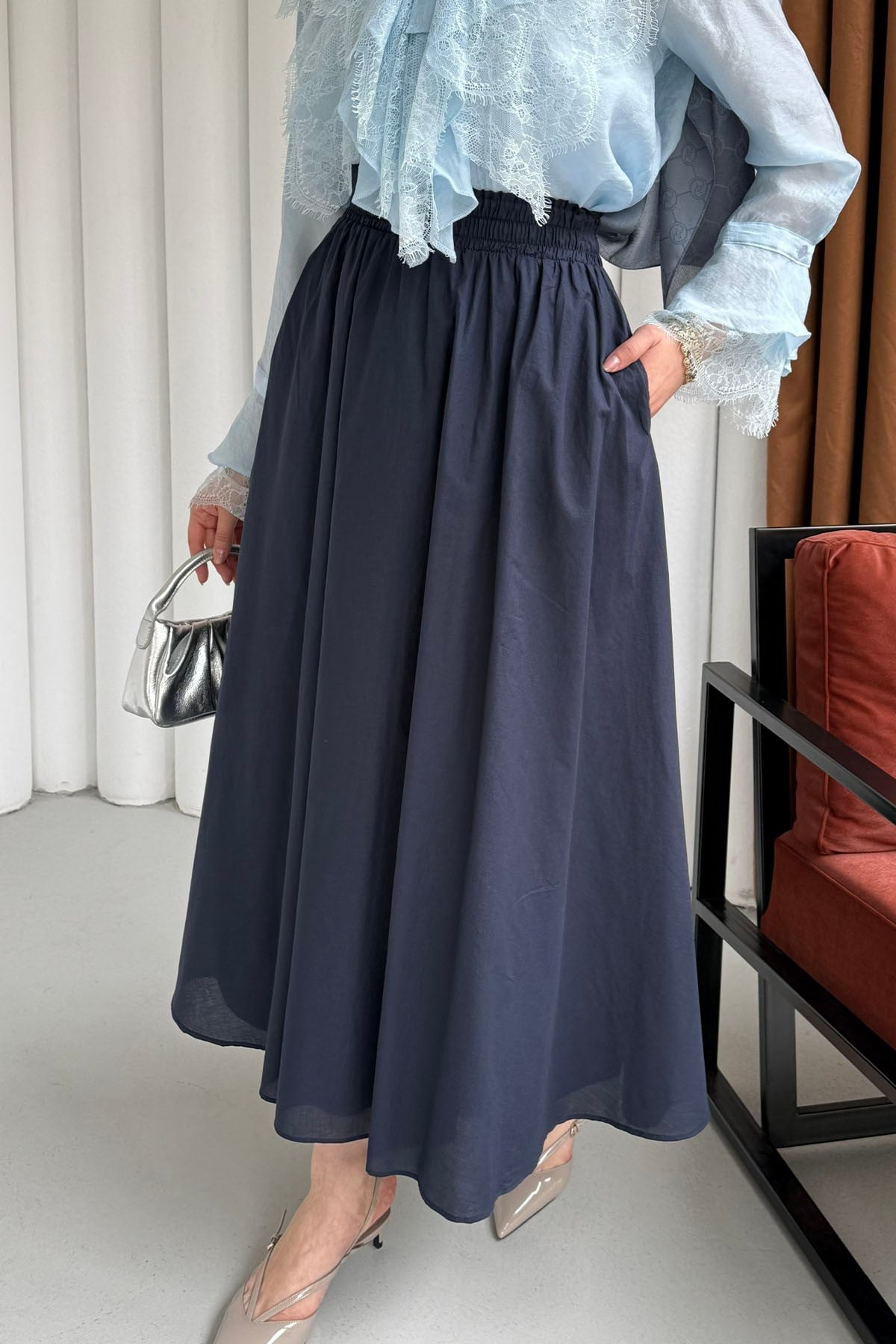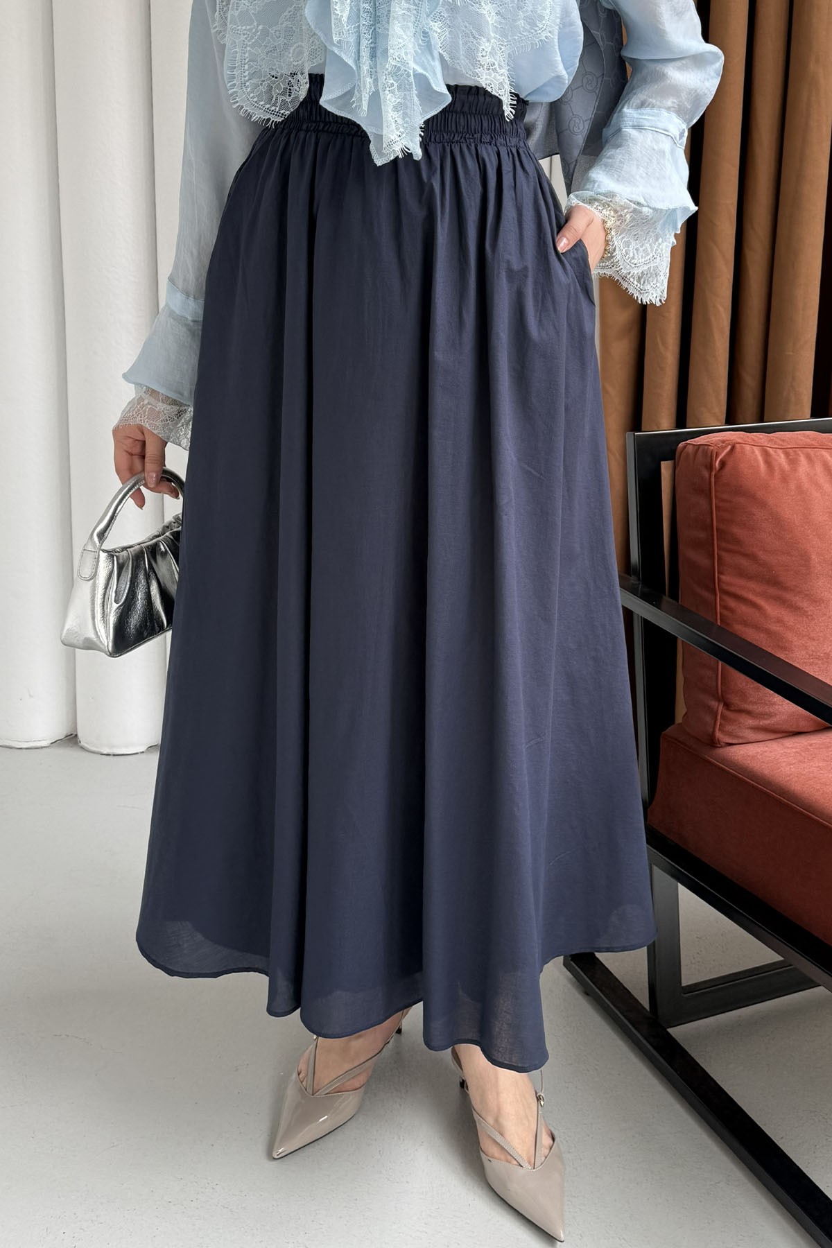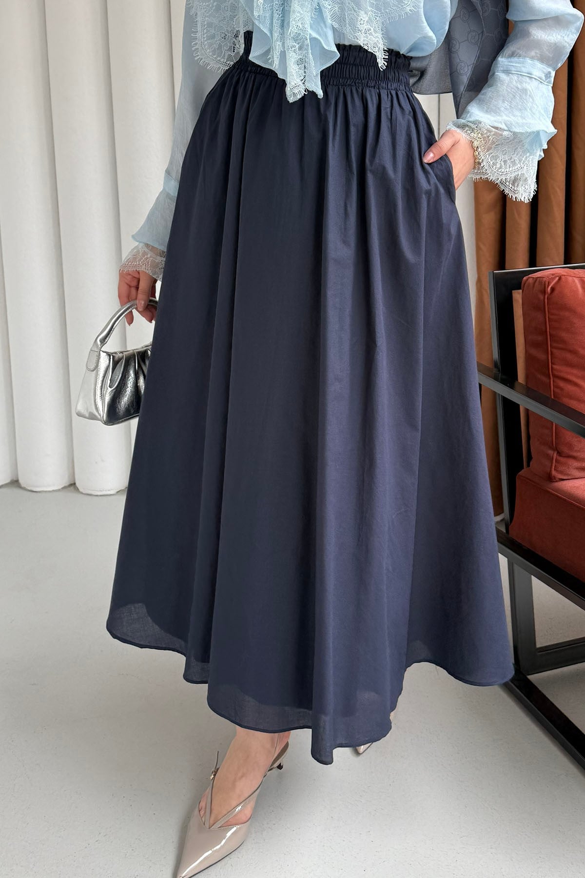 Beli Lastikli Cepli Etek-LACİVERT (27040)