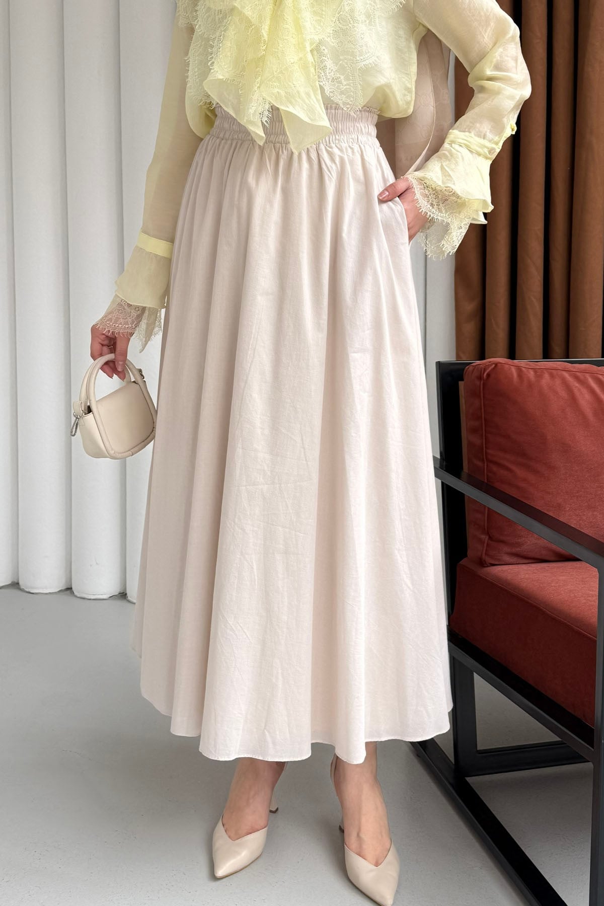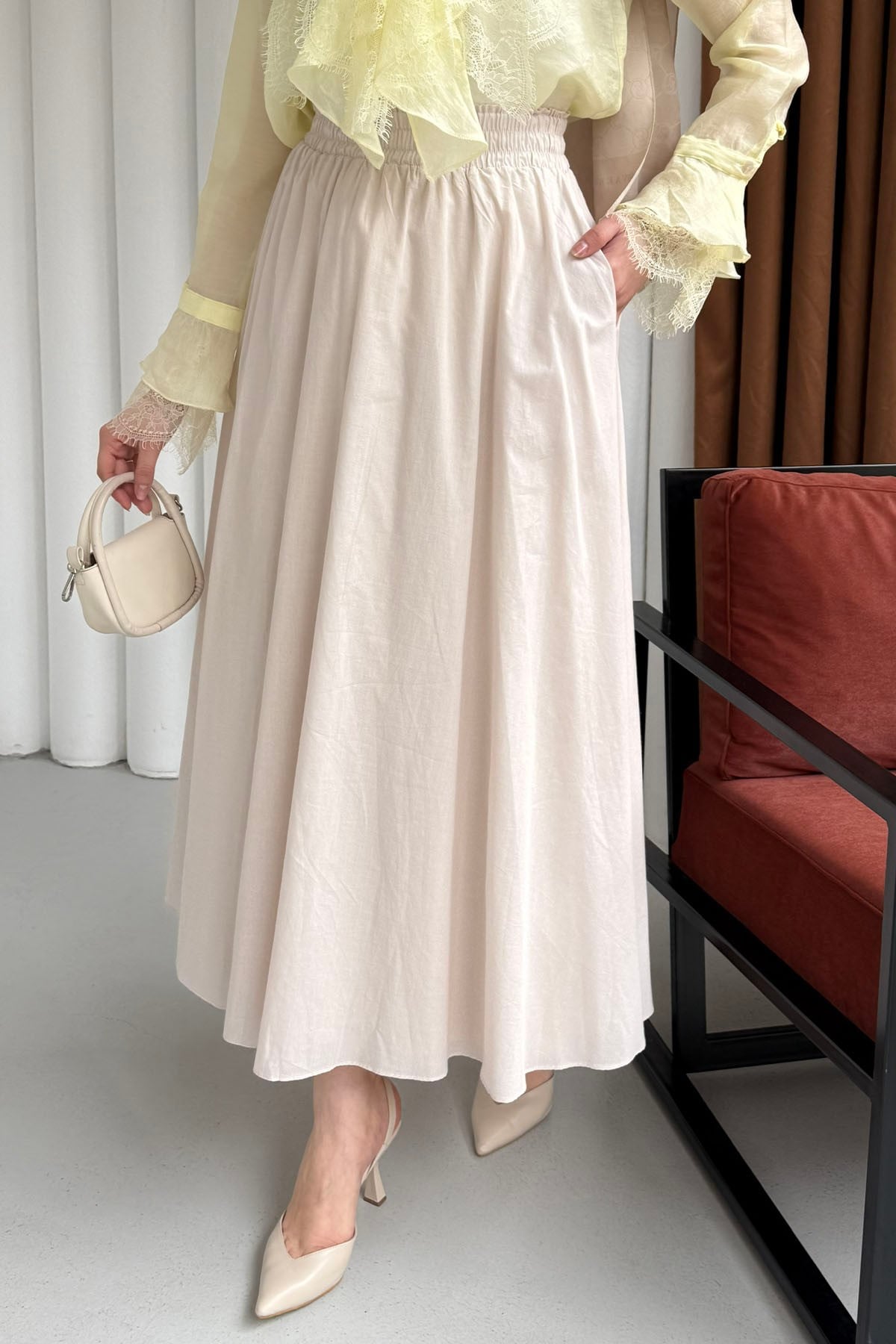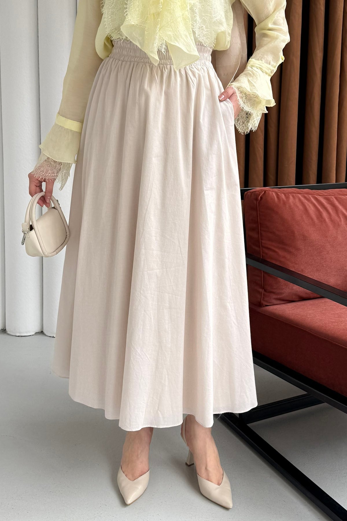 Beli Lastikli Cepli Etek-LACİVERT Beli Lastikli Cepli Etek-KAHVERENGİ Beli Lastikli Cepli Etek-TAŞ Beli Lastikli Cepli Etek-SİYAH