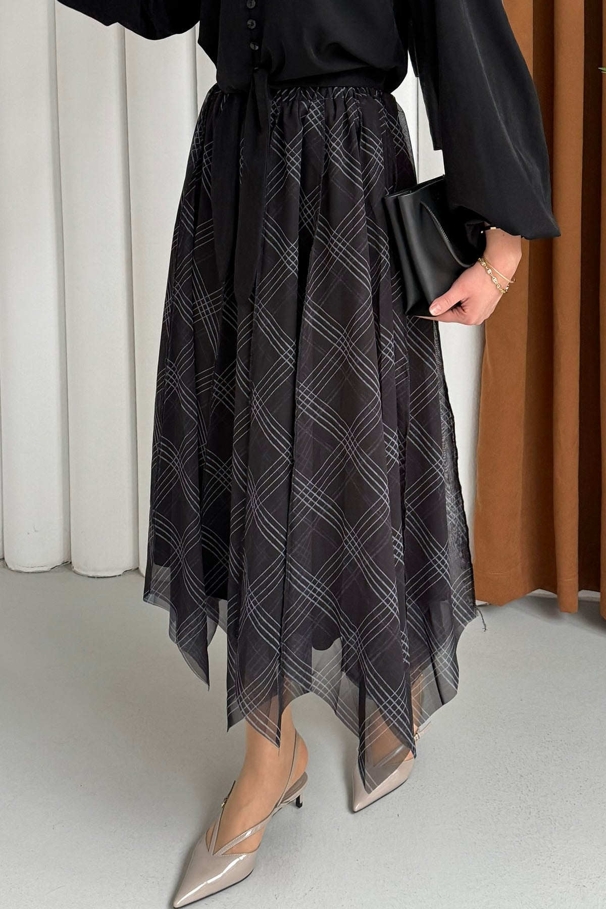 Beli Lastikli Çizgili Şifon Etek-SİYAH (5286)