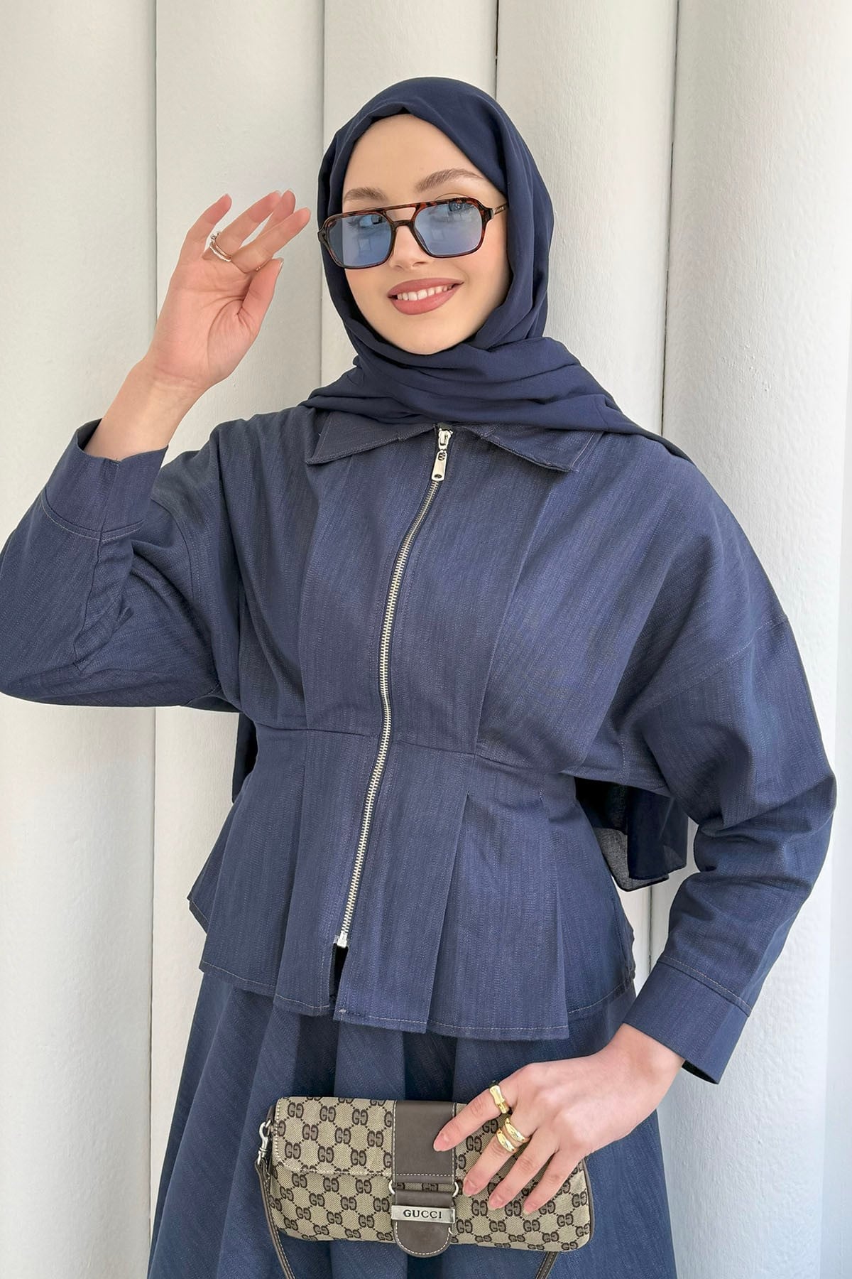 Beli Lastikli Fermuarlı Etekli Tesettür Takım-İNDİGO (0015)
