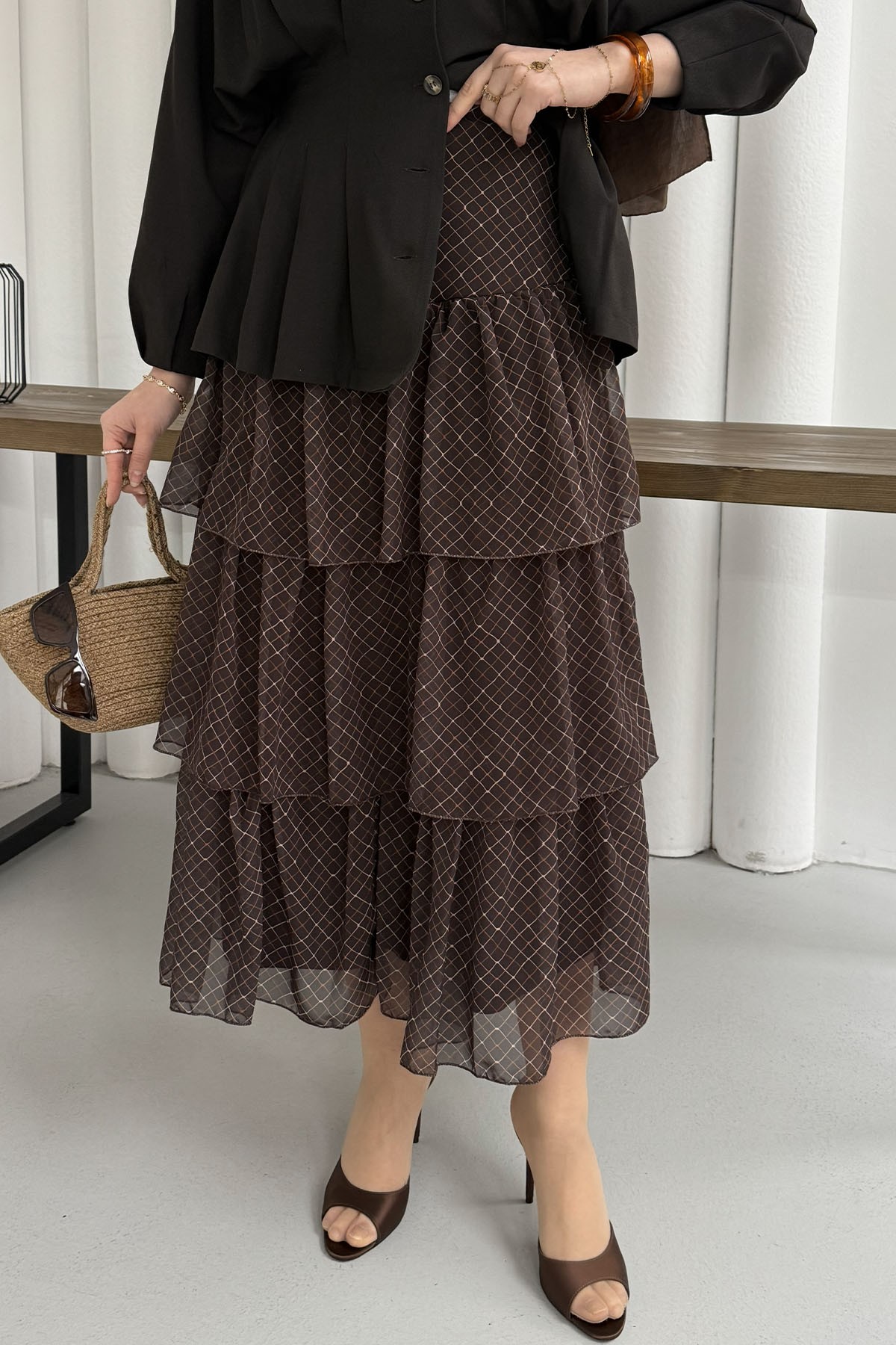 Beli Lastikli Kat Katlı Şifon Etek-KAHVERENGİ (5290)