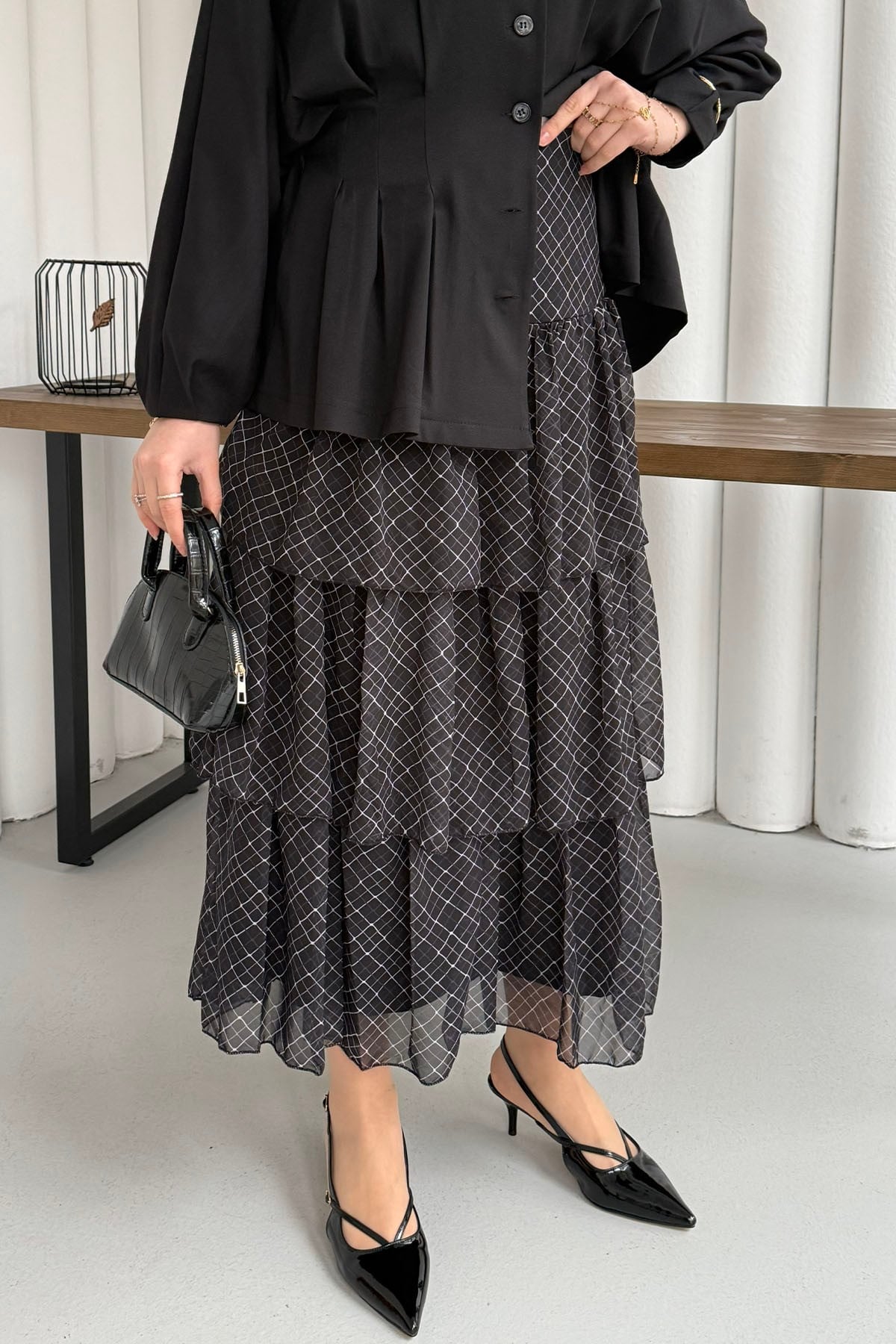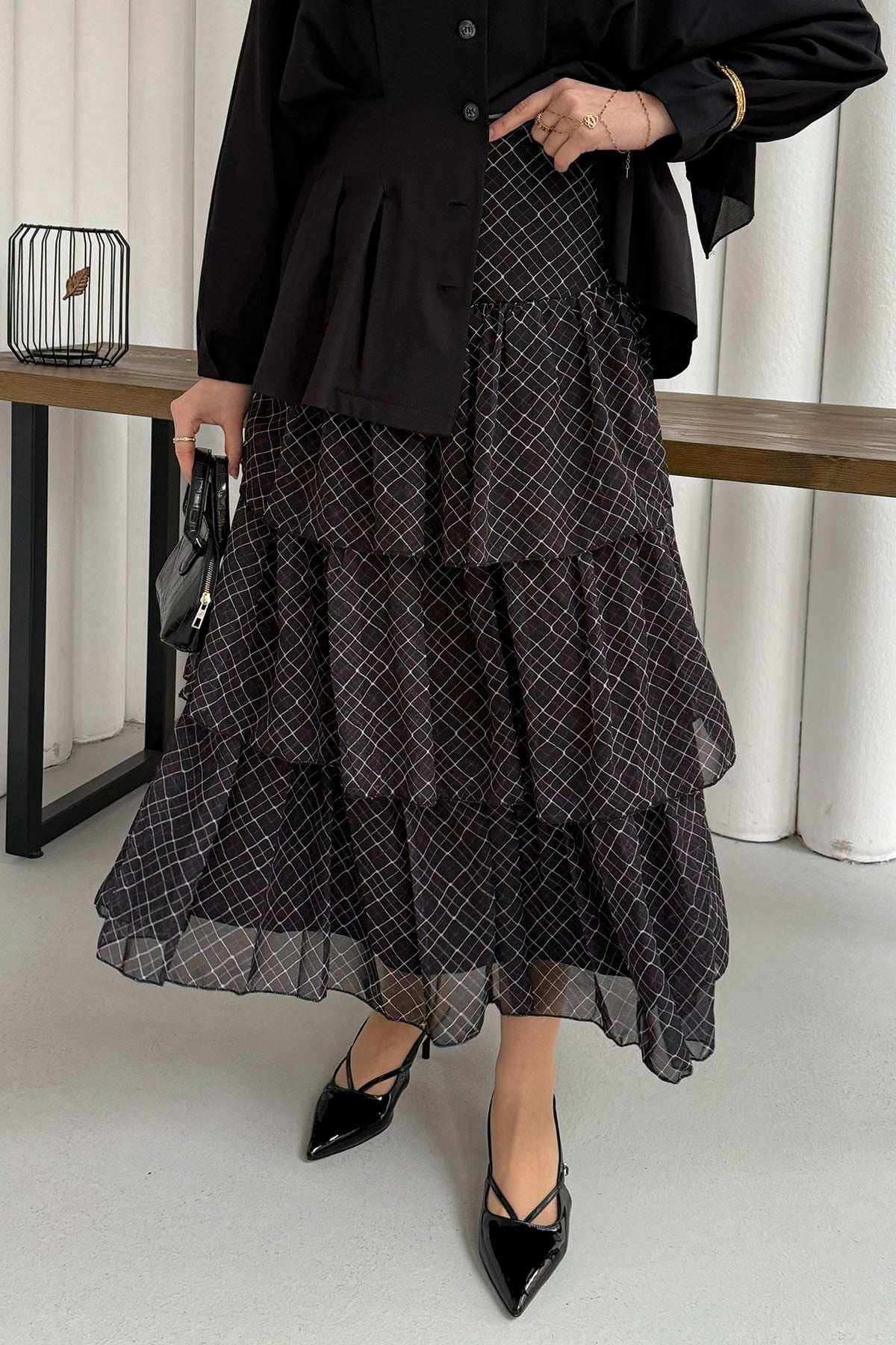 Beli Lastikli Kat Katlı Şifon Etek-SİYAH (5290)