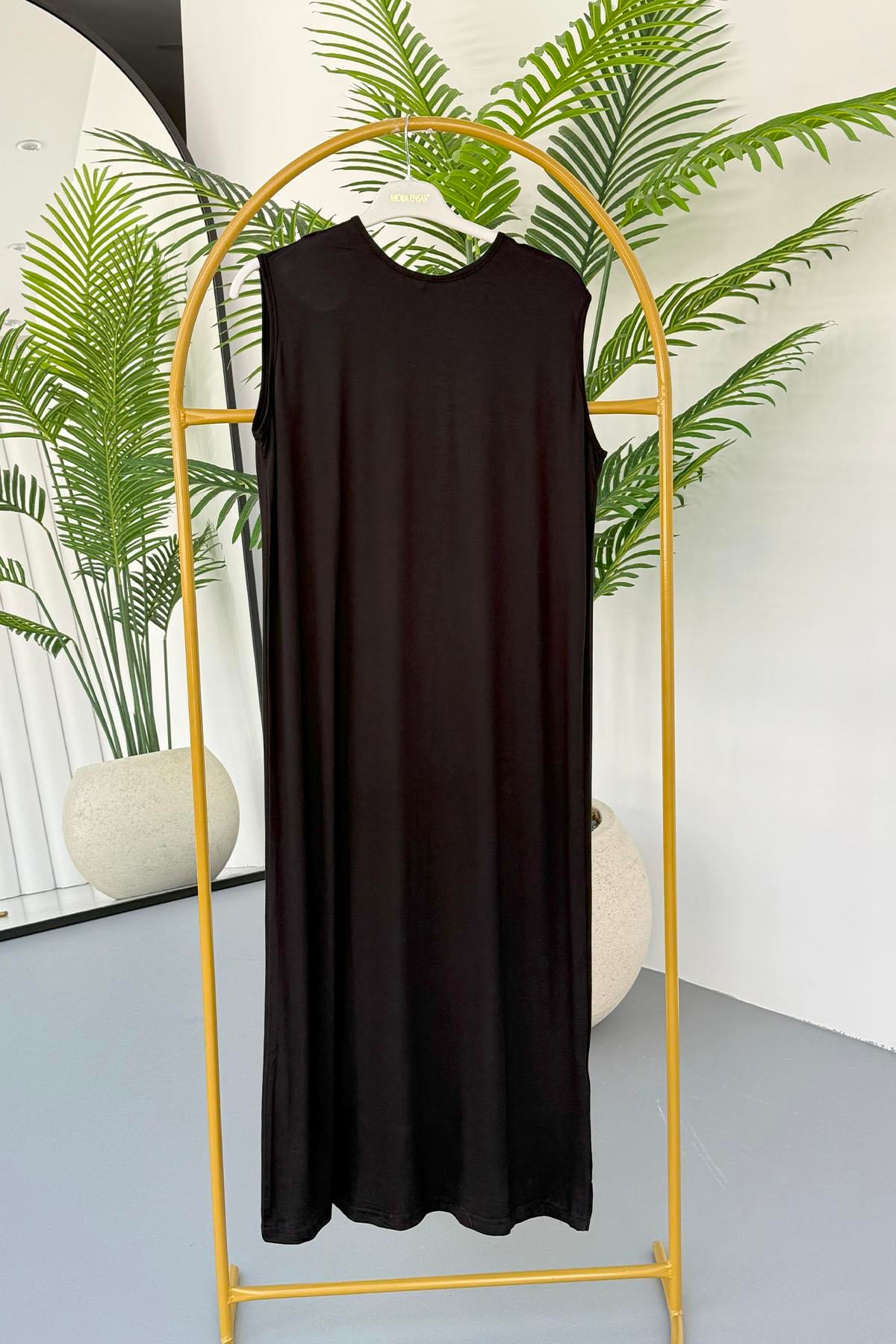 Bisiklet Yaka Kolsuz İçlik Tesettür Elbise-SİYAH (24198)