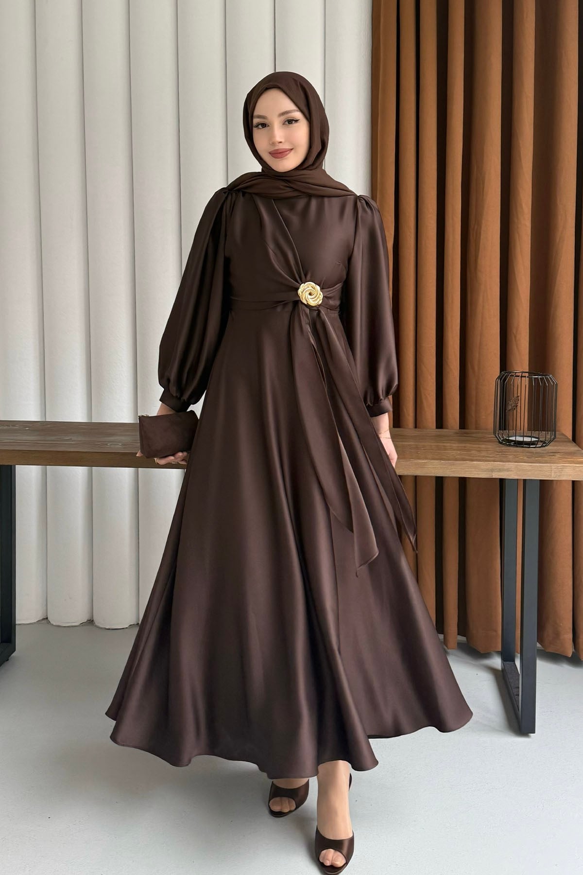 Broş Detaylı Premium Kumaş Saten Tesettür Abiye-KAHVERENGİ (5951)
