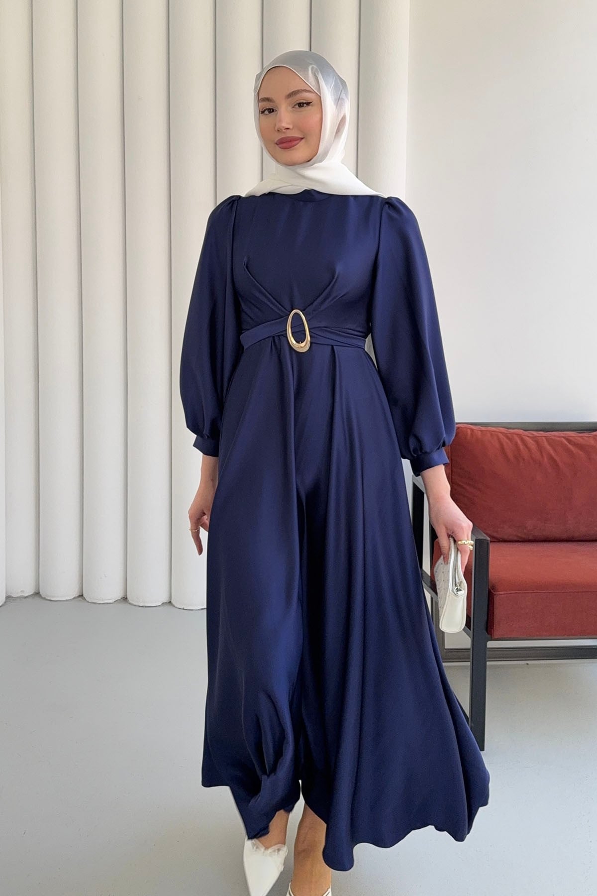 Çapraz Tokalı Saten Tesettür Elbise-LACİVERT (5994)