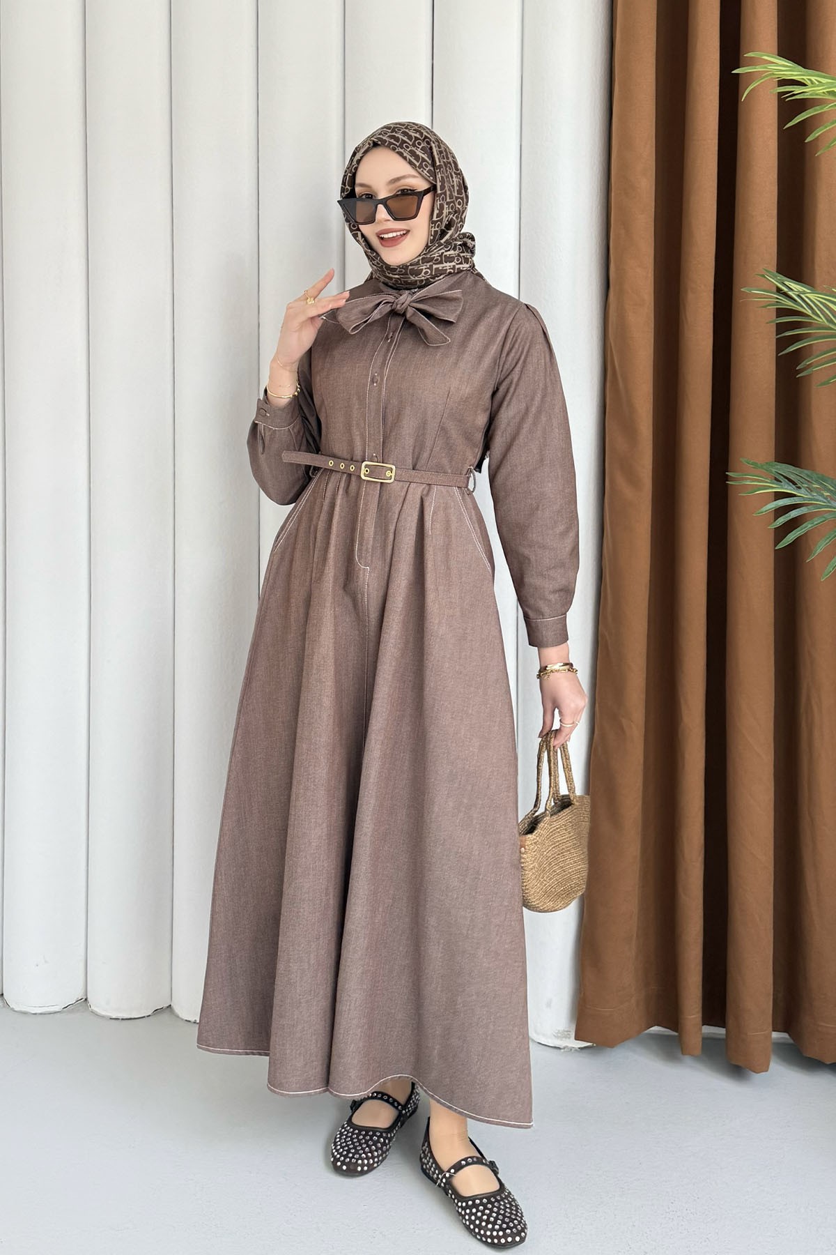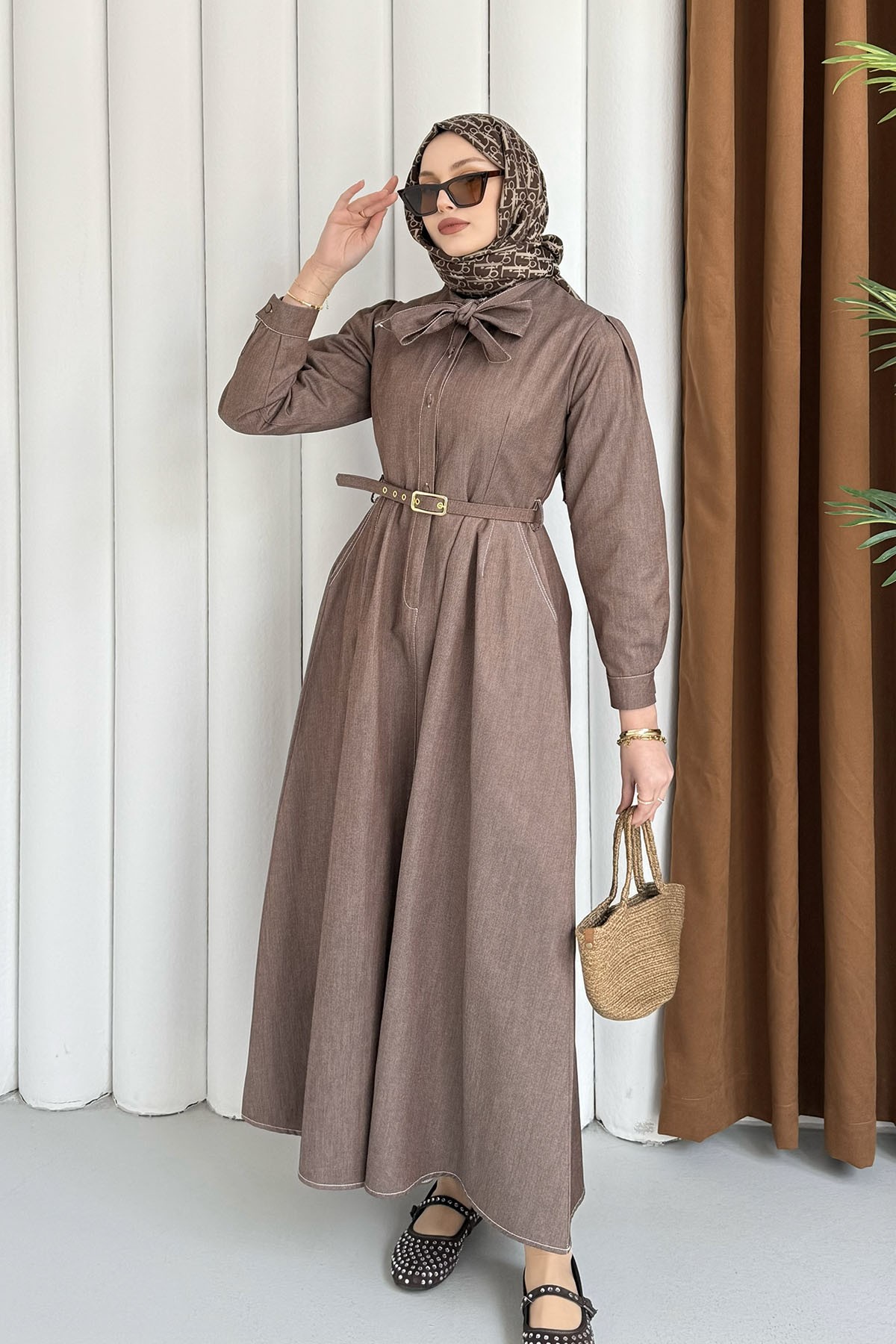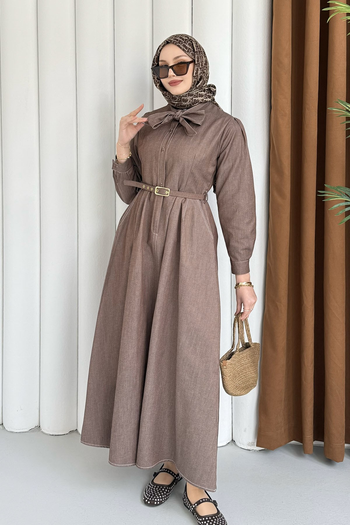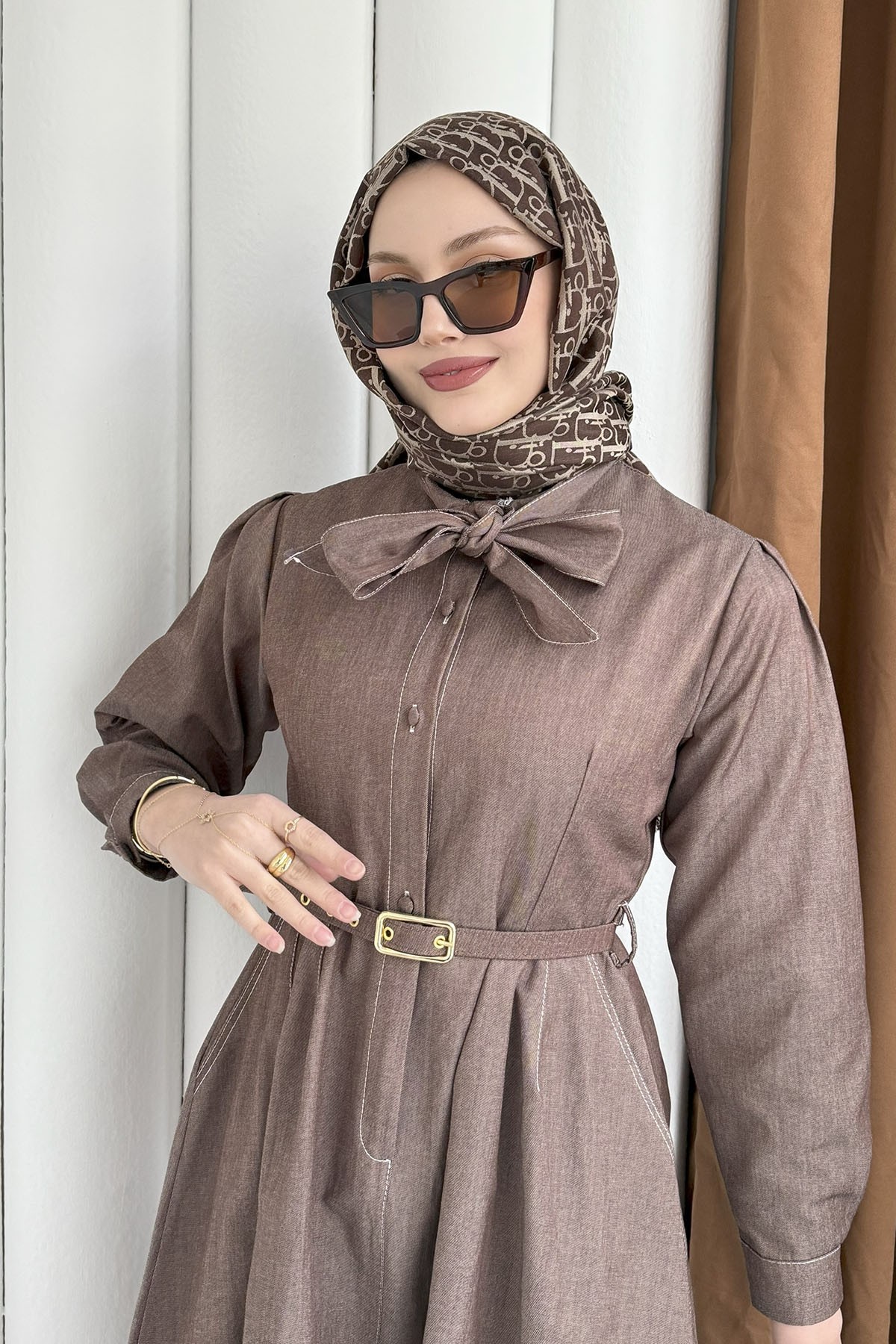 Cepli Kendinden Fularlı Şık Tesettür Elbise-KAHVERENGİ (3004)