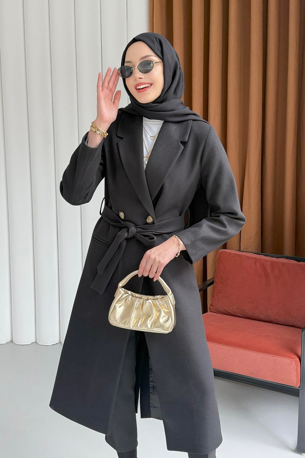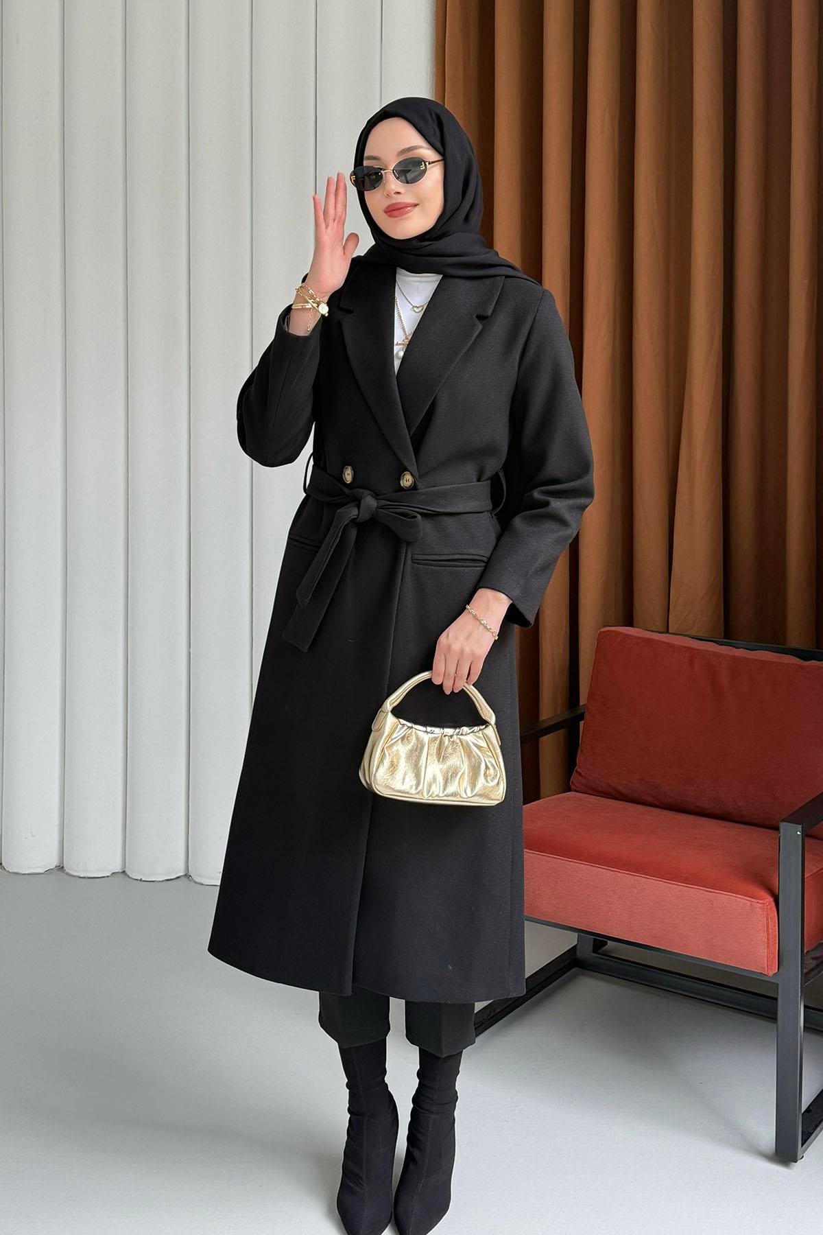 Çift Düğme Detaylı Kuşaklı Uzun Premium Kaşe Kaban-SİYAH (2902)