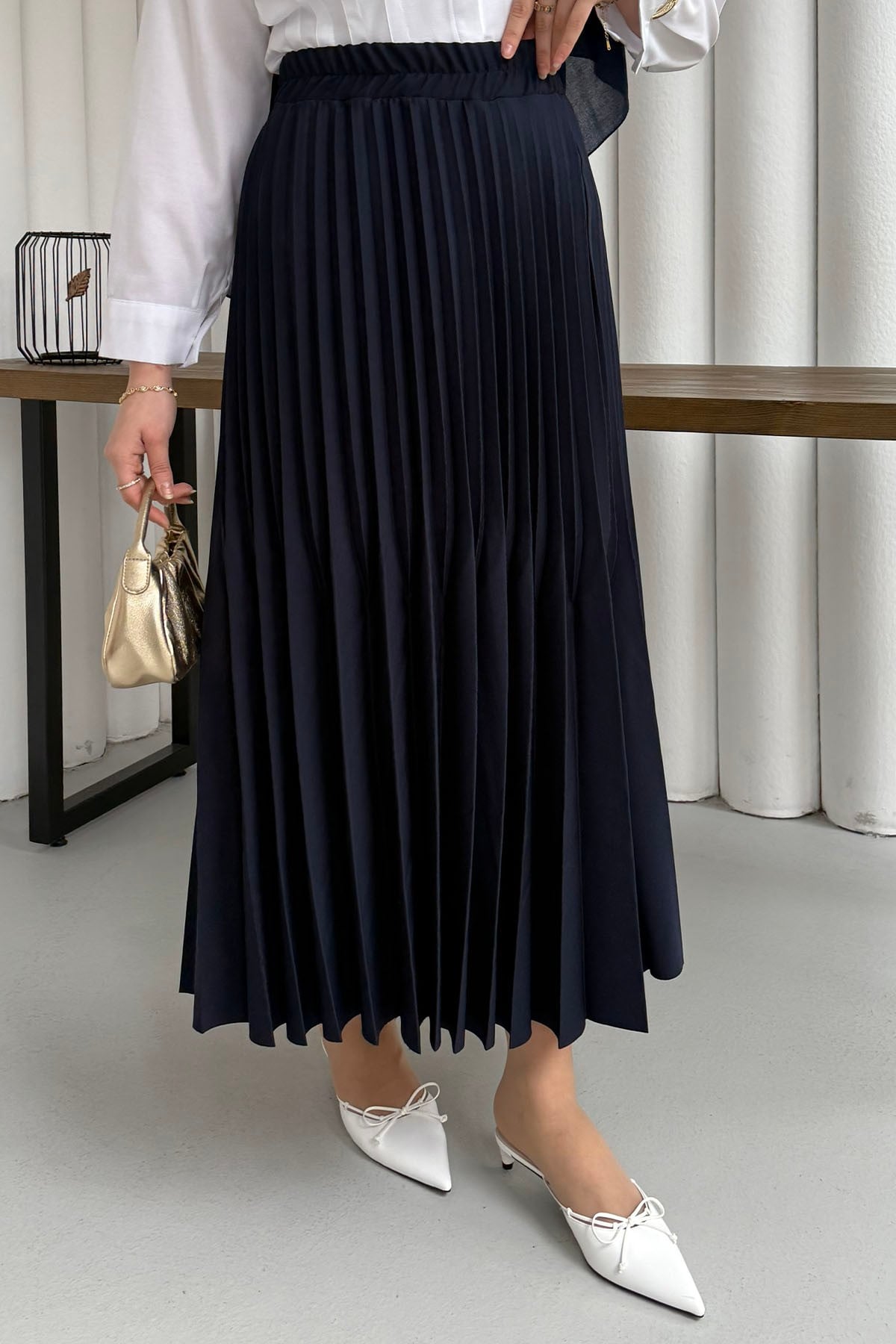 Çift Pilise Detaylı Tesettür Uzun Etek-LACİVERT (9499)