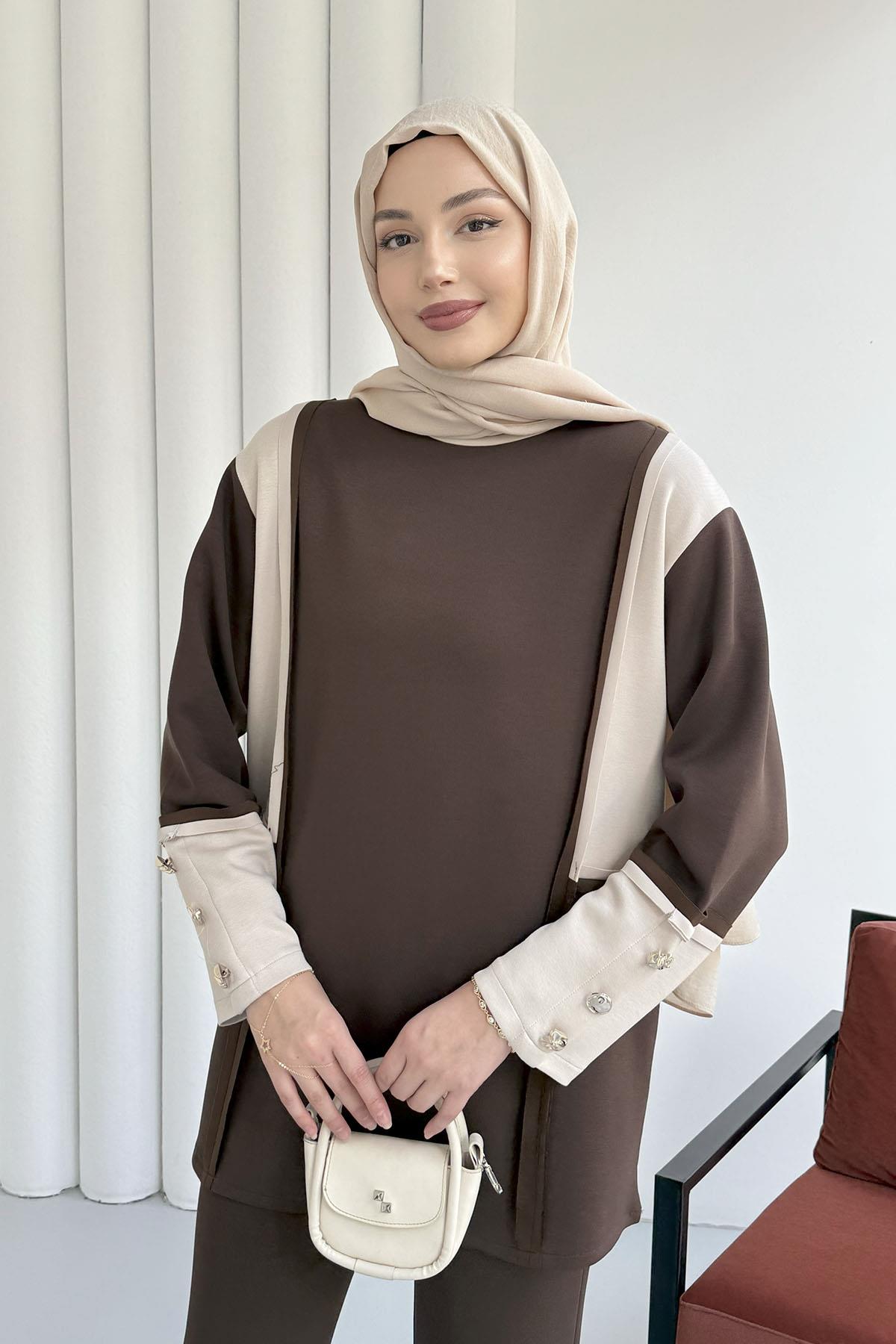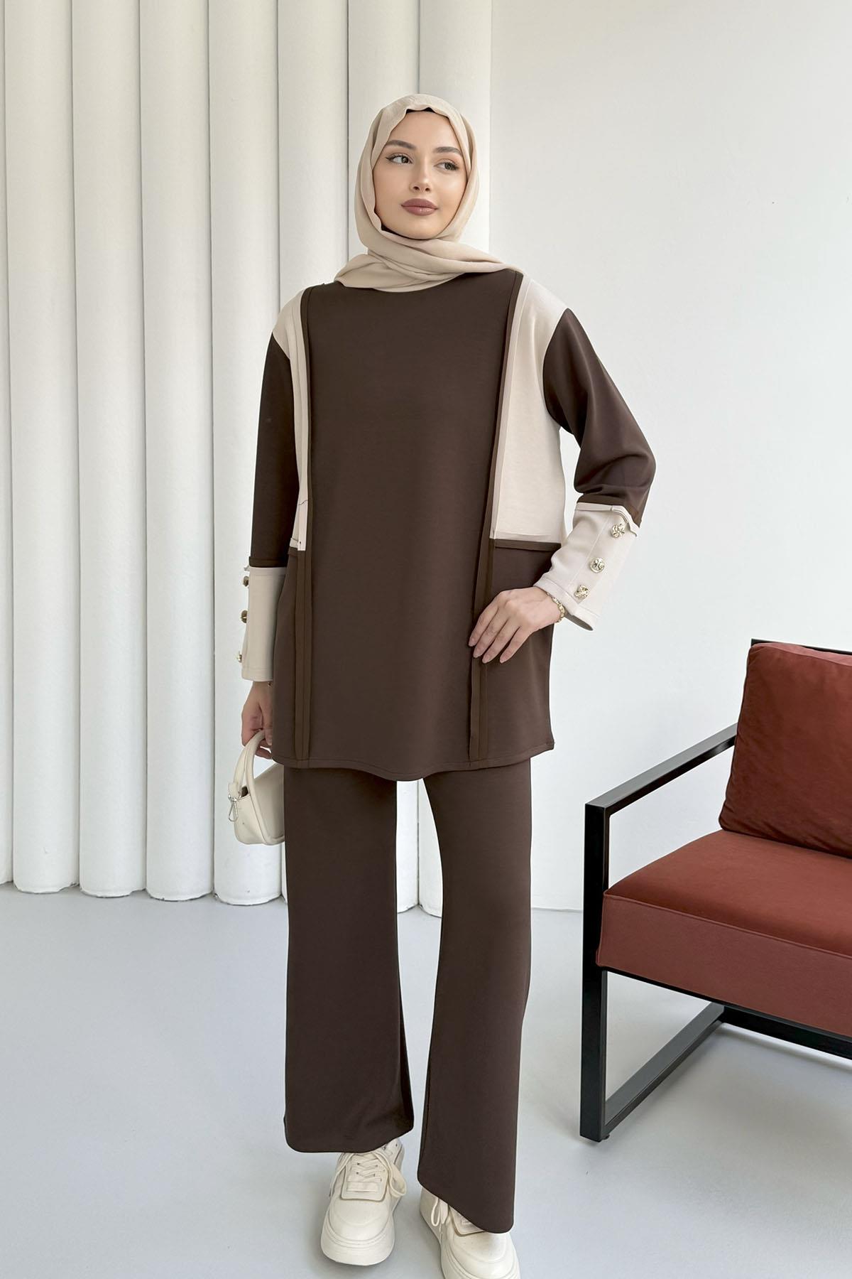 Çift Renkli Kol Düğme Detaylı Pantolonlu Tesettür Takım-KAHVERENGİ (22774)