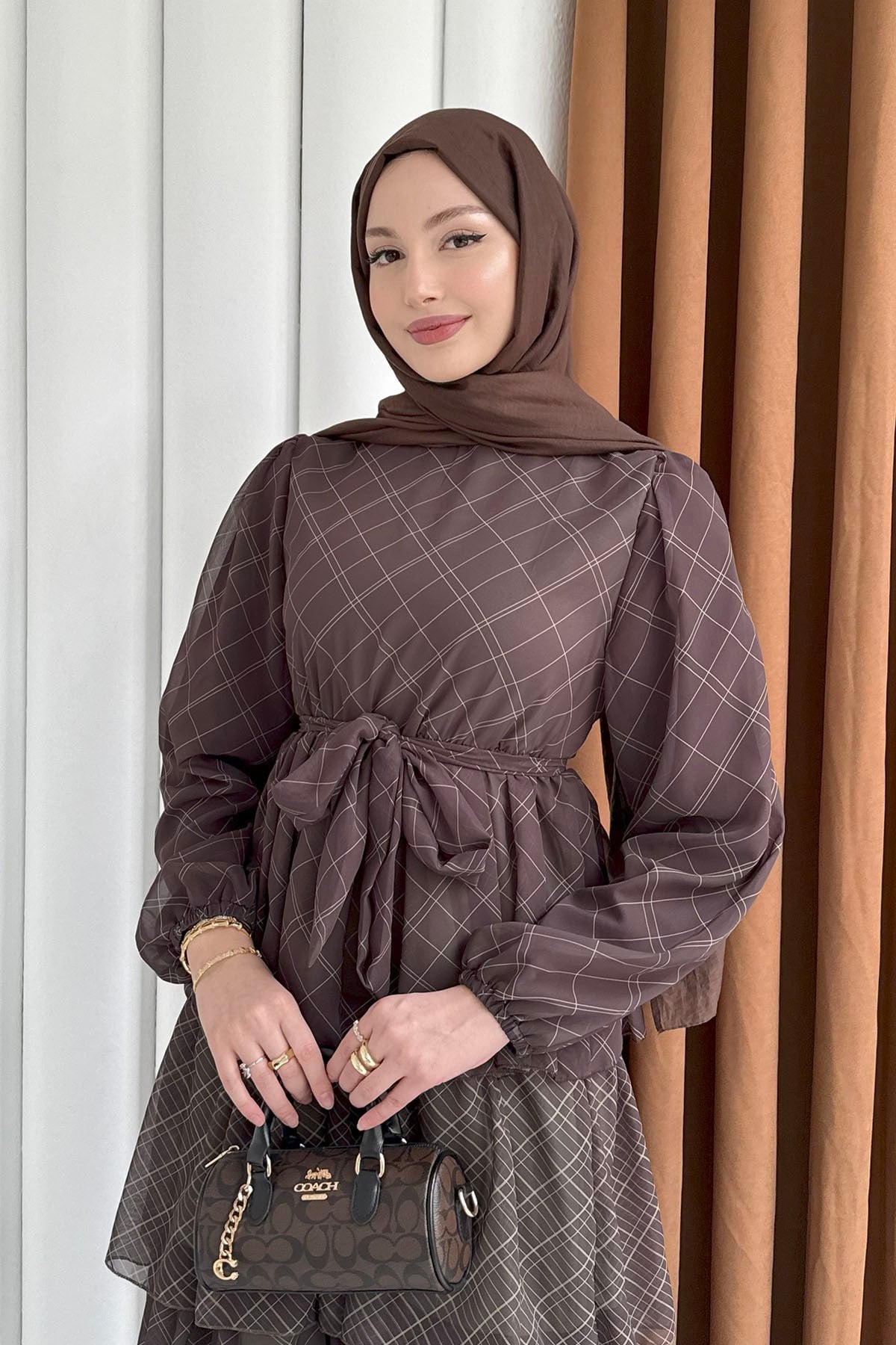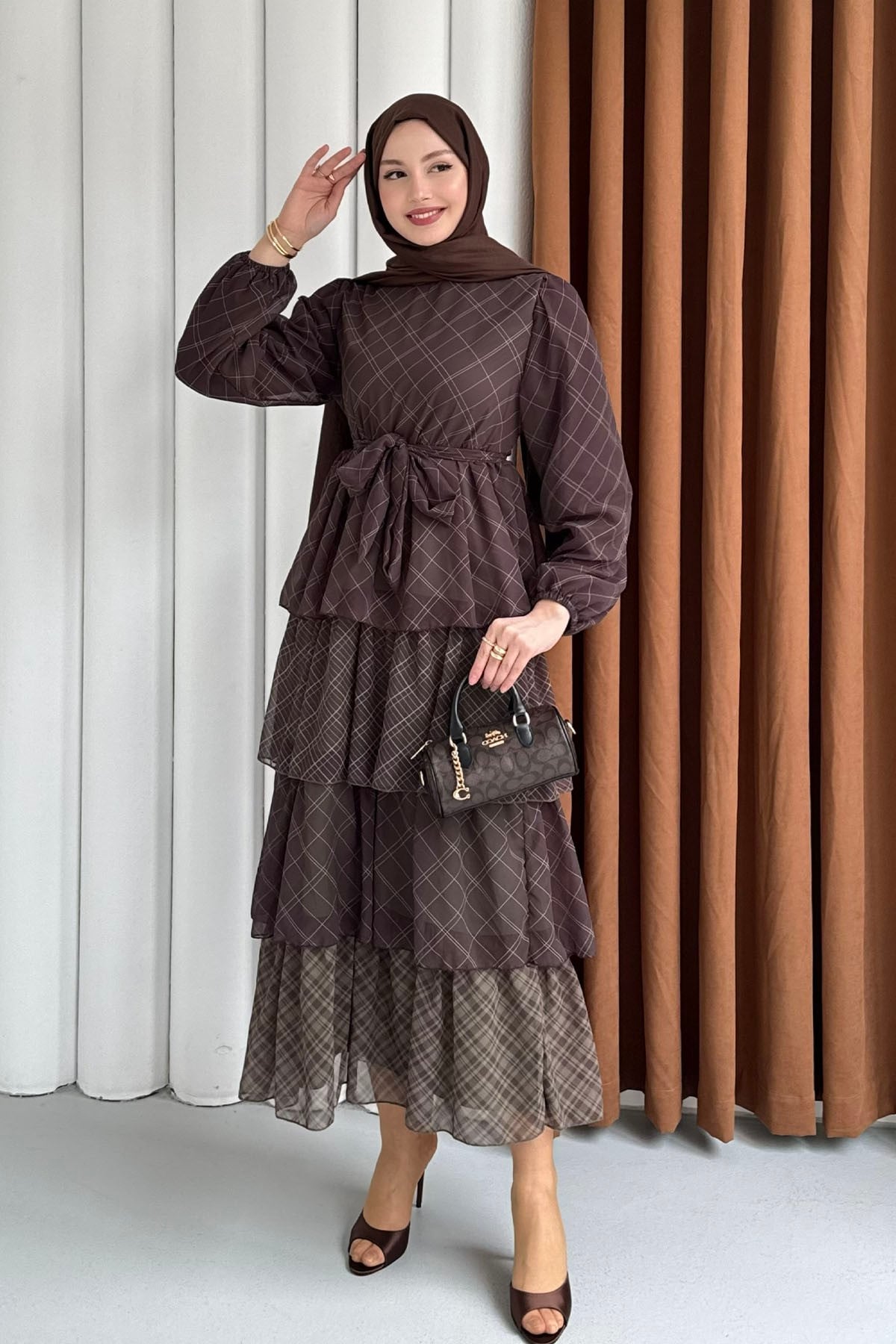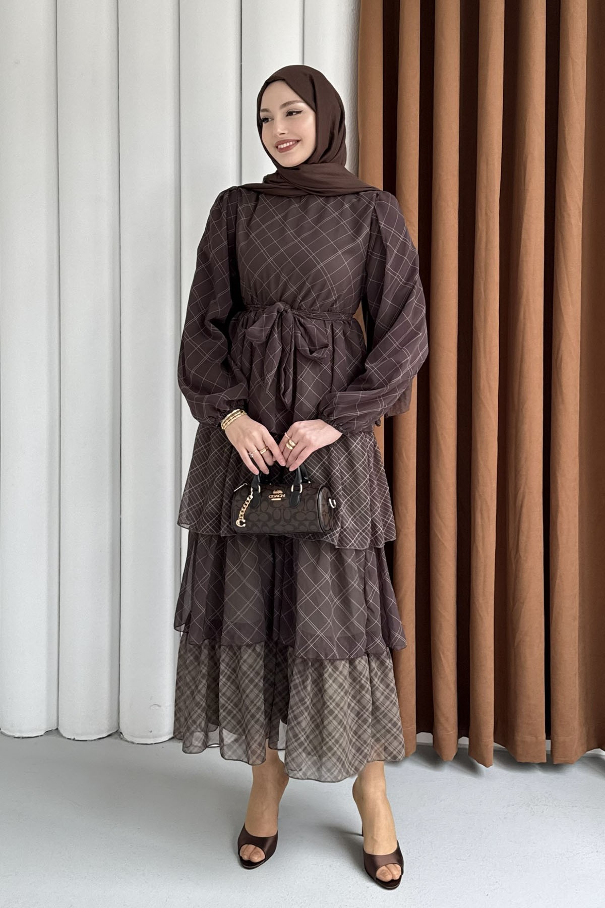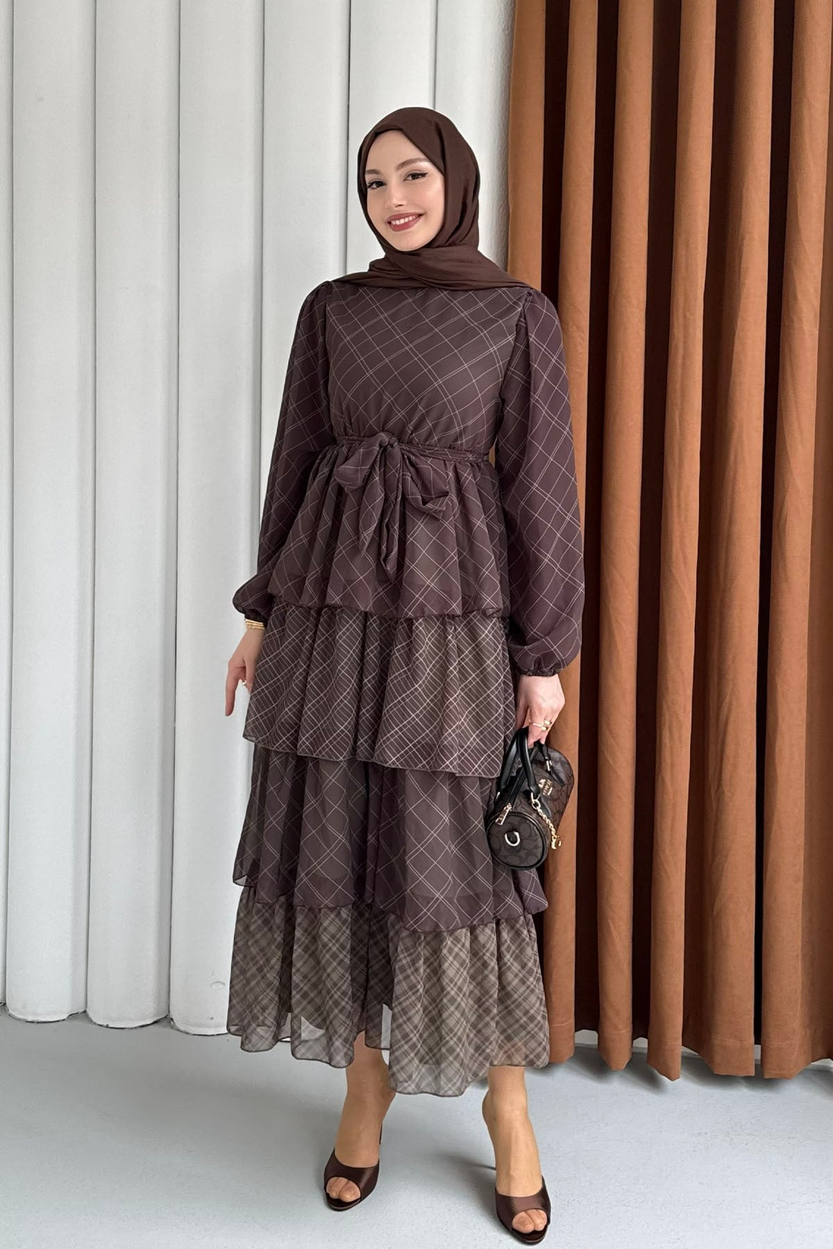 Çizgi Desenli Kat Katlı Şifon Tesettür Elbise-YEŞİL Çizgi Desenli Kat Katlı Şifon Tesettür Elbise-BORDO