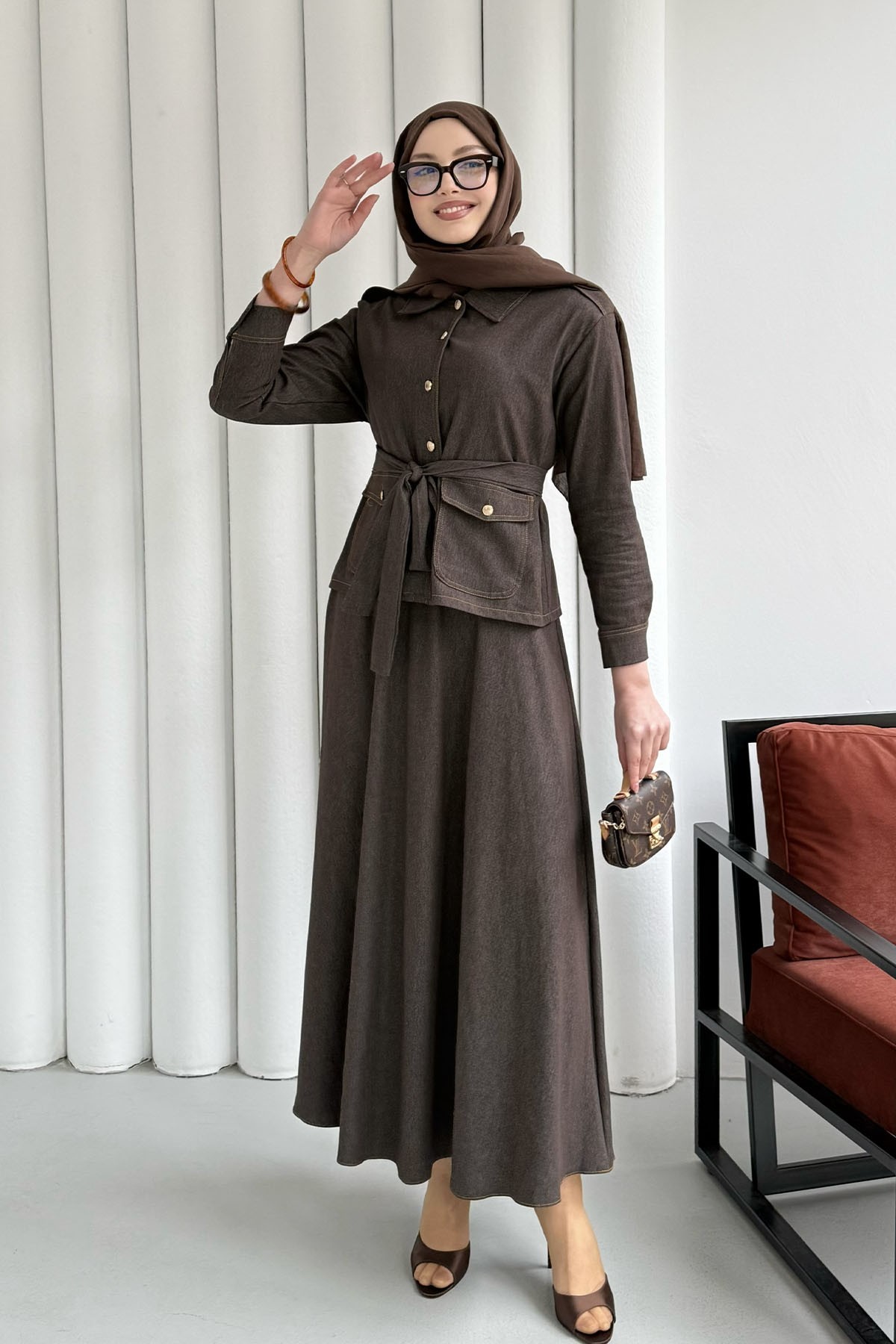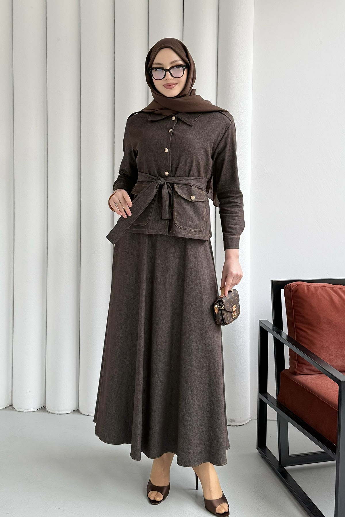 Denim Cep Detaylı Etekli Tesettür Takım-KAHVERENGİ (8704)