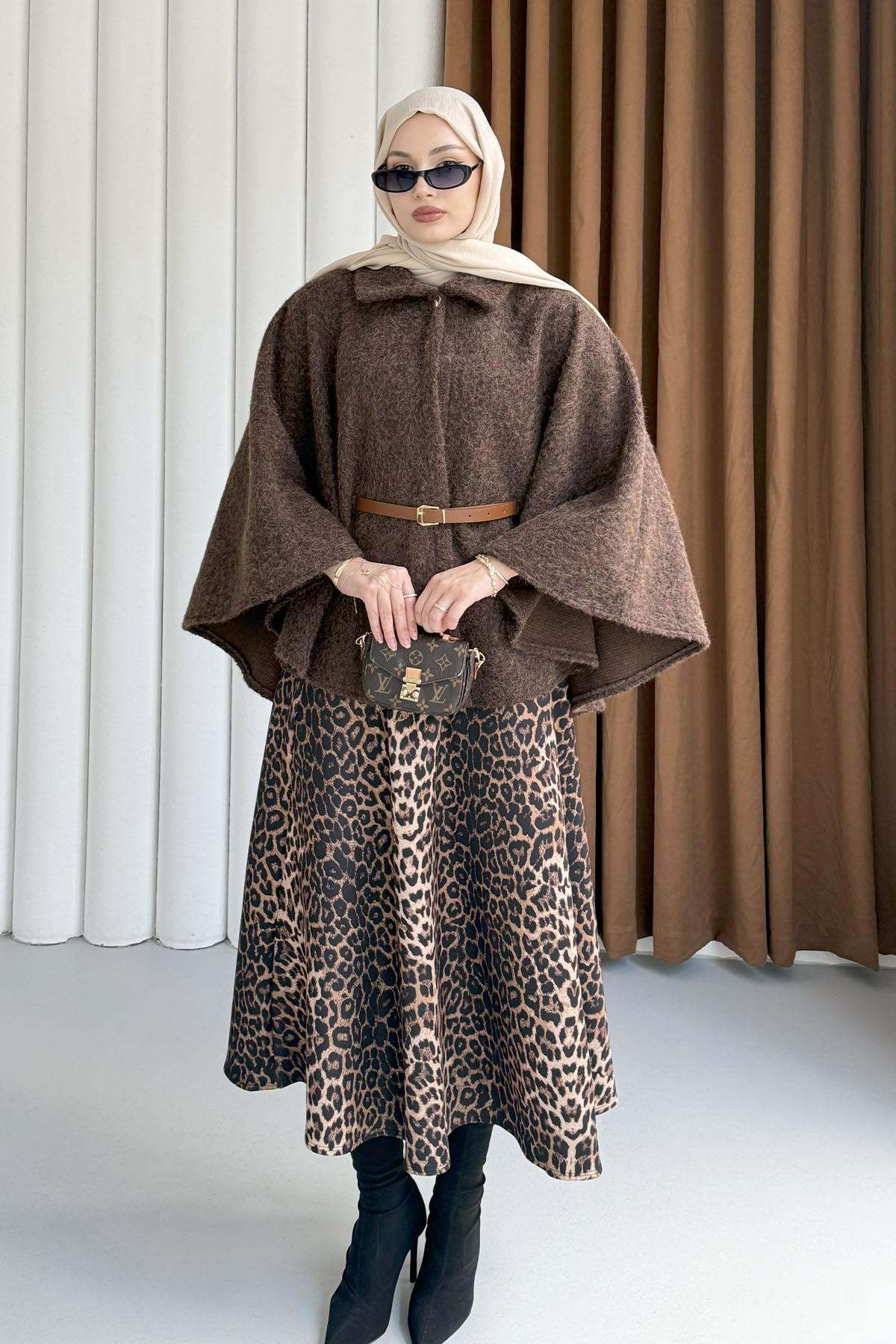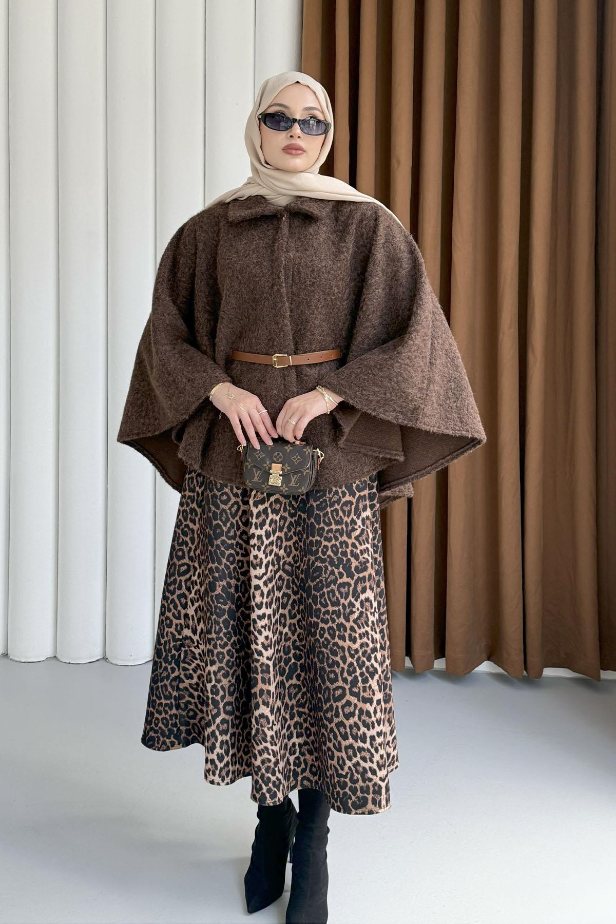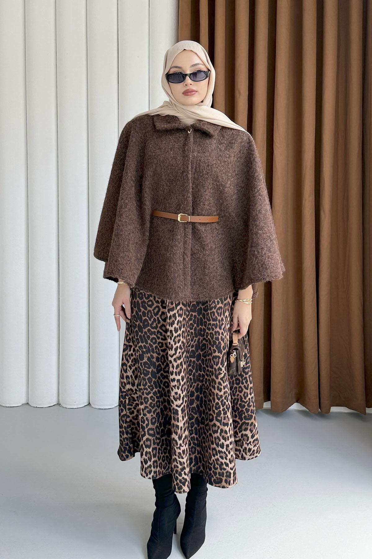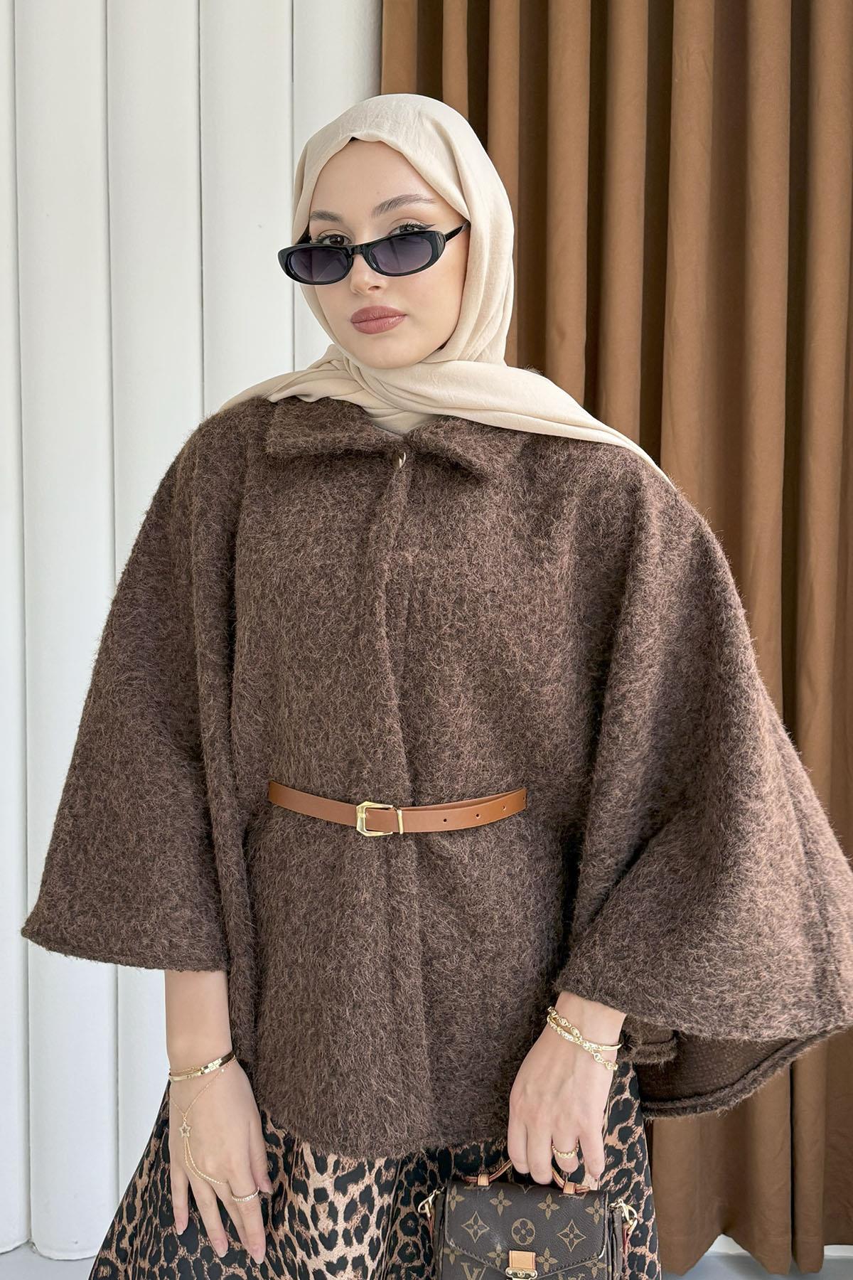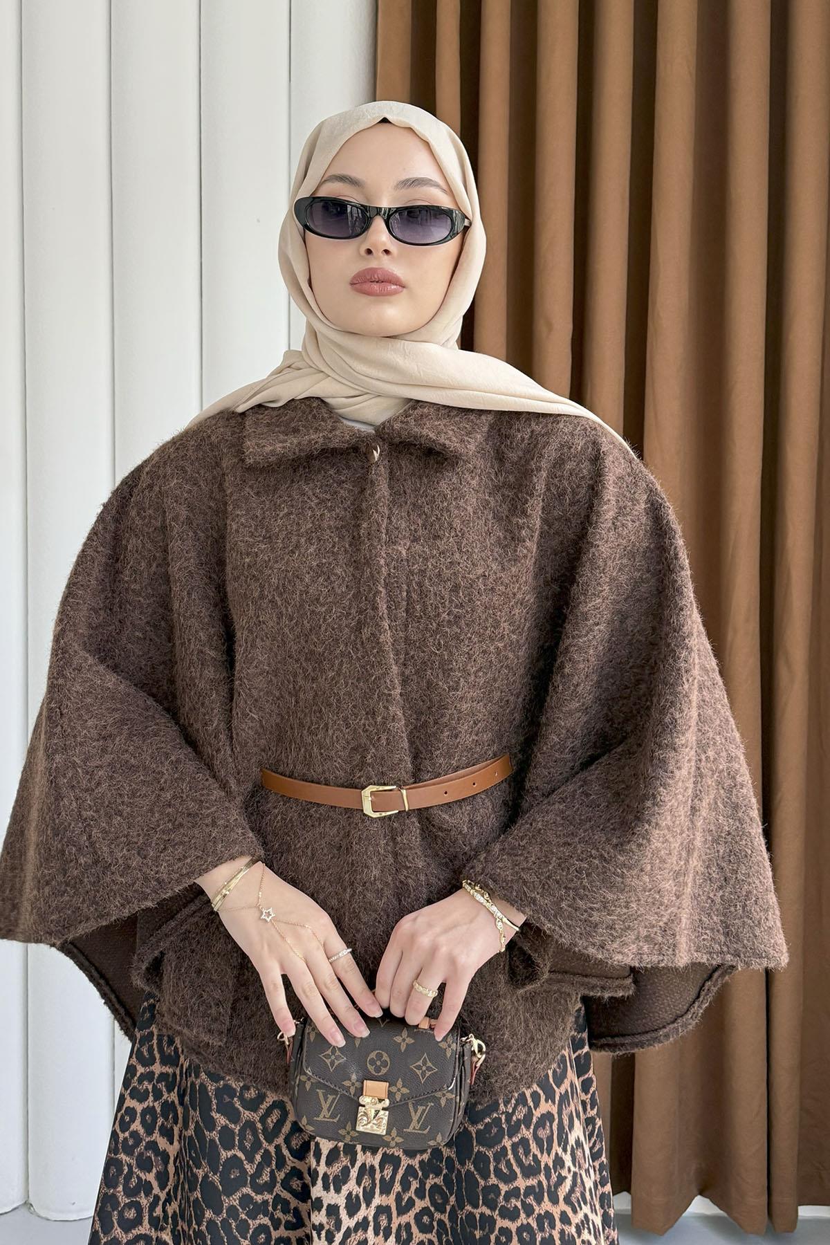 Düğmeli Kemer Detaylı Kırçıllı Kaşe Pelerin Panço-ACI KAHVE (8928)