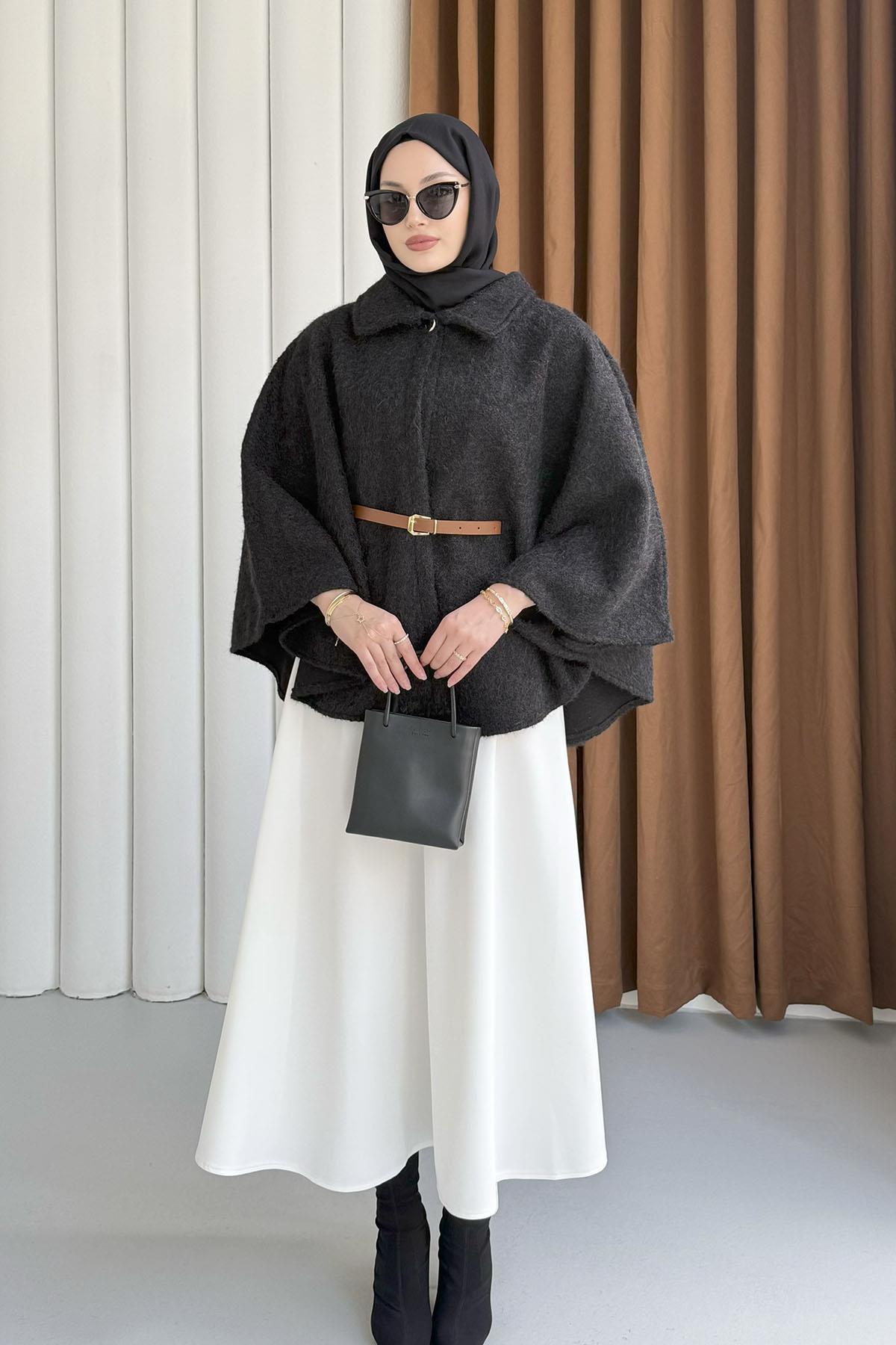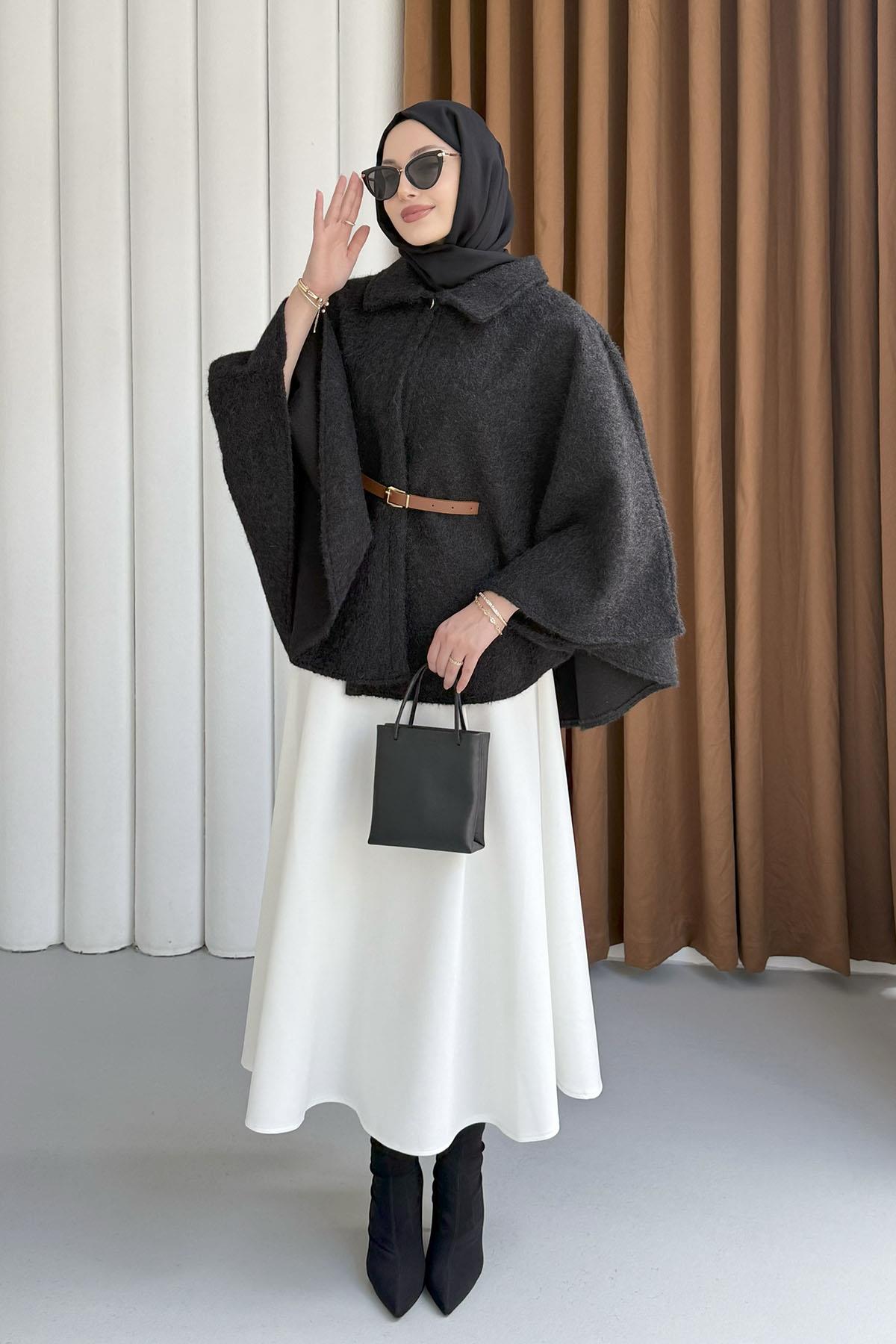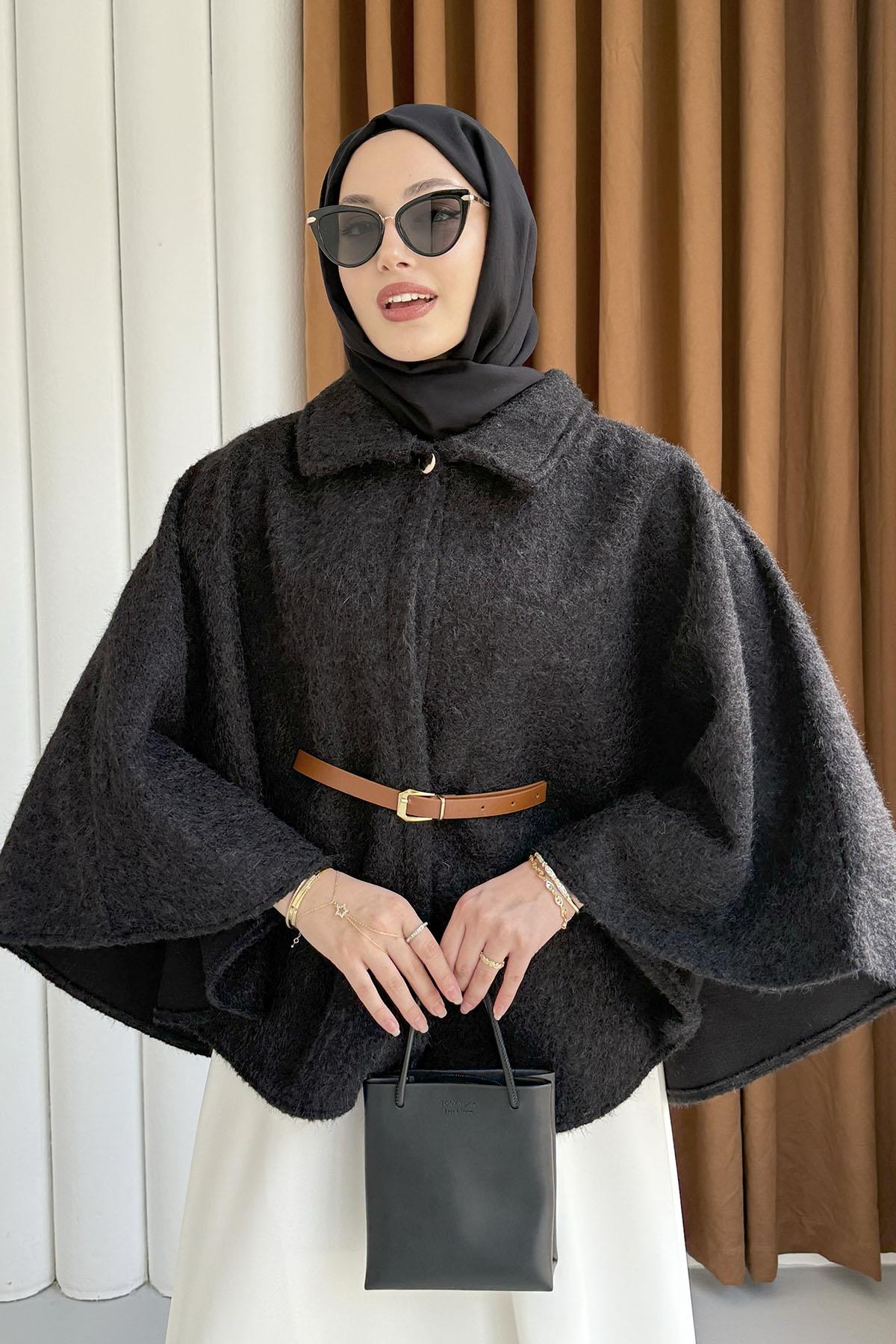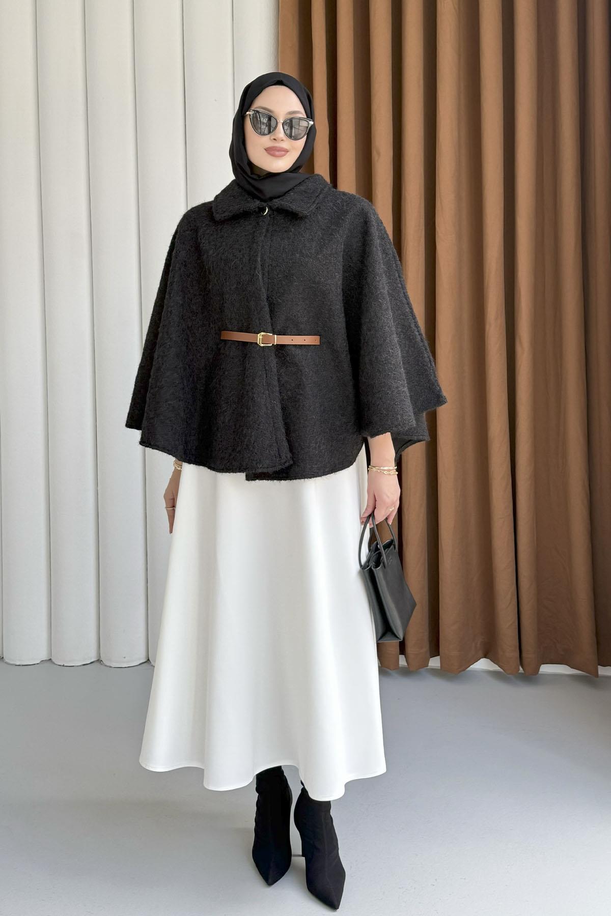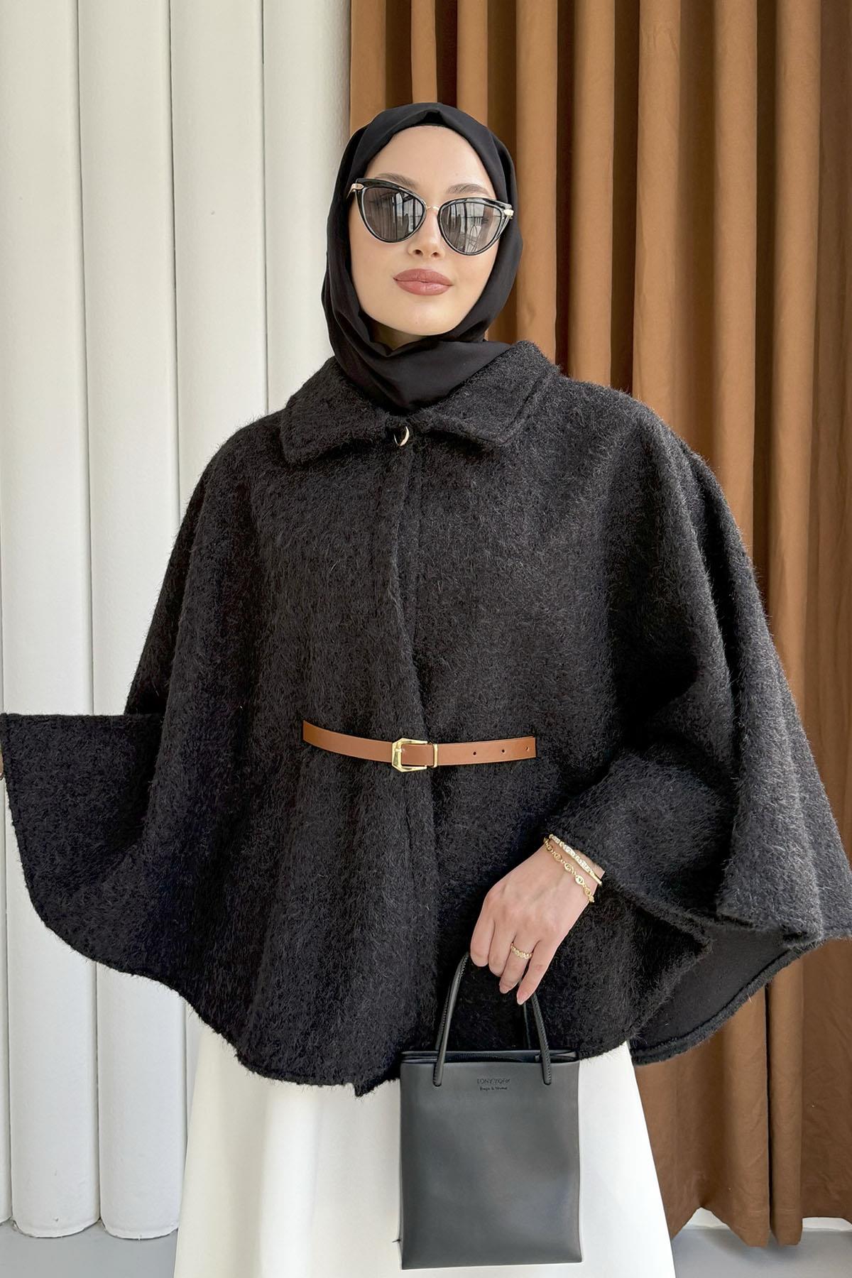 Düğmeli Kemer Detaylı Kırçıllı Kaşe Pelerin Panço-SİYAH (8928)