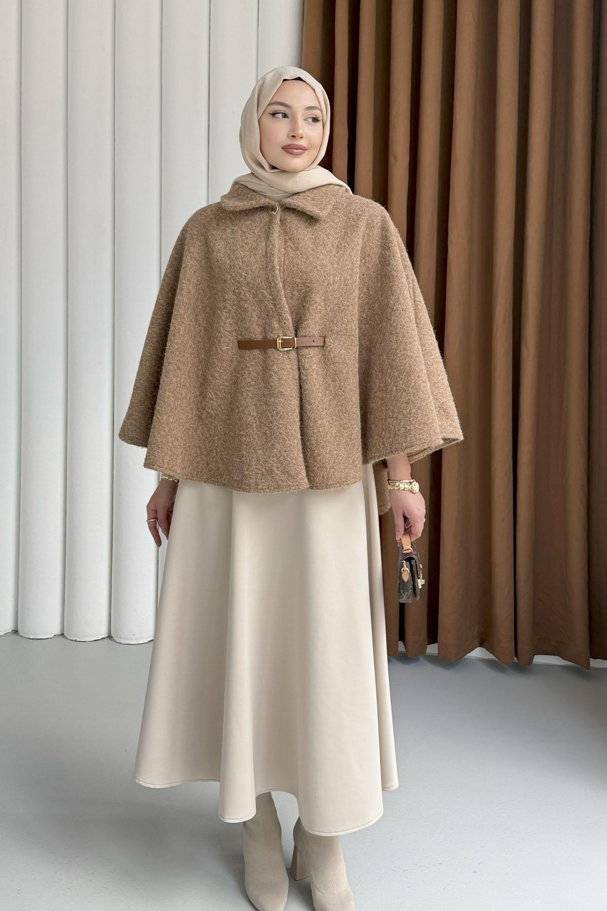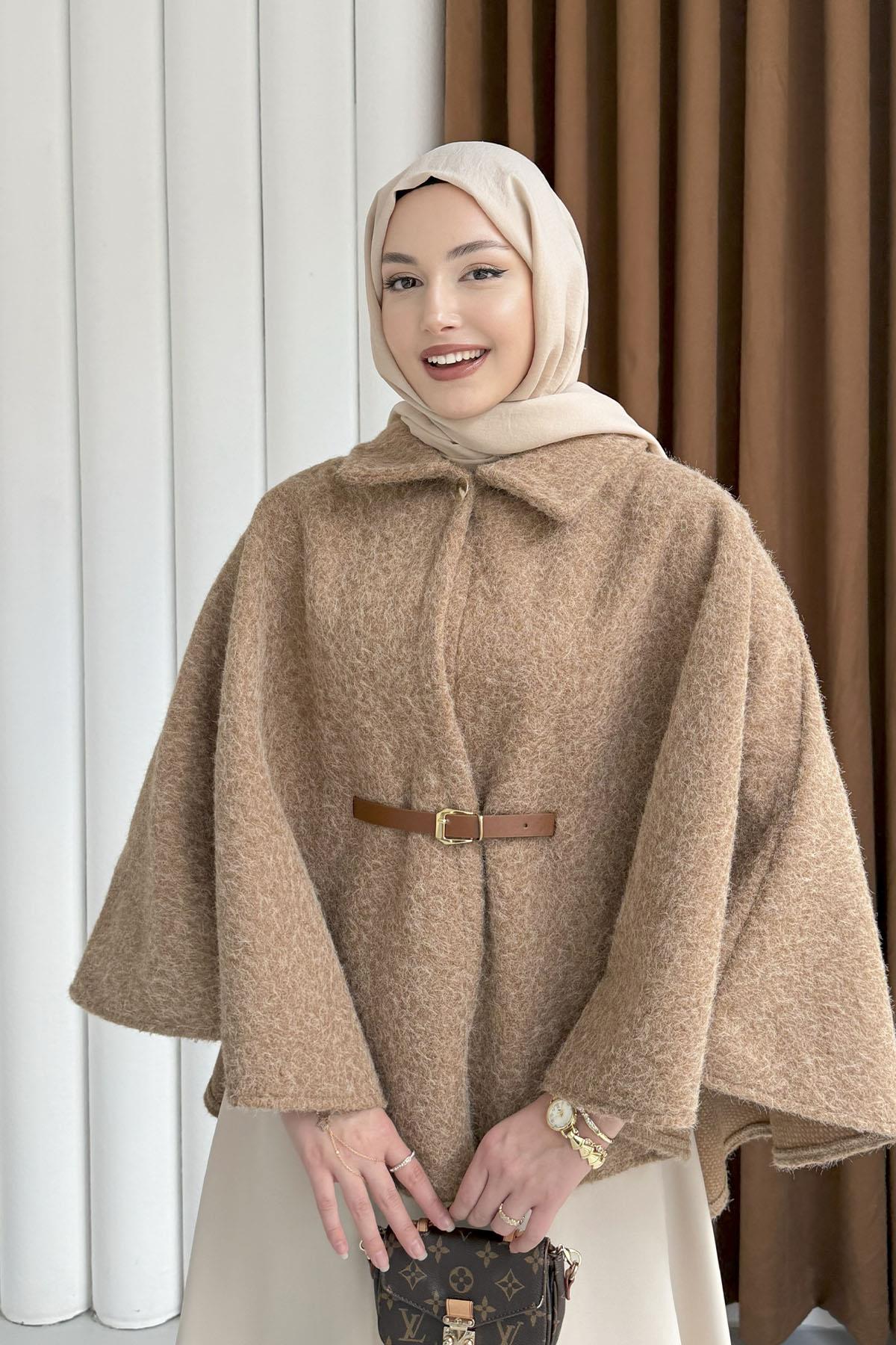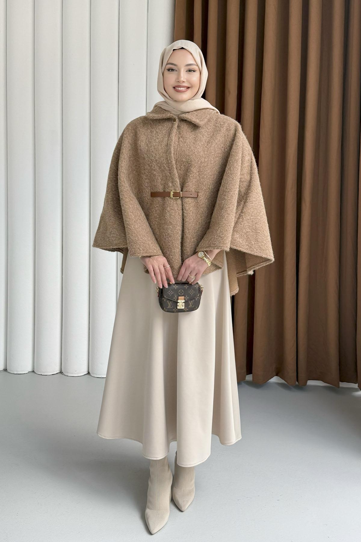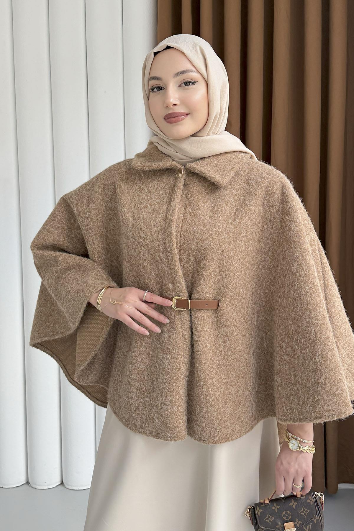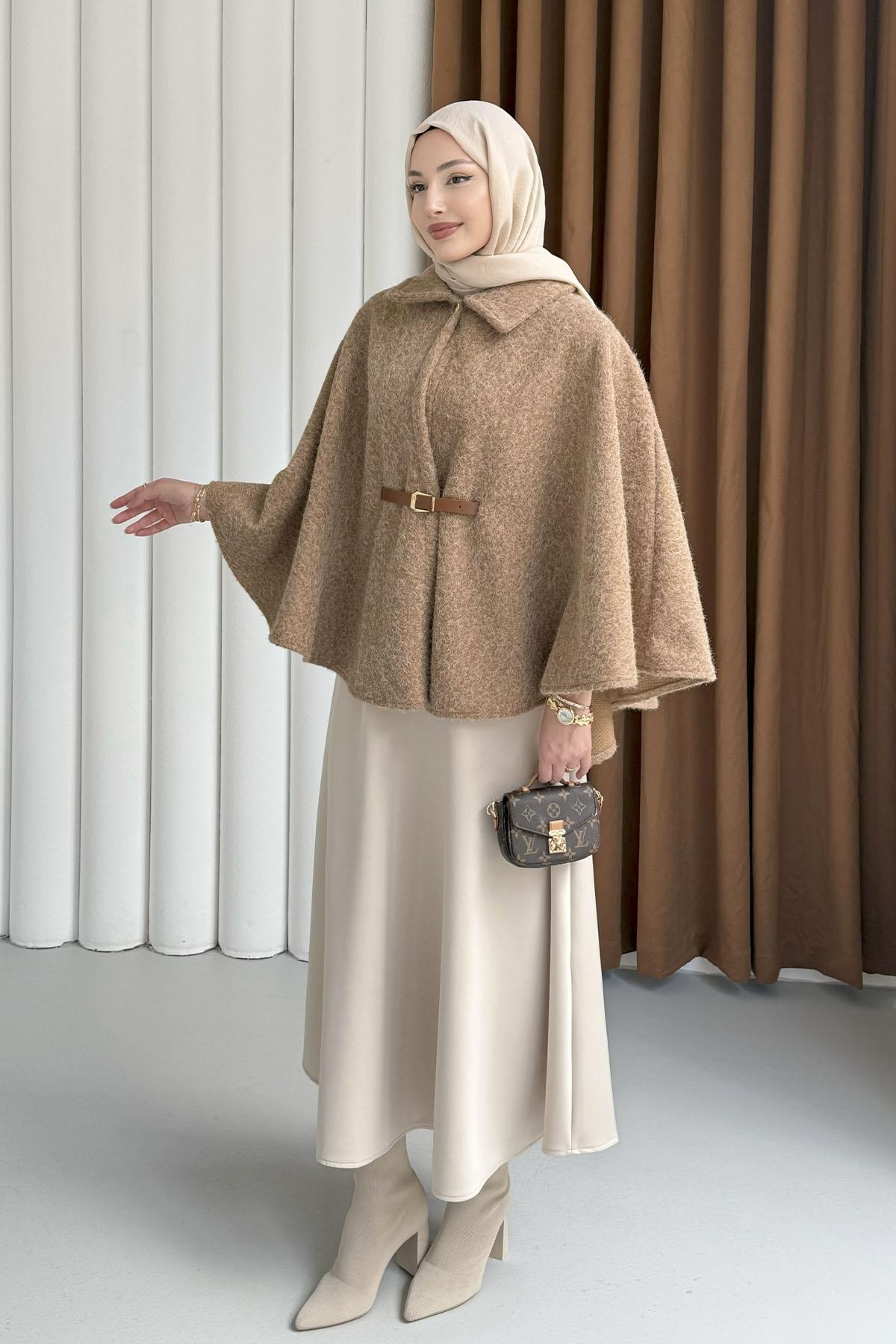 Düğmeli Kemer Detaylı Kırçıllı Kaşe Pelerin Panço-TOPRAK (8928)