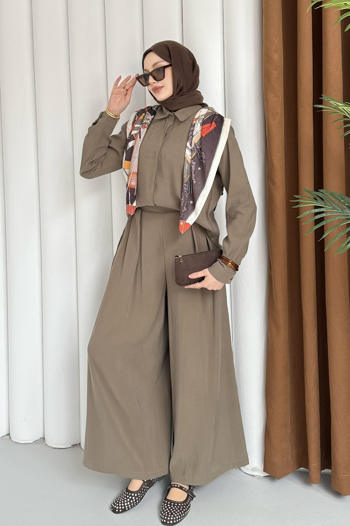 Efsun Şal Detaylı Pantolon Tesettür Takım-HAKİ YEŞİL (8974)