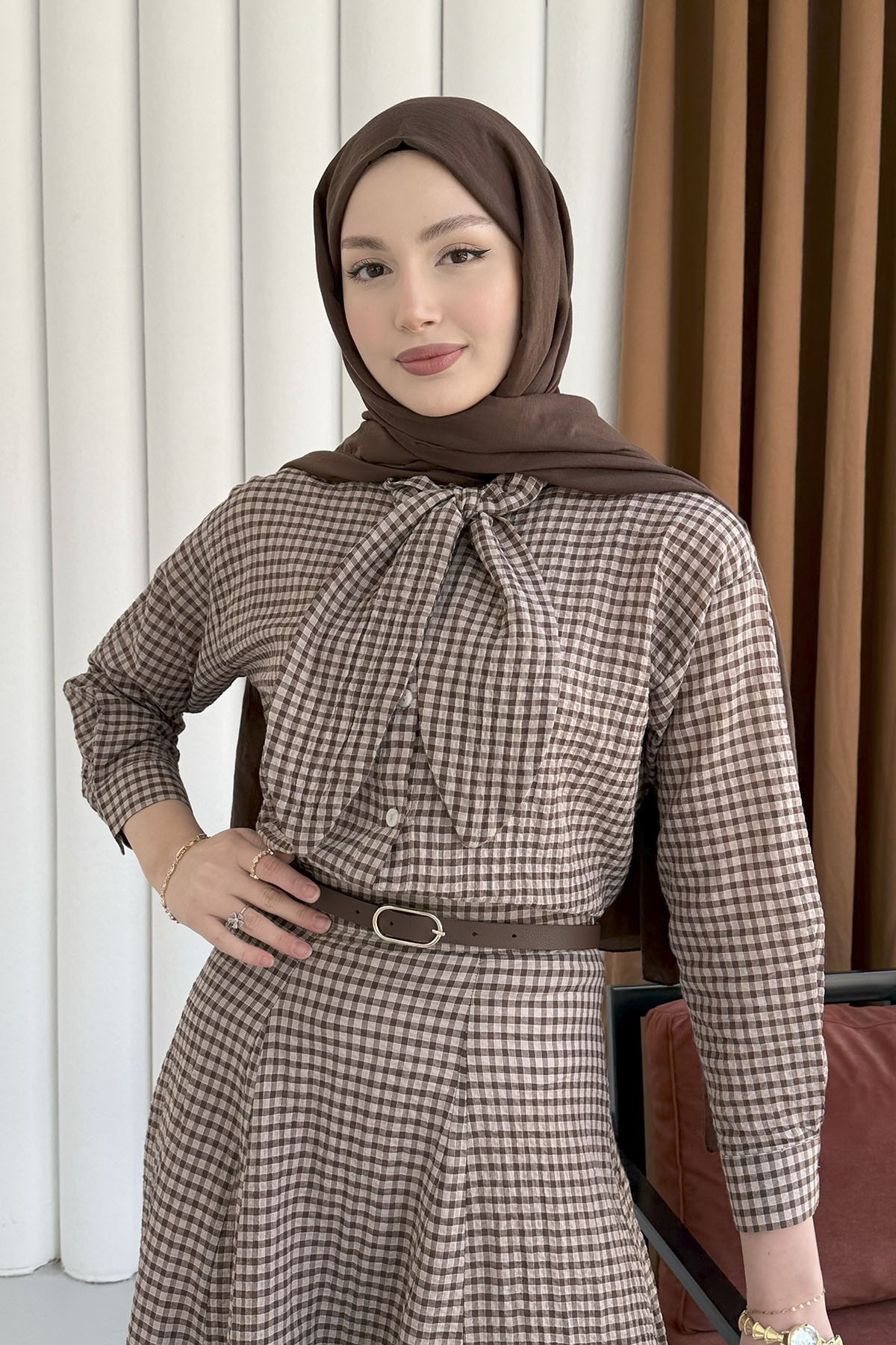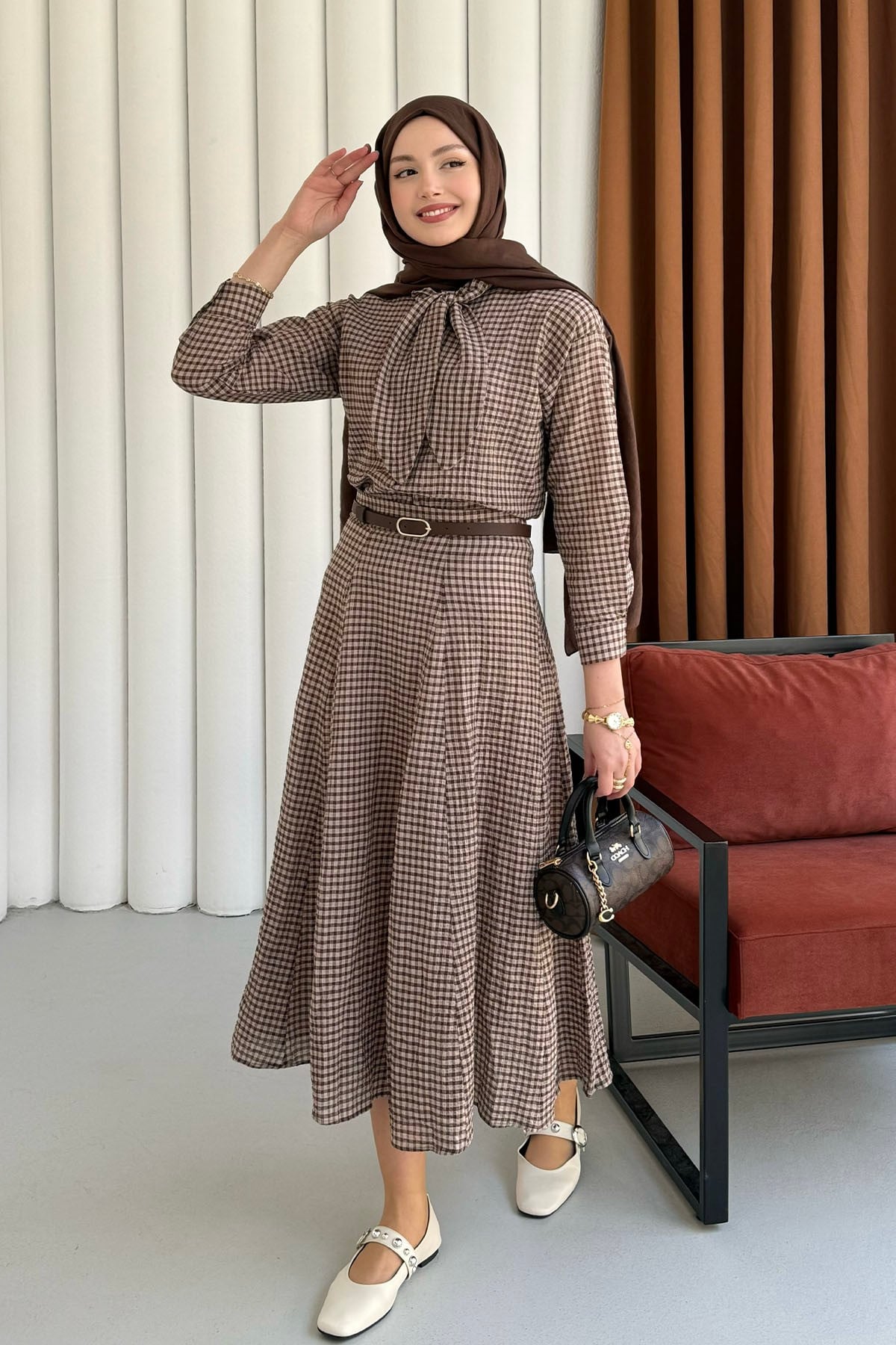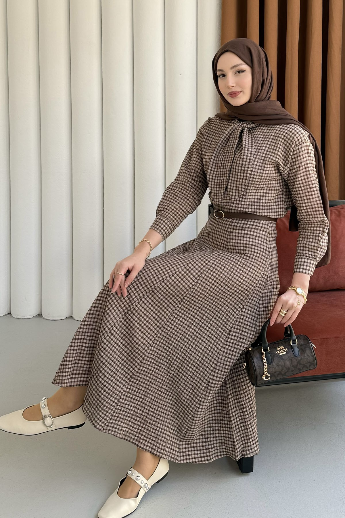 Ekose Kumaş Fular Yaka Etekli Tesettür Takım-KAHVERENGİ (3097)