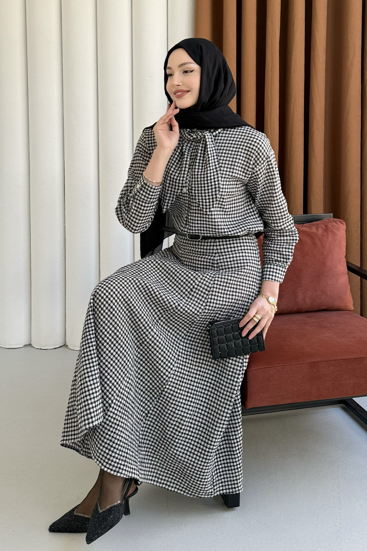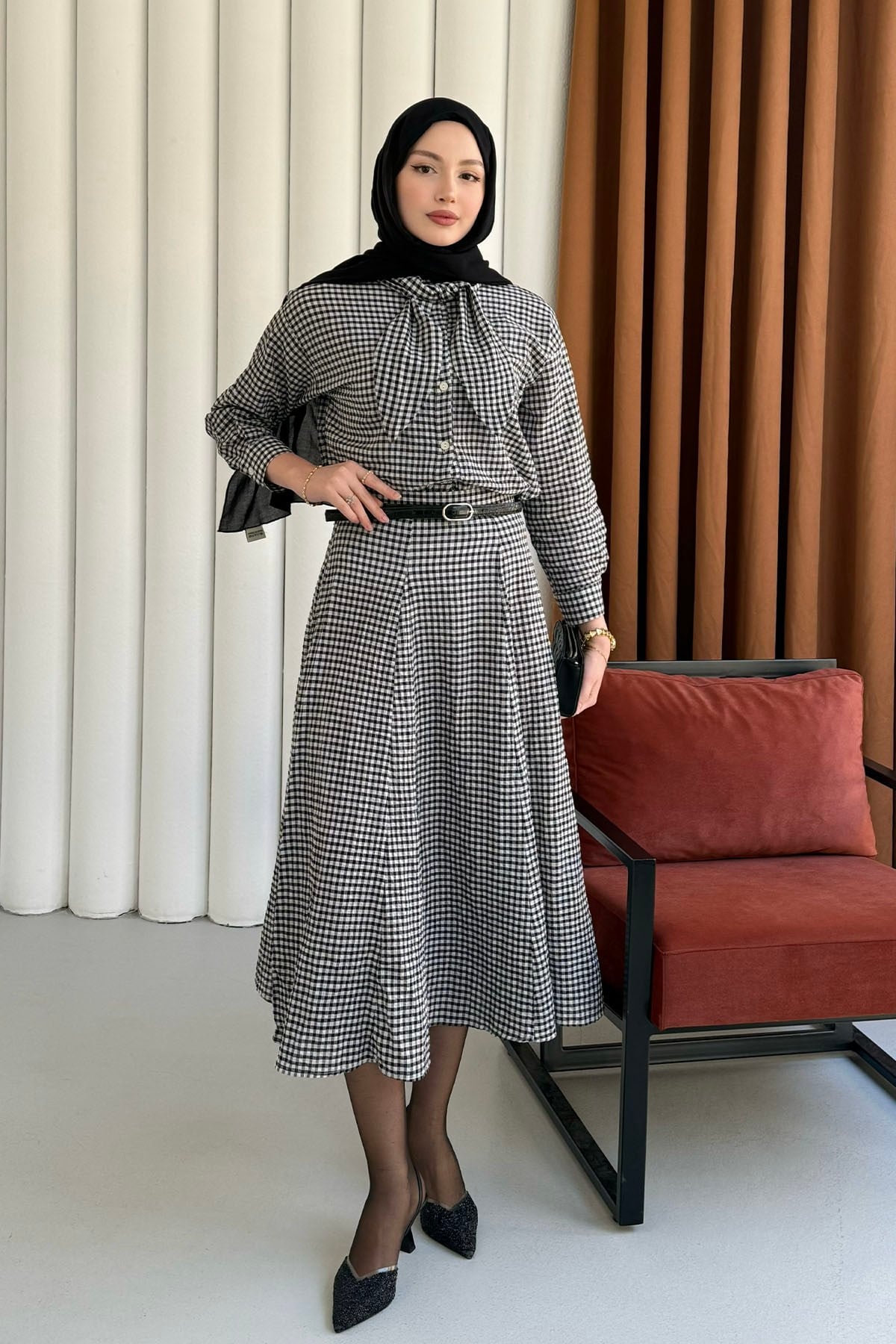 Ekose Kumaş Fular Yaka Etekli Tesettür Takım-KAHVERENGİ Ekose Kumaş Fular Yaka Etekli Tesettür Takım-SİYAH