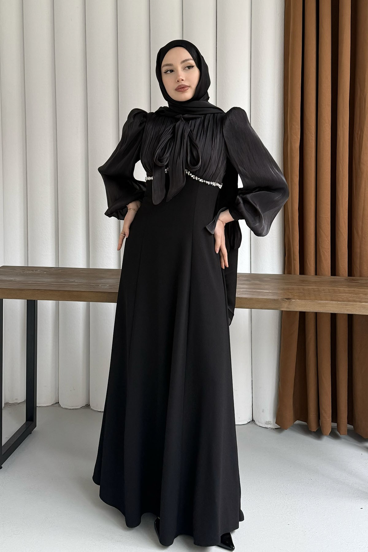 Elegance Taş Detaylı Balon Kol Tesettür Abiye-SİYAH (5570)