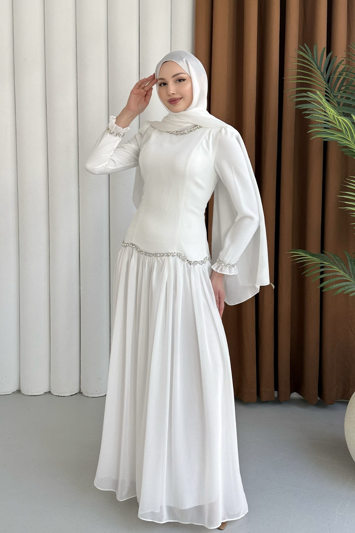 Elira Bel Ve Kol Taş İşlemeli Etek Şifon Tesettür Abiye-BEYAZ (5521)