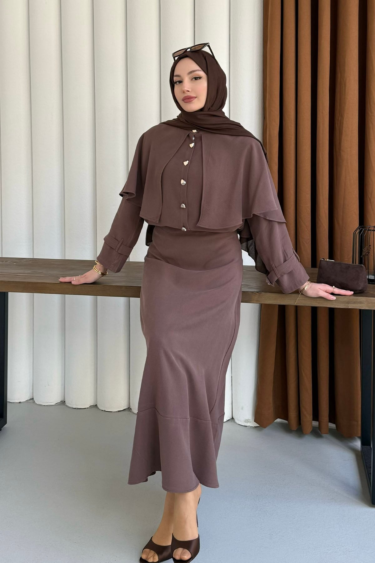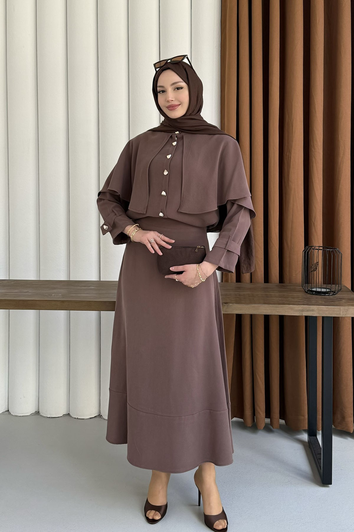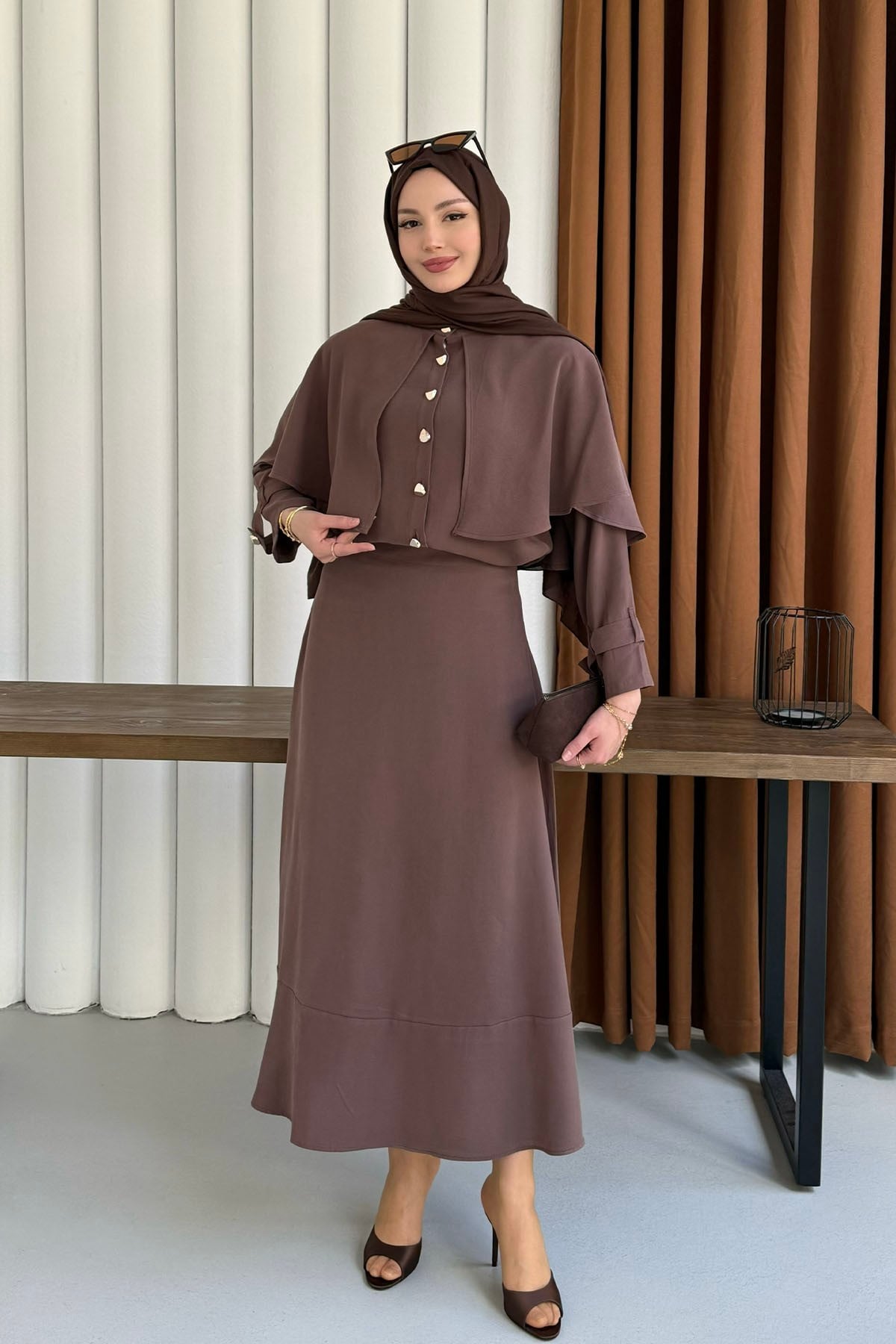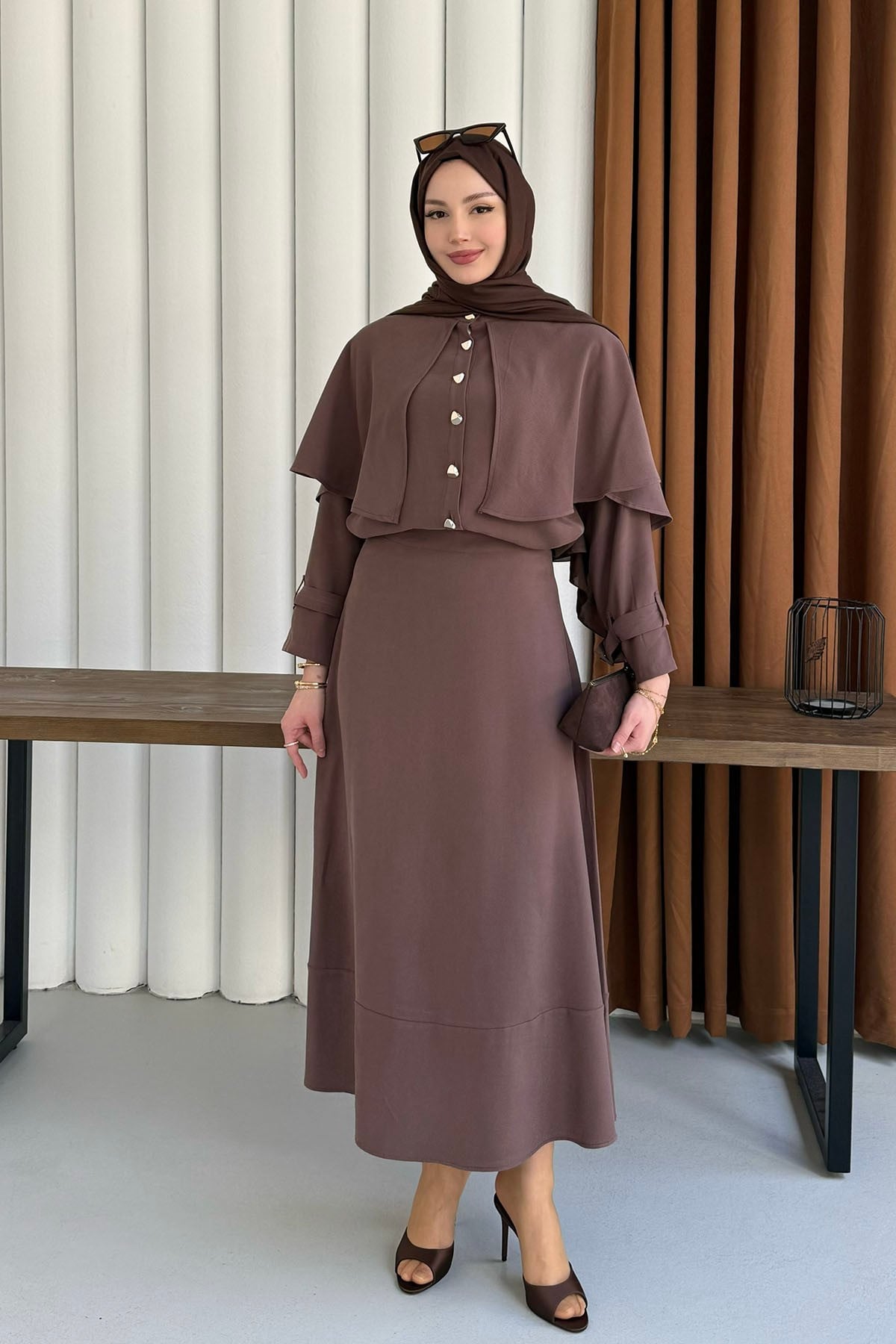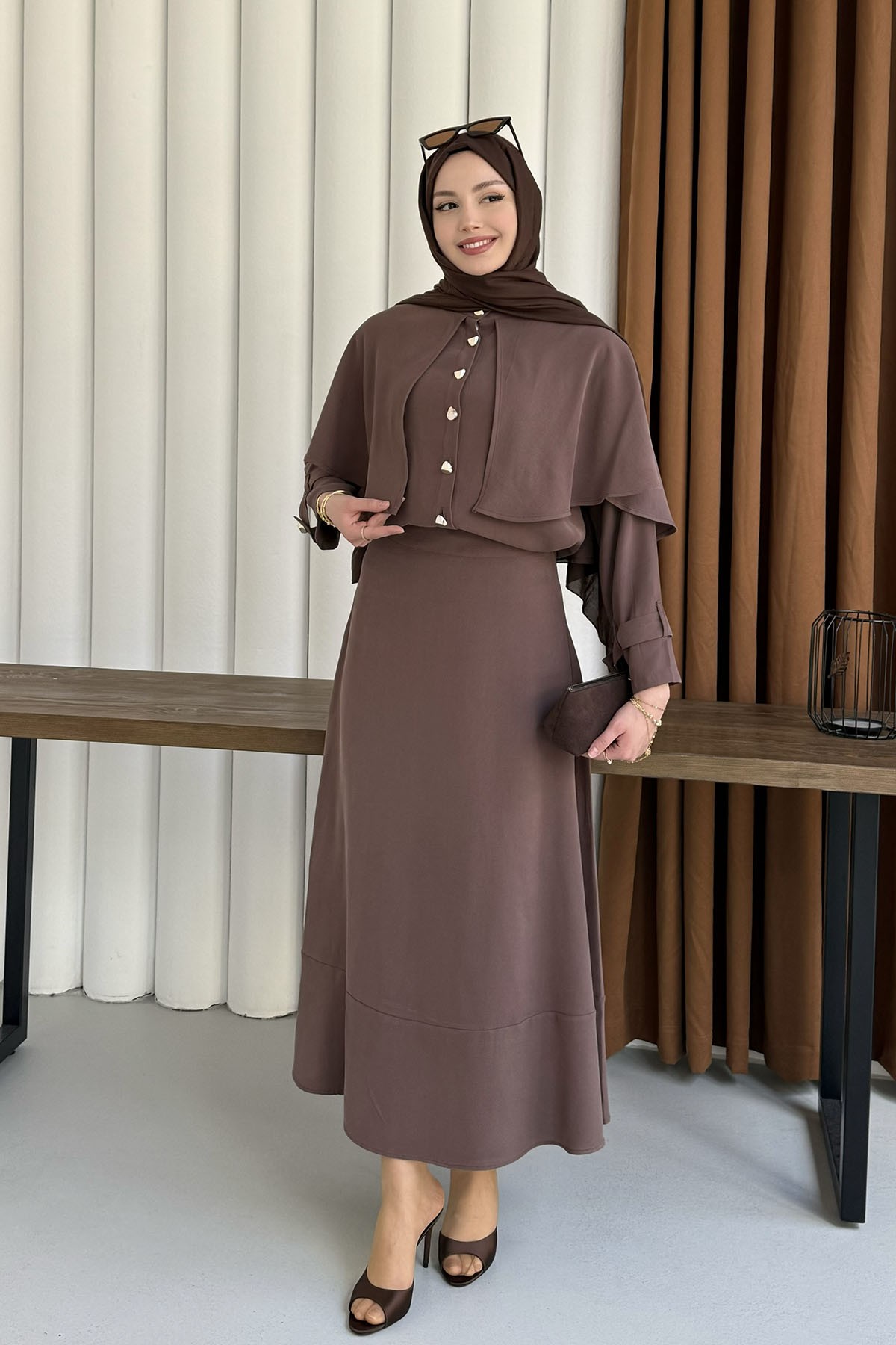 Elyra Kendinden Pelerinli Gold Düğmeli Tesettür Takım-KAHVERENGİ (3105)