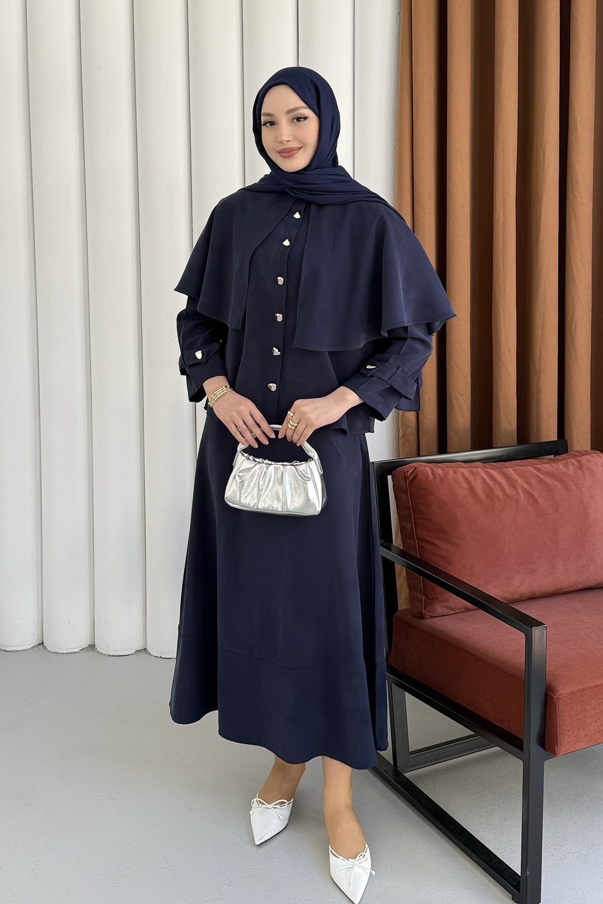 Elyra Kendinden Pelerinli Gold Düğmeli Tesettür Takım-LACİVERT (3105)