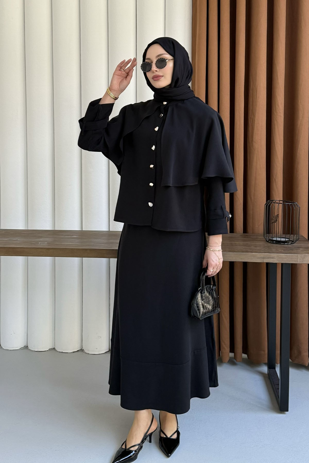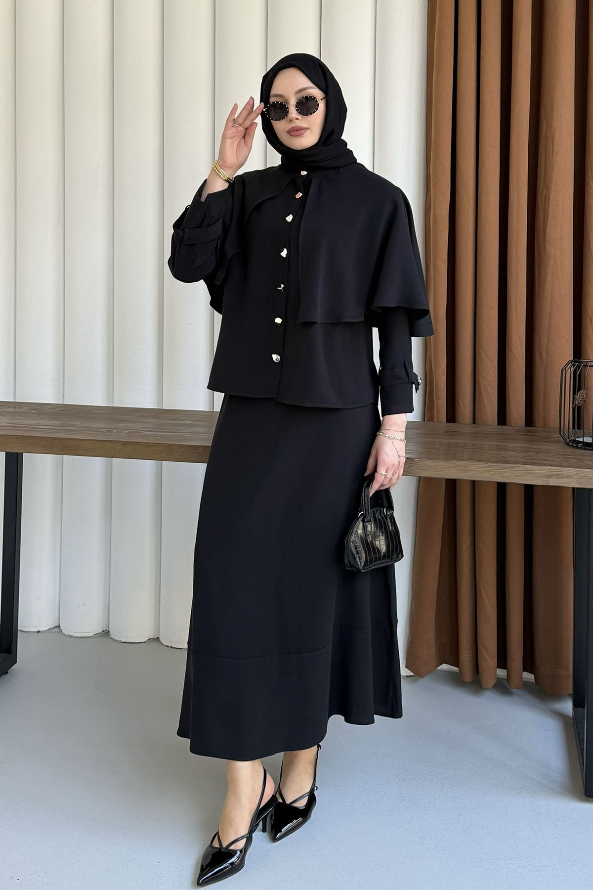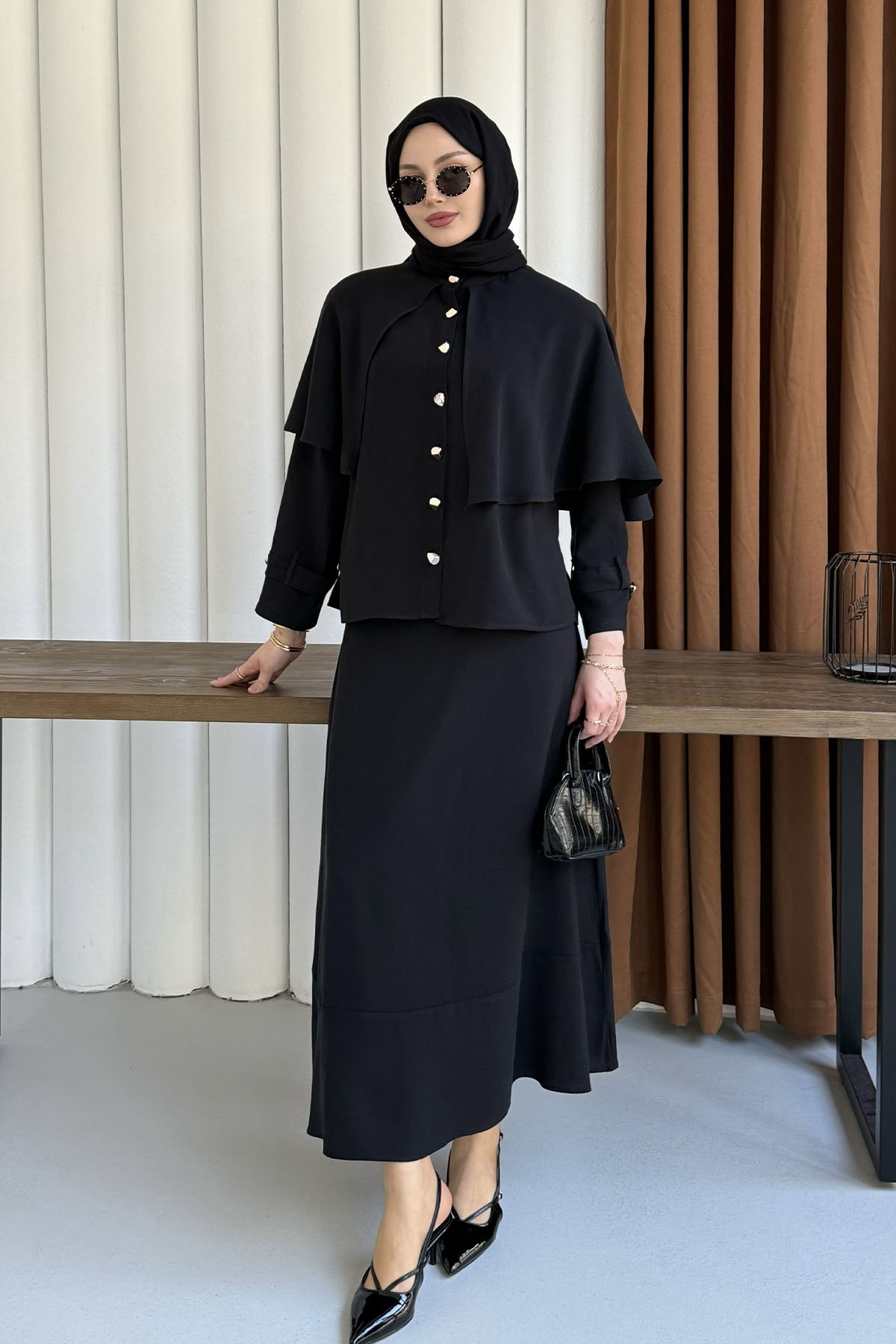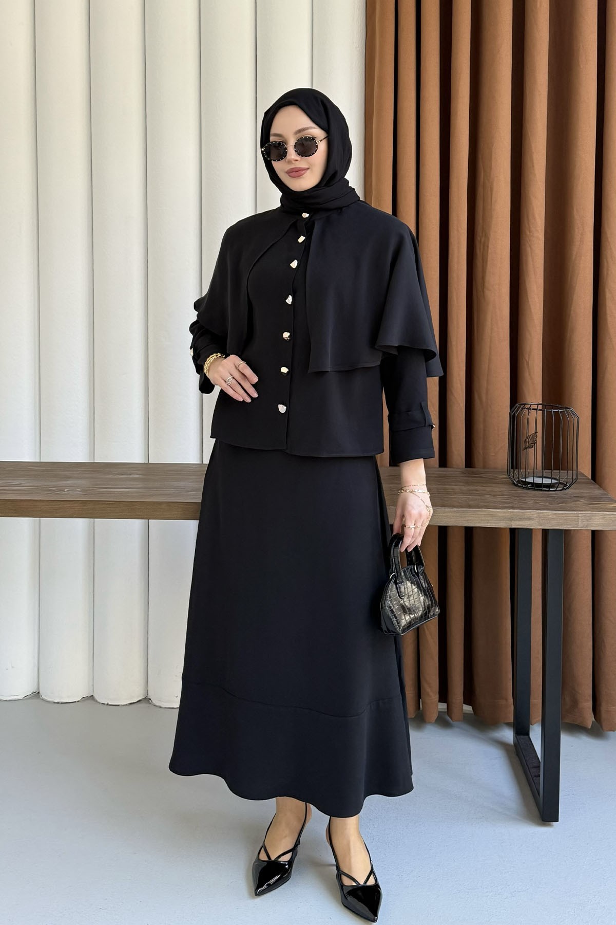 Elyra Kendinden Pelerinli Gold Düğmeli Tesettür Takım-SİYAH (3105)