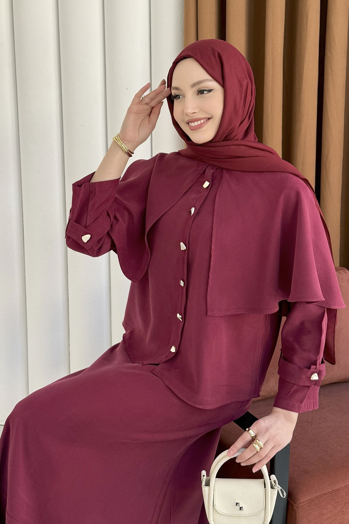 Elyra Kendinden Pelerinli Gold Düğmeli Tesettür Takım-VİŞNE RENGİ (3105)