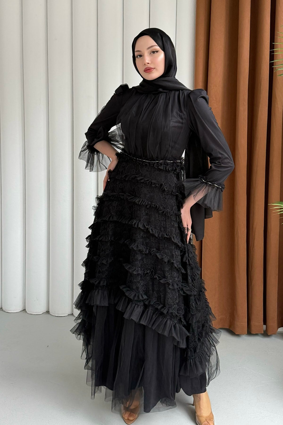 Etek Dantel Detaylı Kat Kat Tesettür Abiye-SİYAH (125)