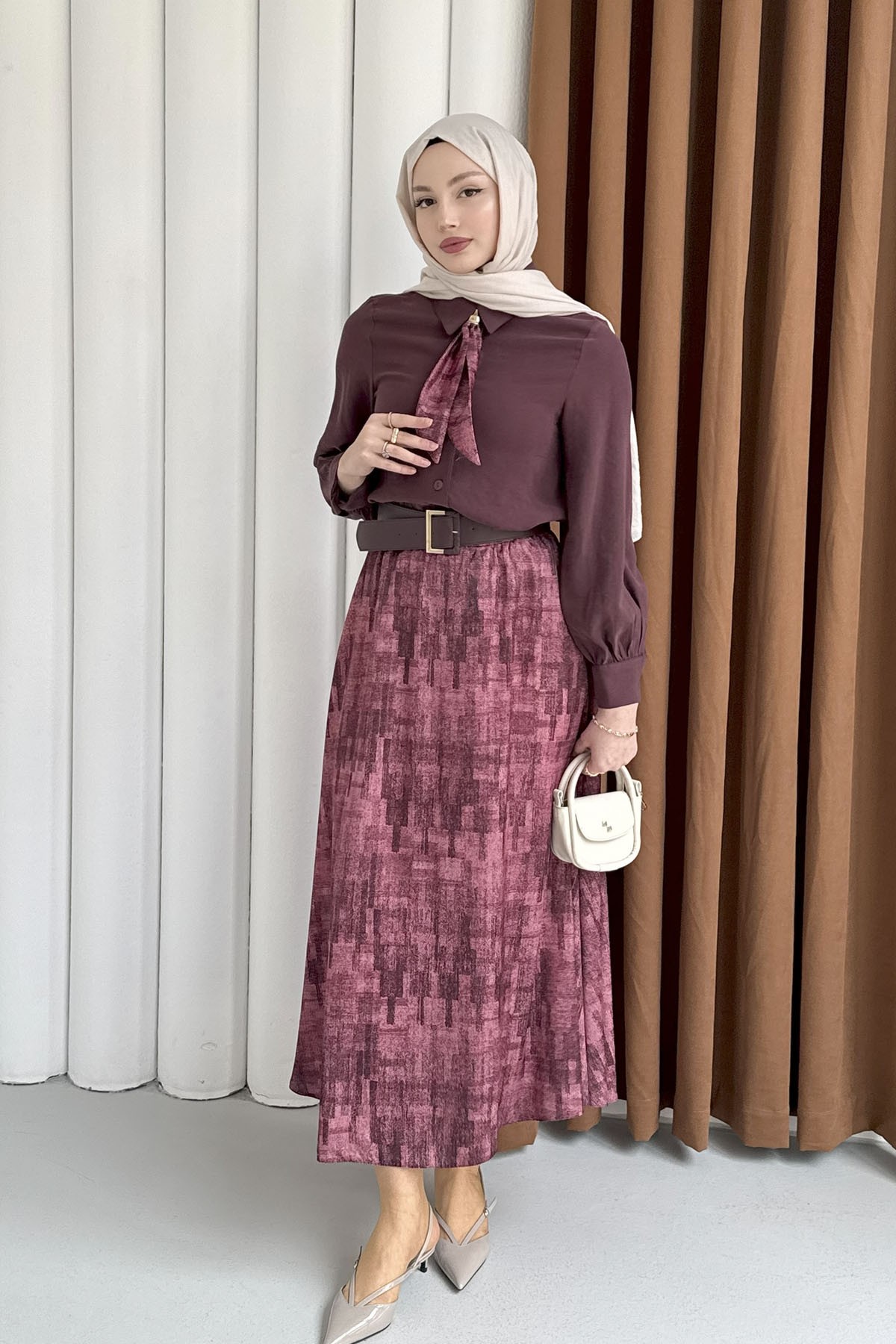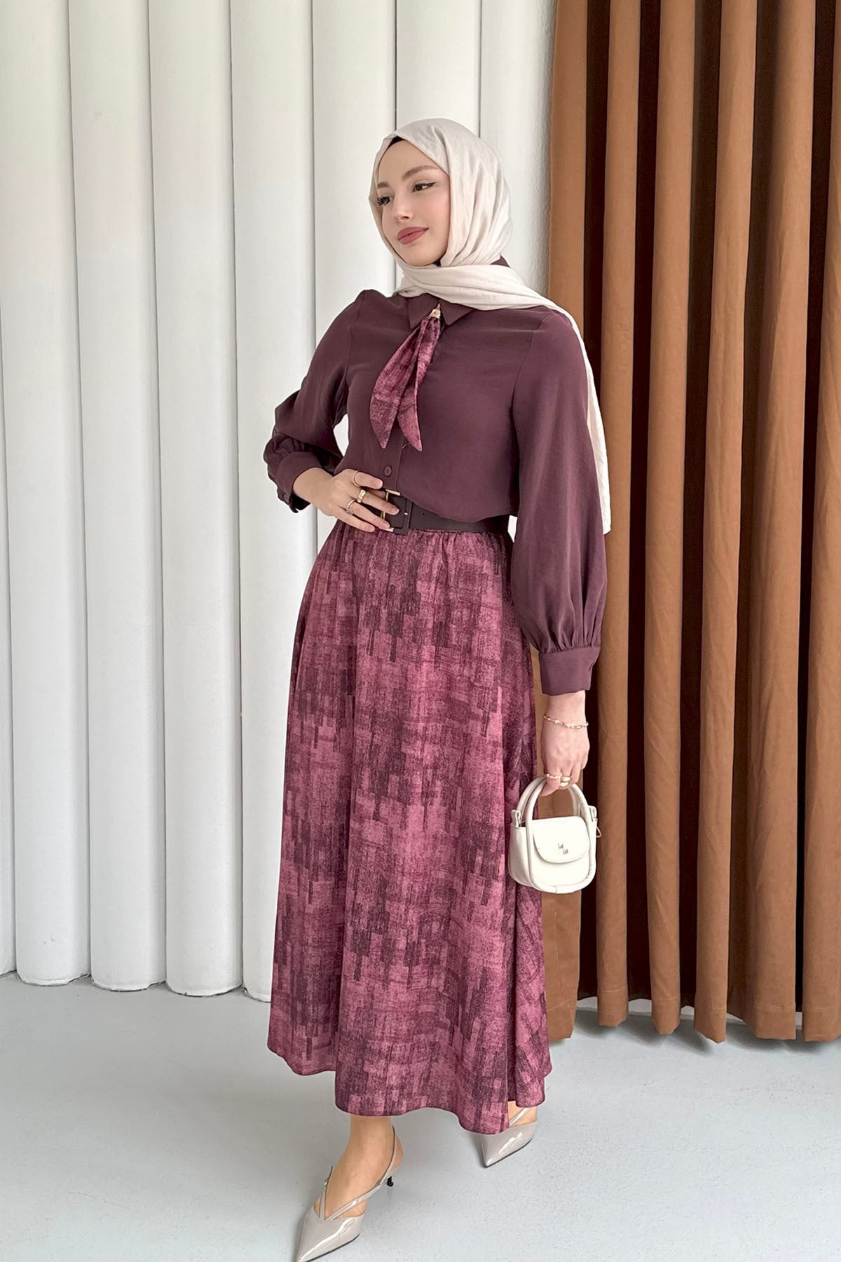 Etek Desenli Fular Yaka Tesettür Takım-BORDO (7731)