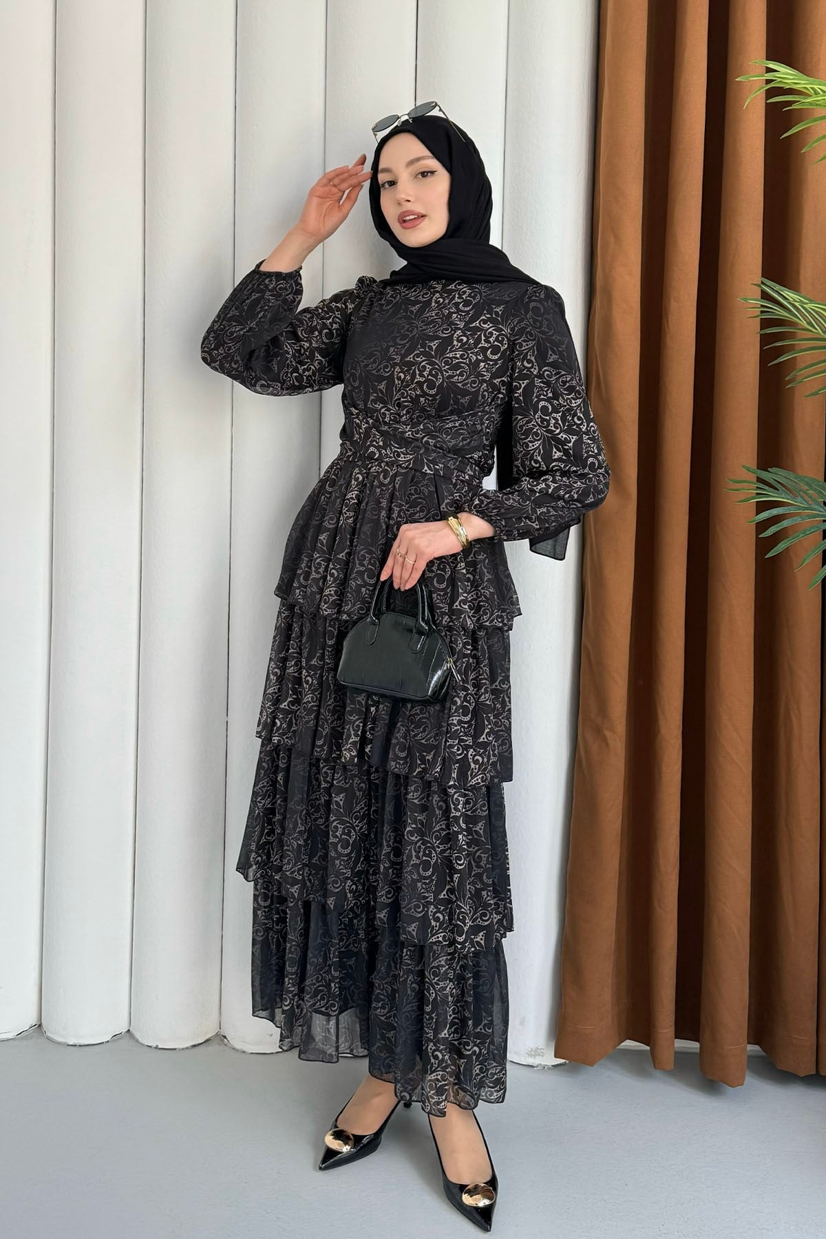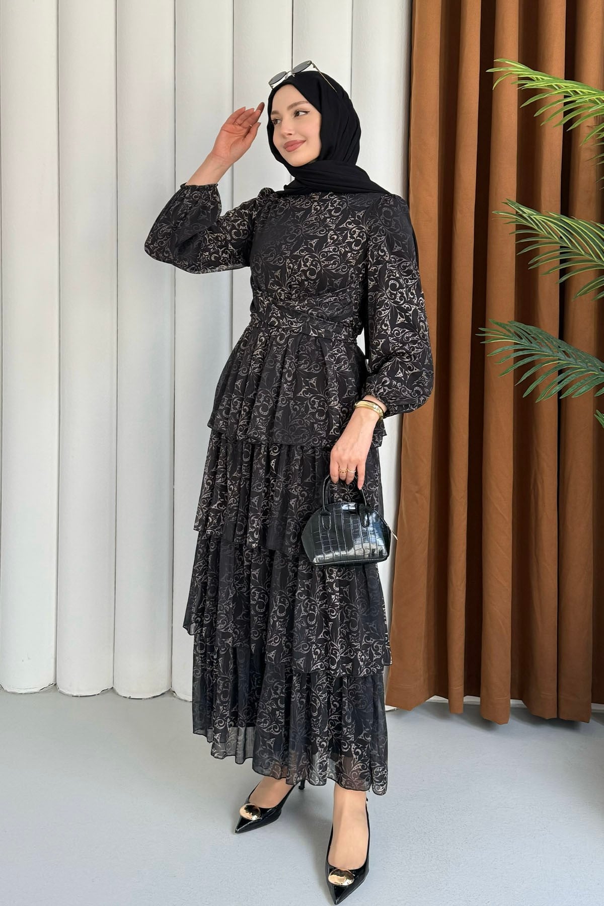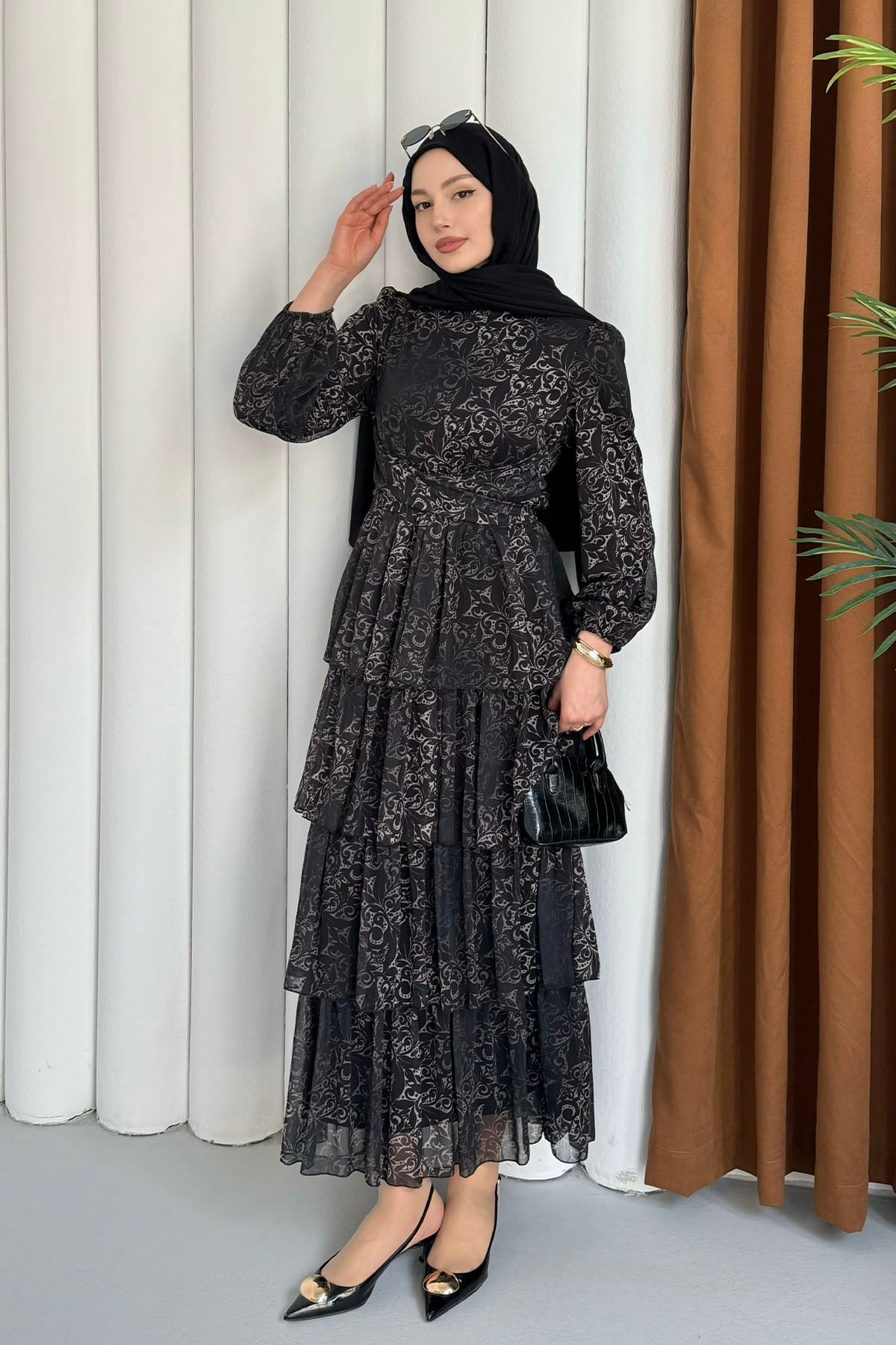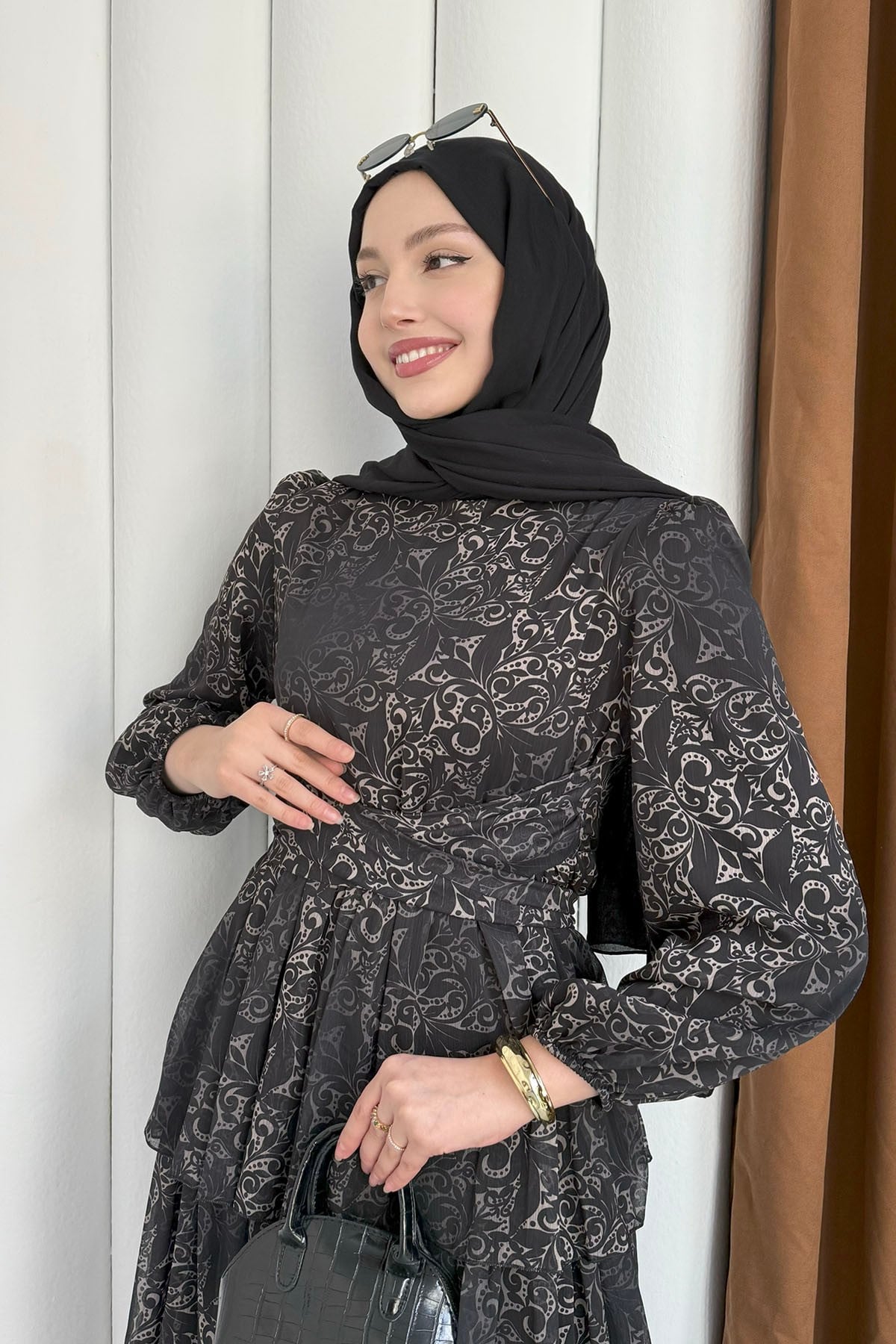 Etnik Desen Kat Katlı Şifon Tesettür Elbise-SİYAH (5983)