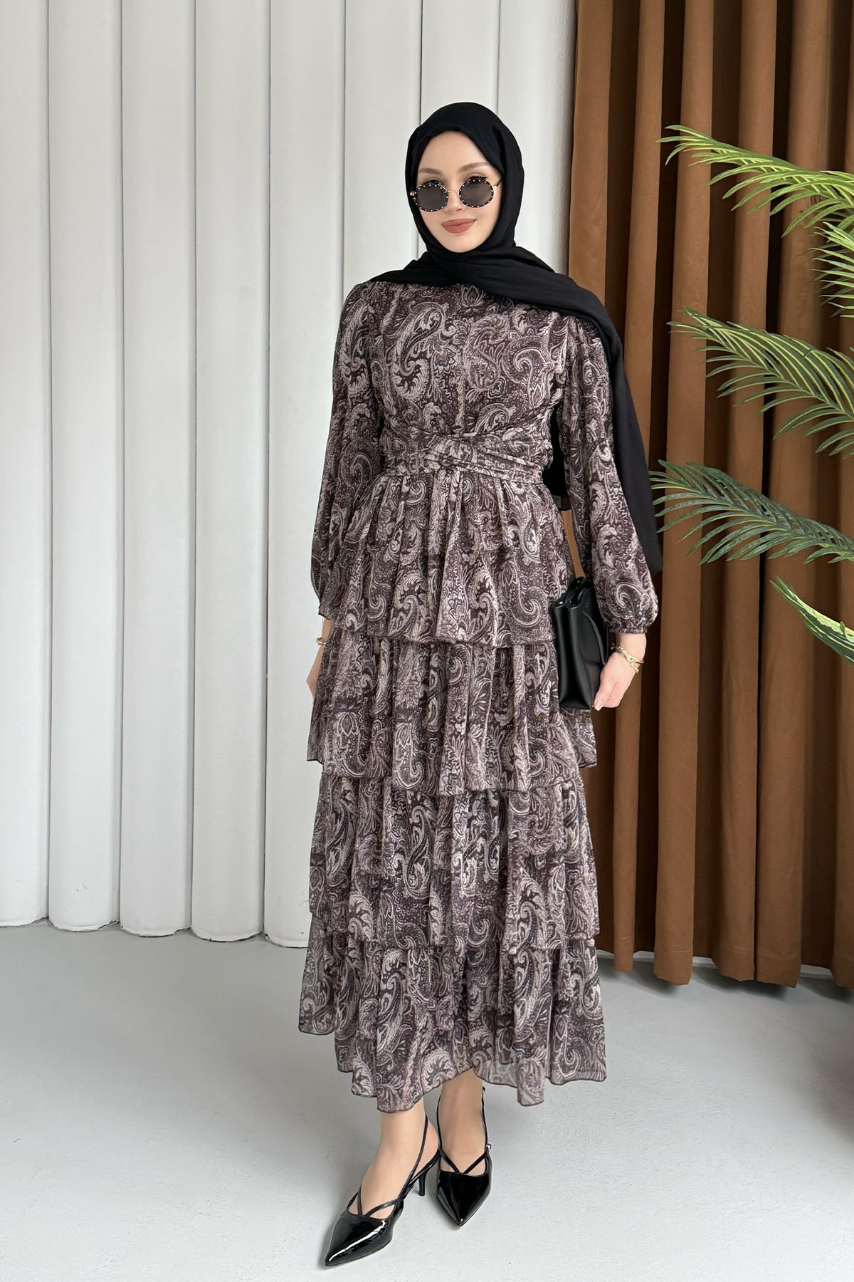 Etnik Desen Şifon Tesettür Elbise-KAHVERENGİ (5980)