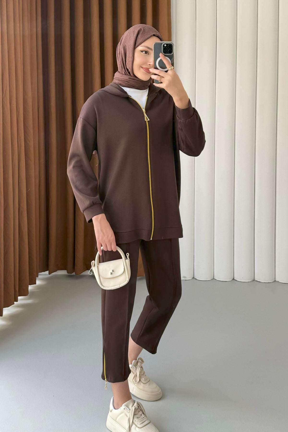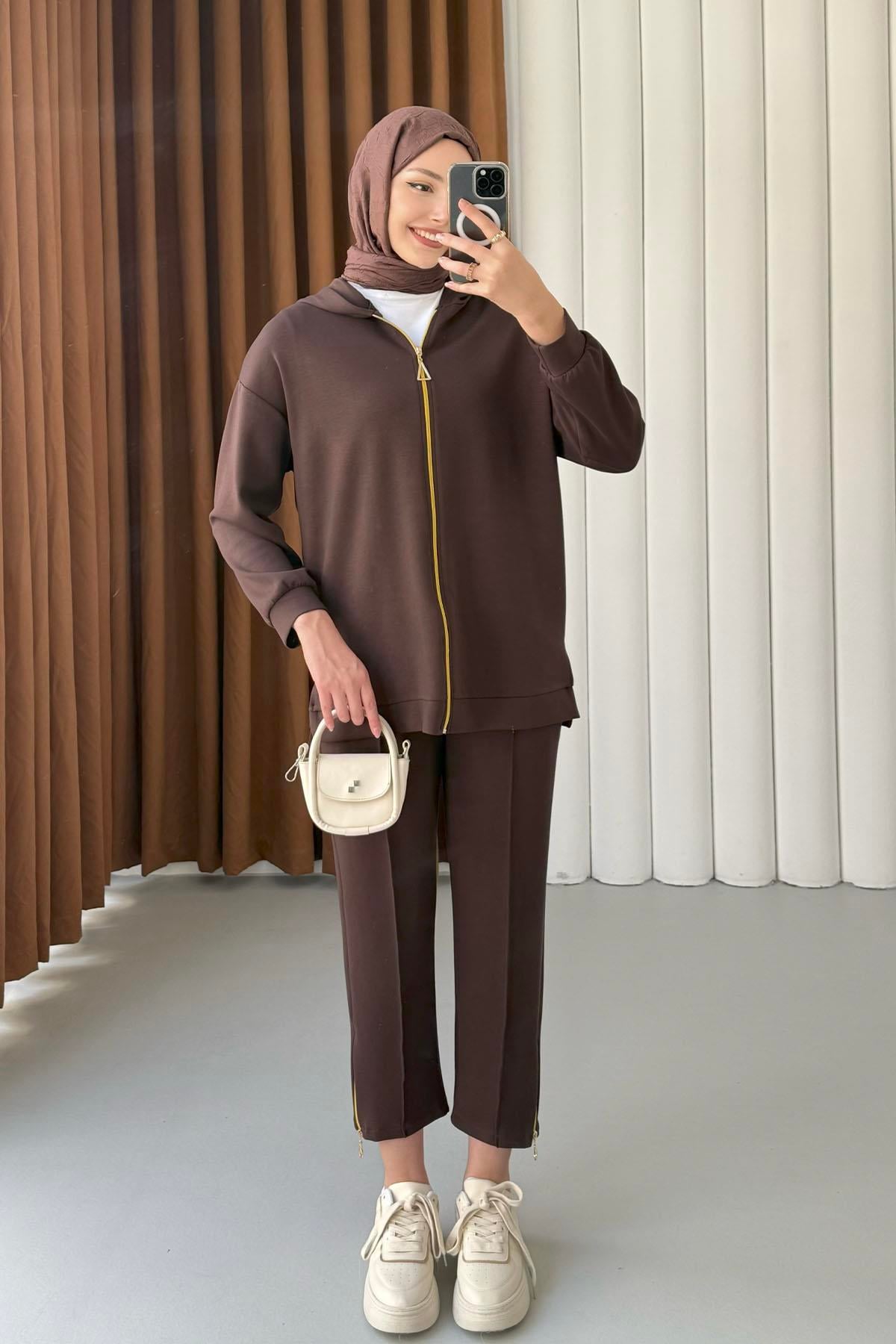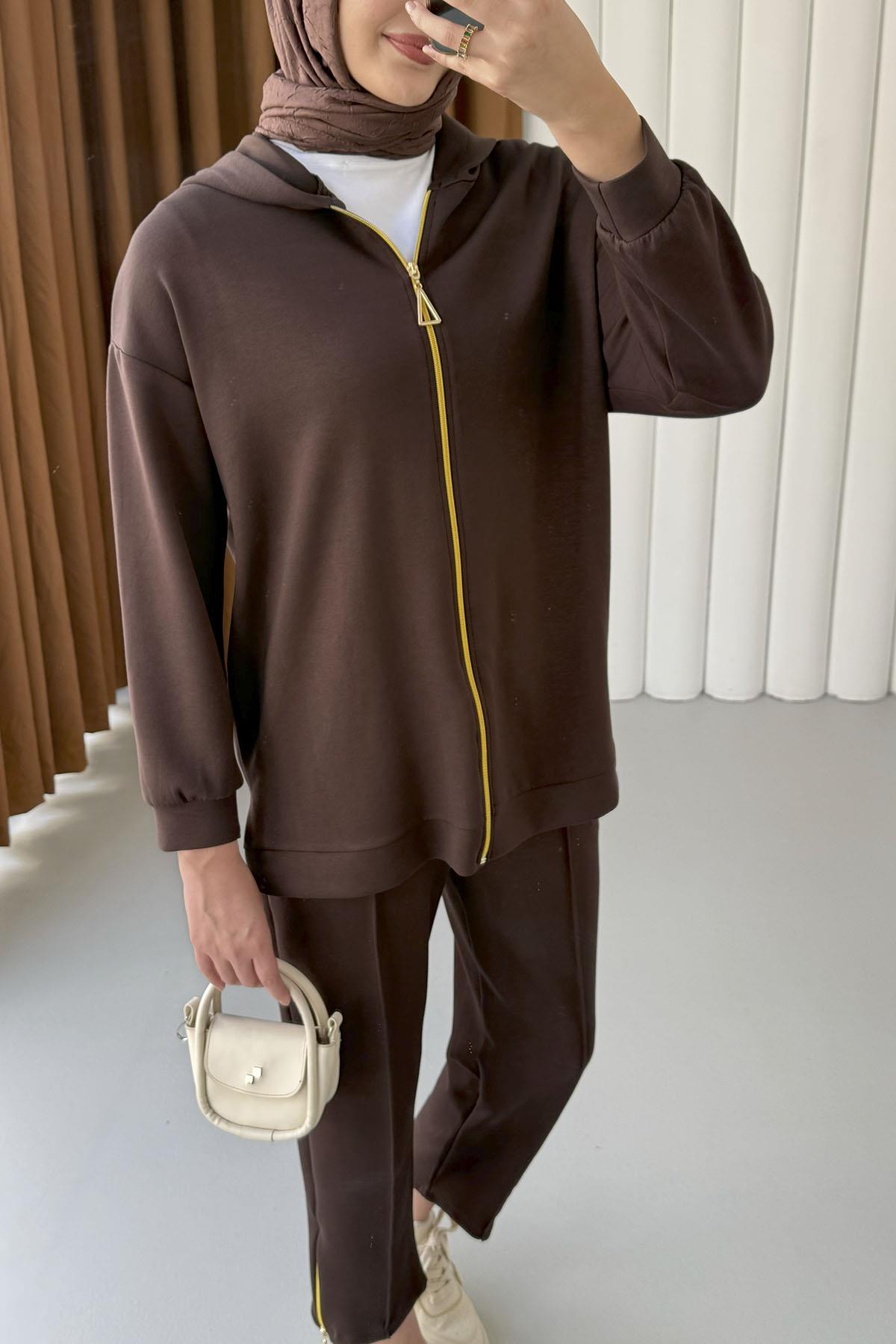 Fermuar Detaylı Oysho Kumaş Kapüşonlu Tesettür Takım-KAHVERENGİ (22750)