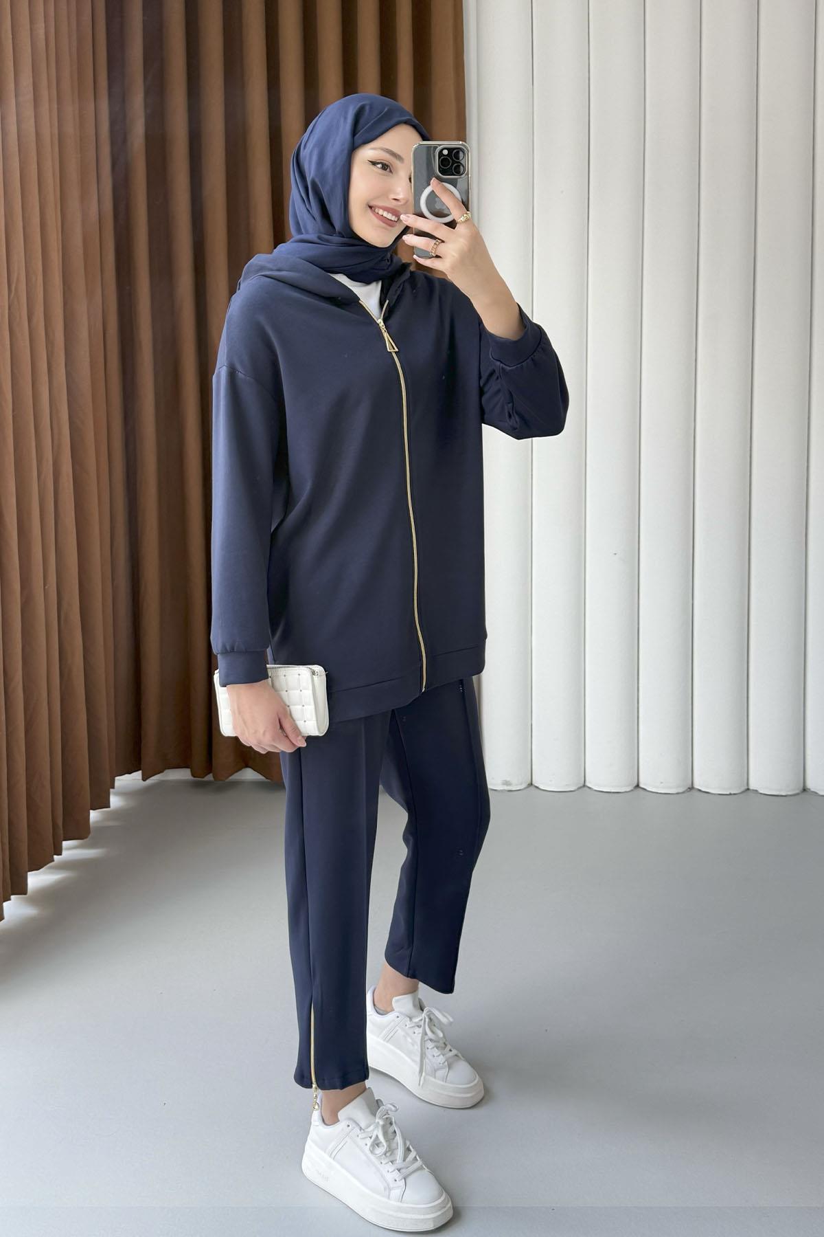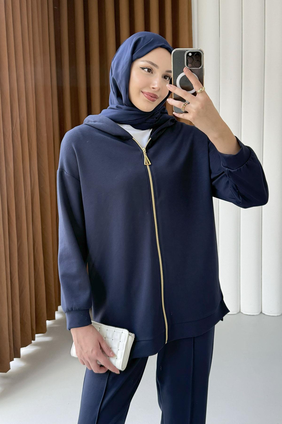 Fermuar Detaylı Oysho Kumaş Kapüşonlu Tesettür Takım-LACİVERT (22750)