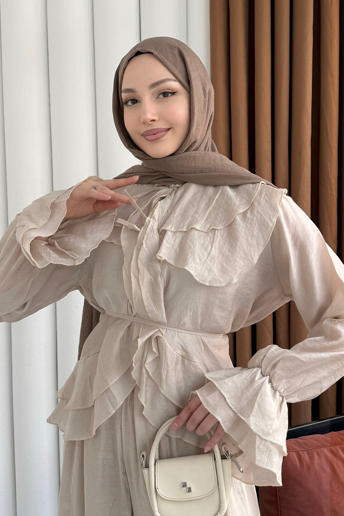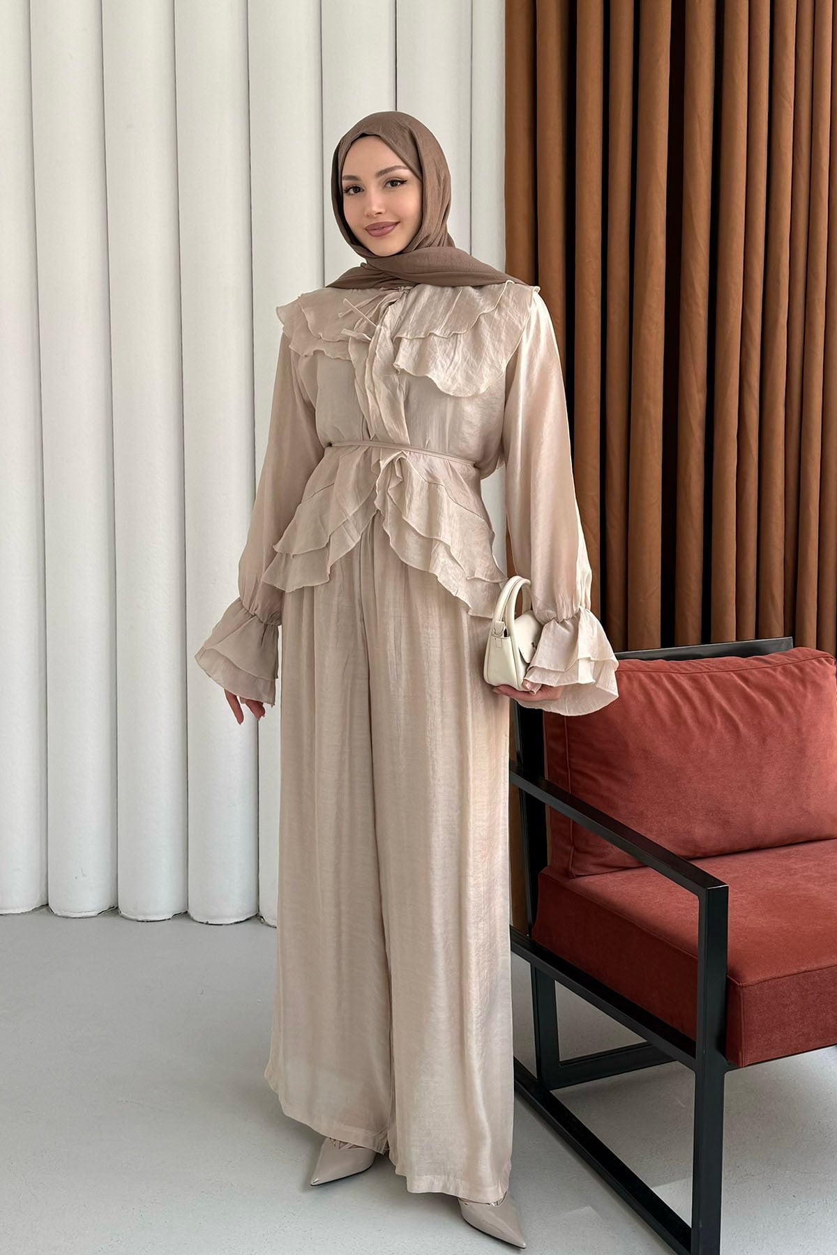 Fırfır Detaylı Bağlamalı Pantolon Tesettür Takım-TAŞ (9048)