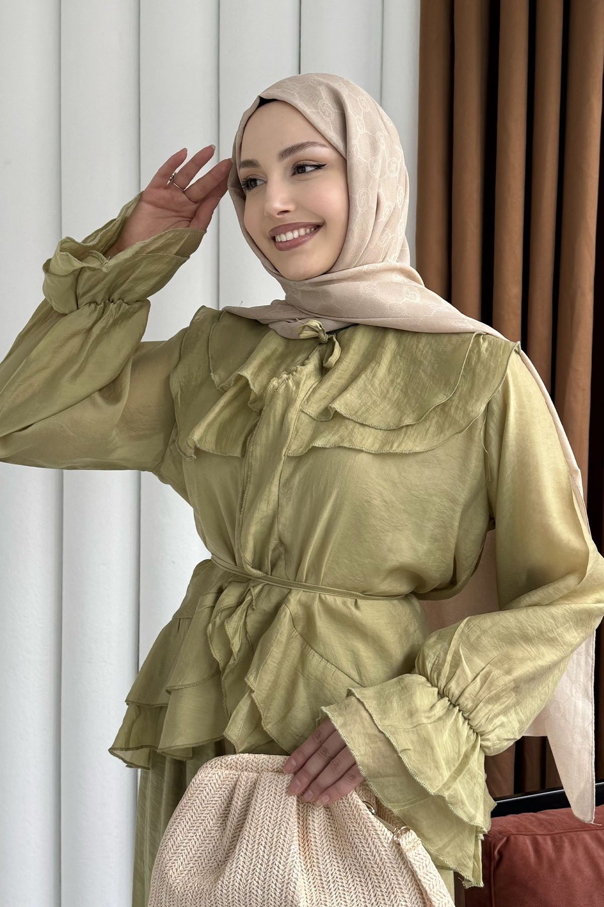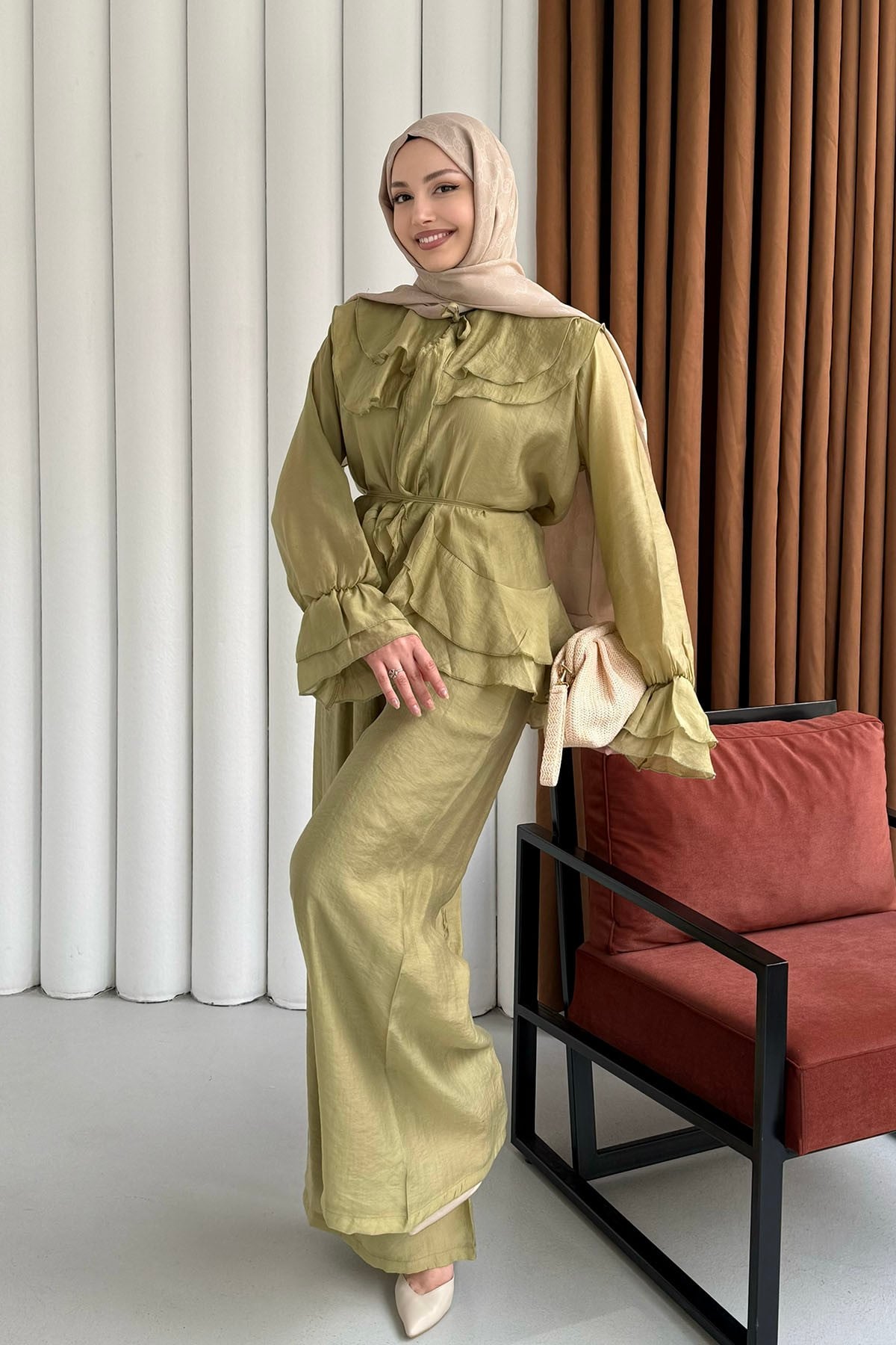 Fırfır Detaylı Bağlamalı Pantolon Tesettür Takım-YAĞ YEŞİLİ (9048)