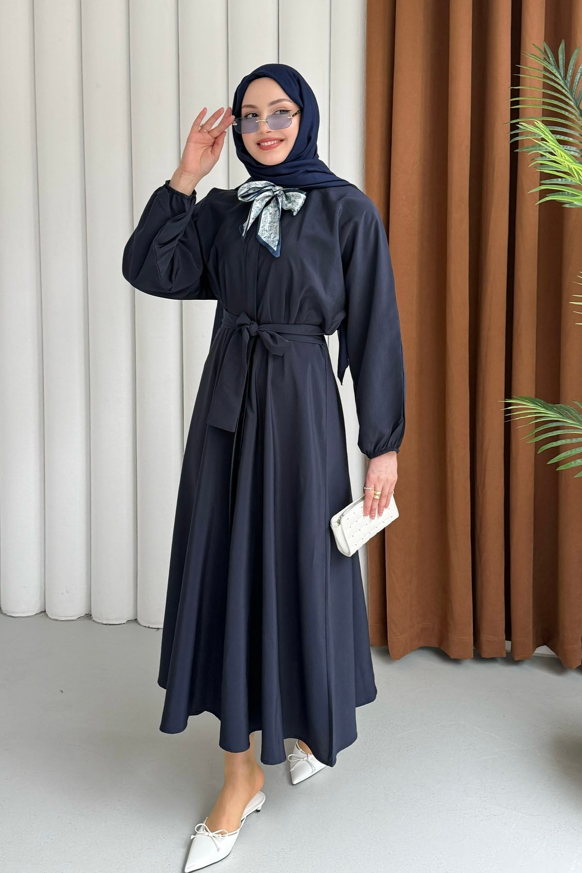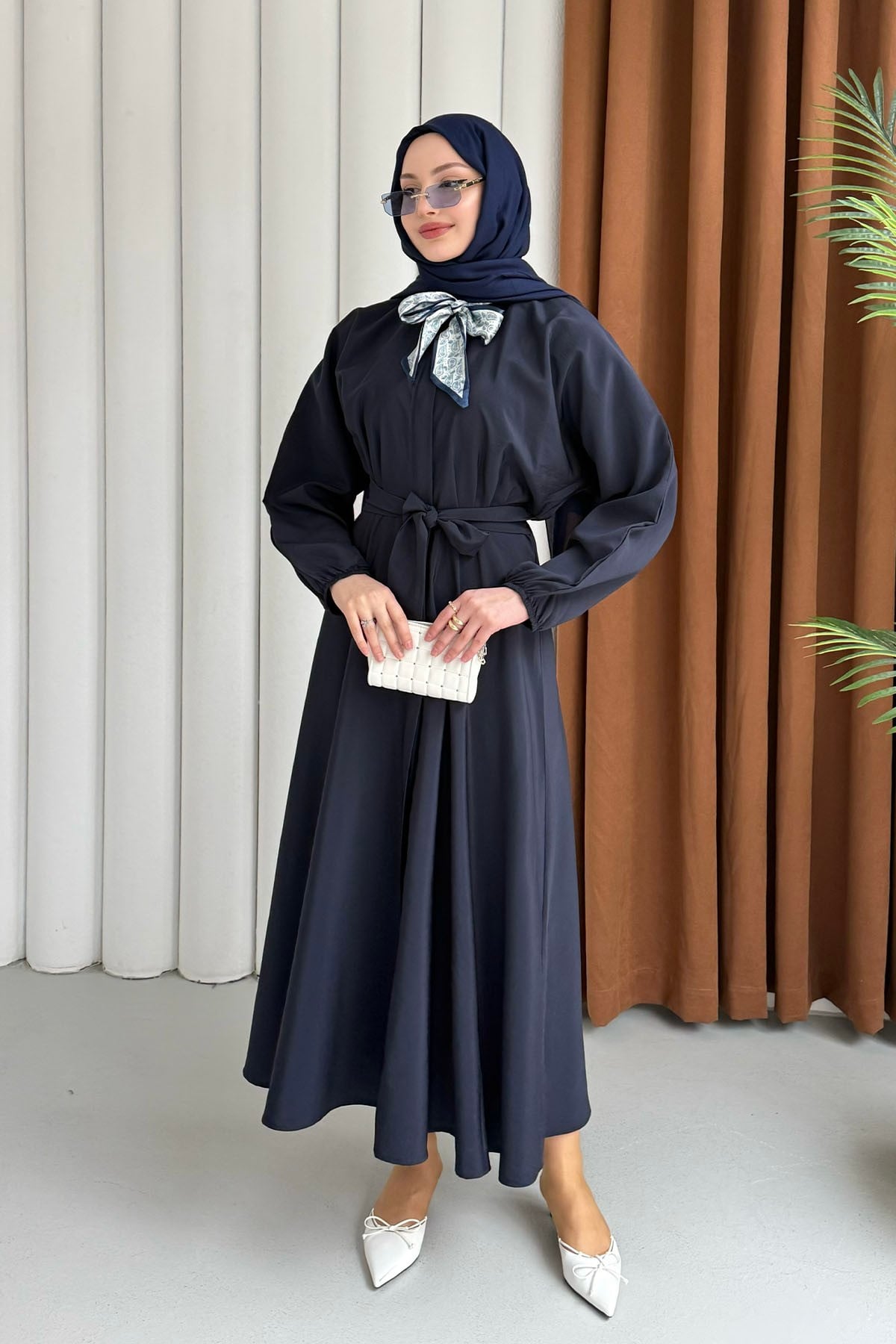 Fular Aksesuarlı Önden Düğmeli Kemerli Tesettür Elbise-LACİVERT (009)